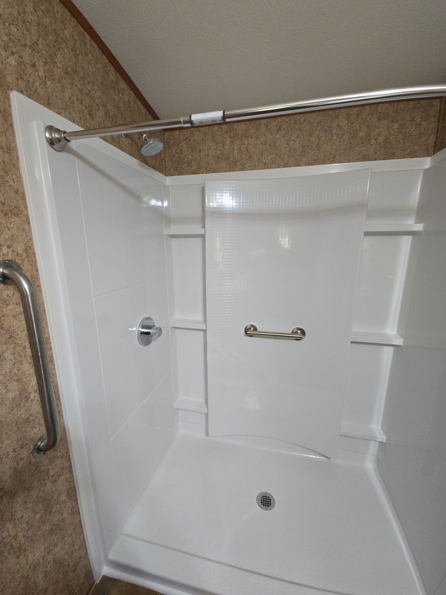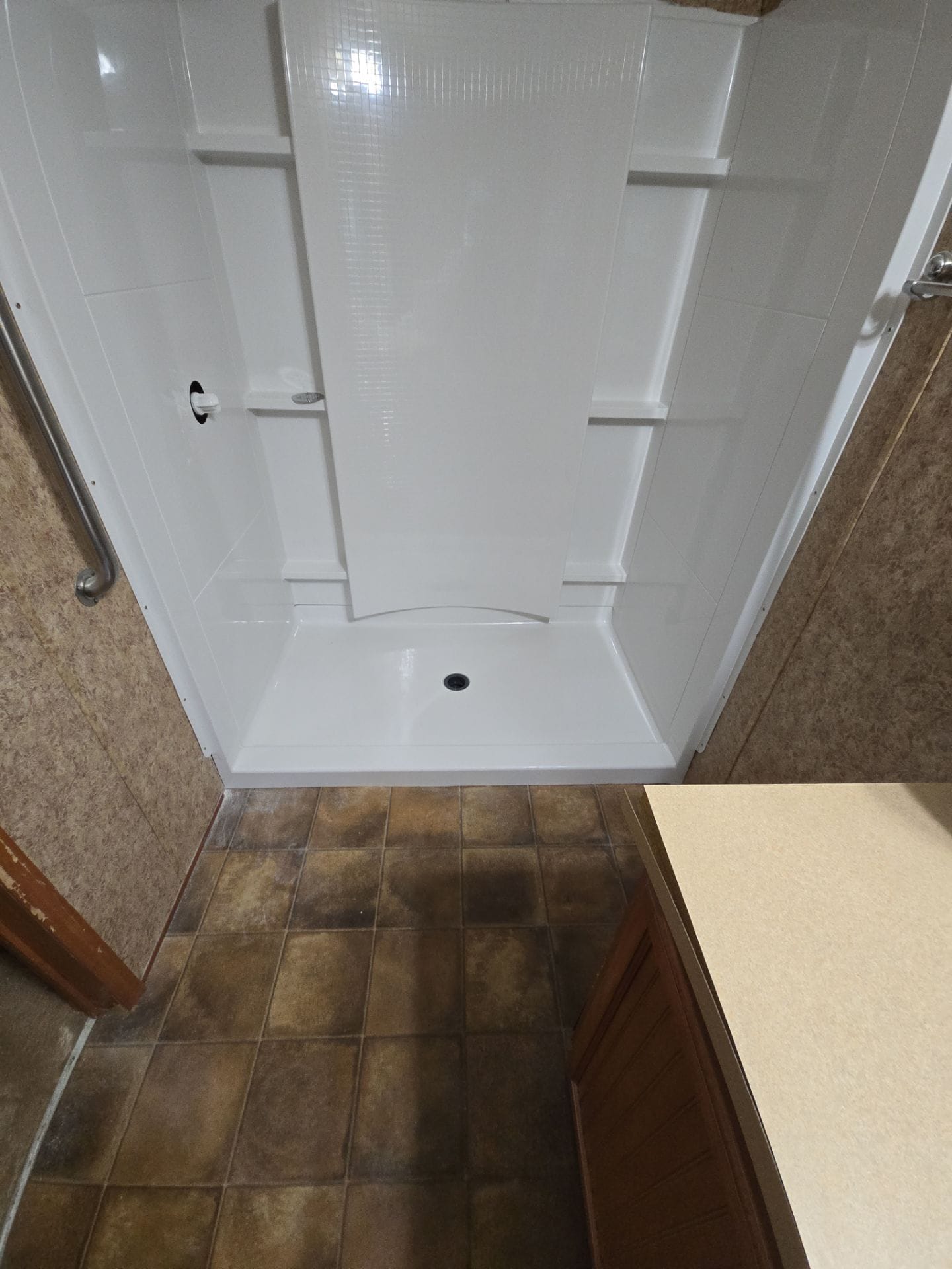 * Pre-sloped one-piece shower pan with commercial-grade silicone finishing