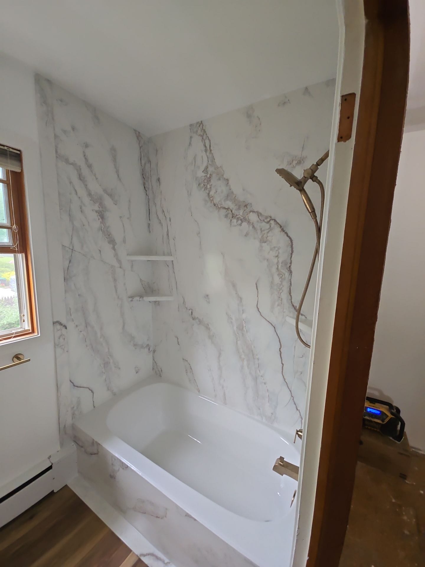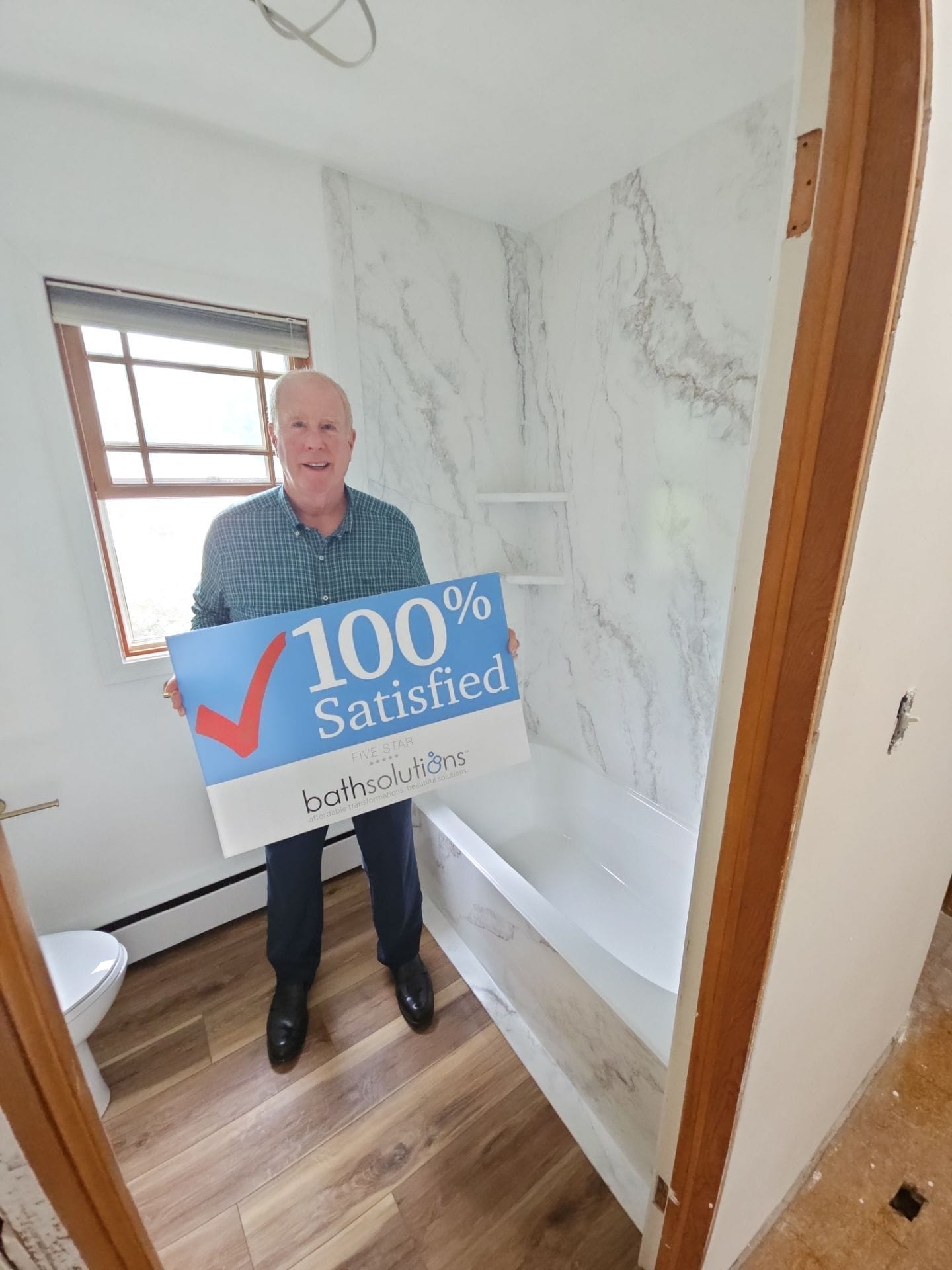 Five Star Bath Solutions offers a full lifetime warranty on its Smart Choice product line, which is transferrable without restrictions, contrasting with competitors that often limit transferability to a few months. The company provides a transparent and secure payment structure—only one-third down, with the balance due after job completion—to protect customers from the common risks of contractor abandonment. If mold or moisture issues are found during the tear-out, there’s no upcharge. Andrew emphasized their match-and-beat pricing guarantee if a customer finds an equal product and service offering elsewhere. Final selections included Calacatta-style marble composite wall panels, wood-look plank flooring, two integrated corner shelves, a handheld bronze fixture set, and preparation for frameless clear glass enclosure installation.