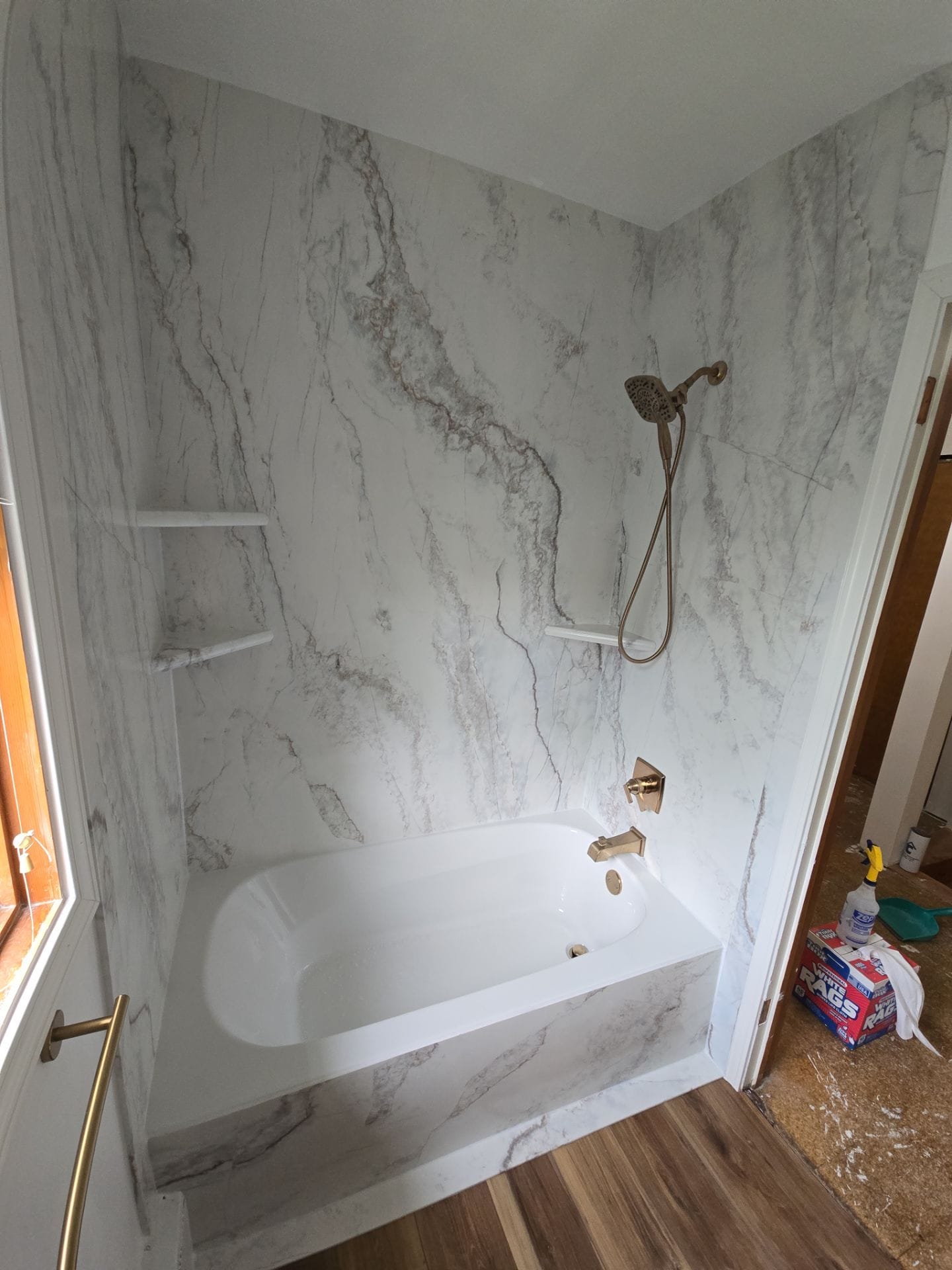 * Calacatta-style wall panels with wood-look plank flooring