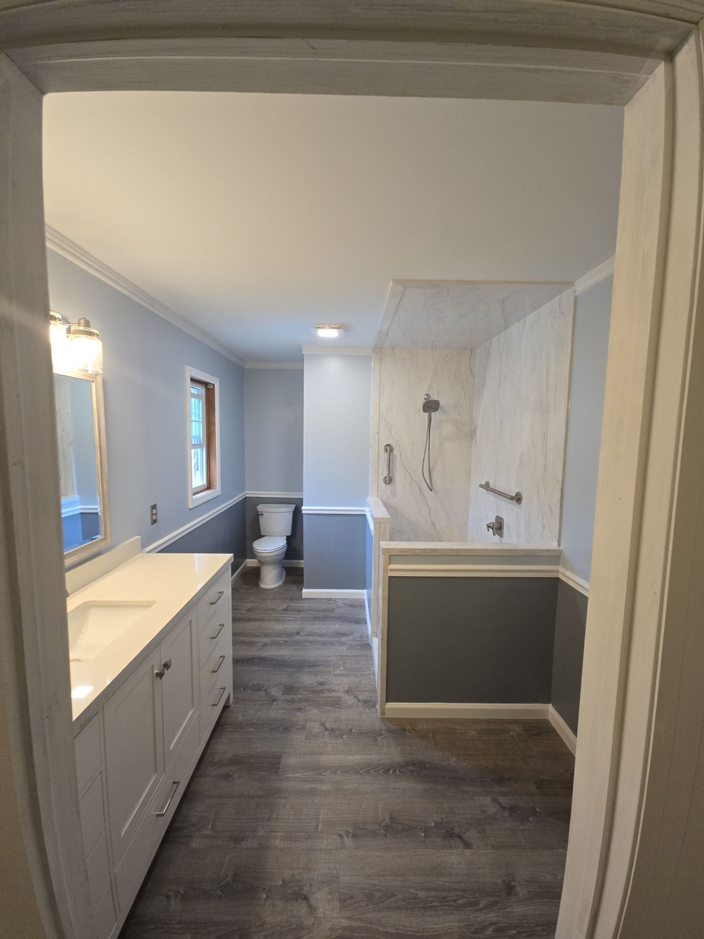 The final remodel included a frameless fixed glass panel on both ends with open entry, eliminating the original curtain setup. A low-threshold shower base replaced the tub, paired with full wall and ceiling coverage using marble-style panels with soft veining. Two grab bars were installed, one vertical and one horizontal, along with a wall-mounted handheld showerhead for flexibility. A triangular corner bench added seated comfort without occupying excess space. Flooring was replaced with wide-plank wood-look vinyl, contributing to a more refined, coordinated space. The upgraded vanity and lighting completed the transitional look.