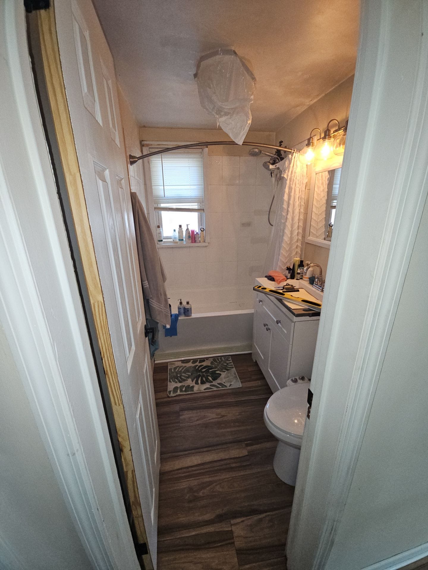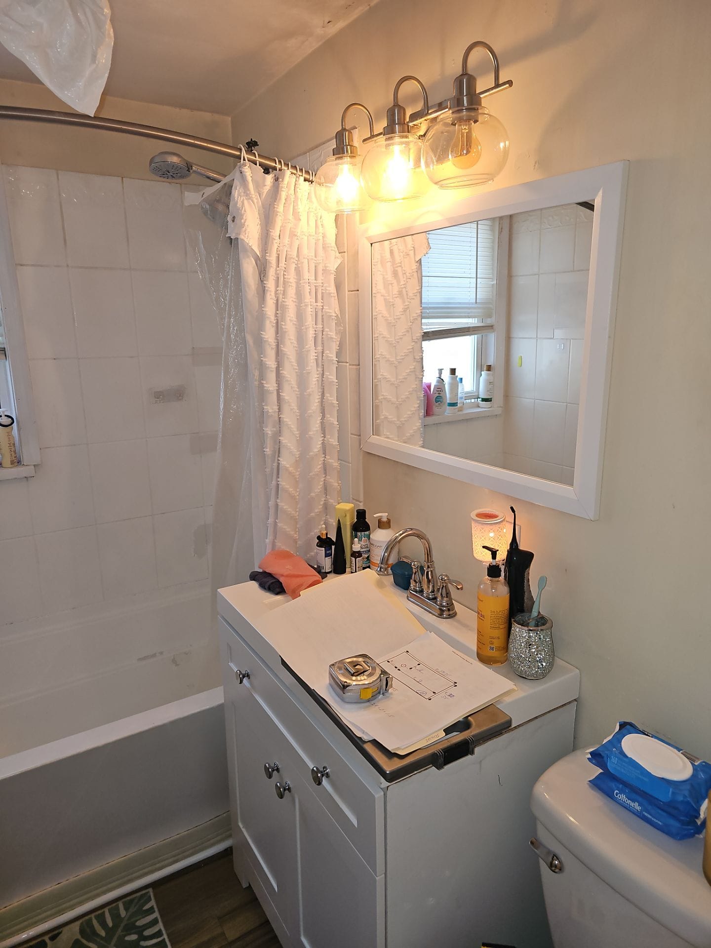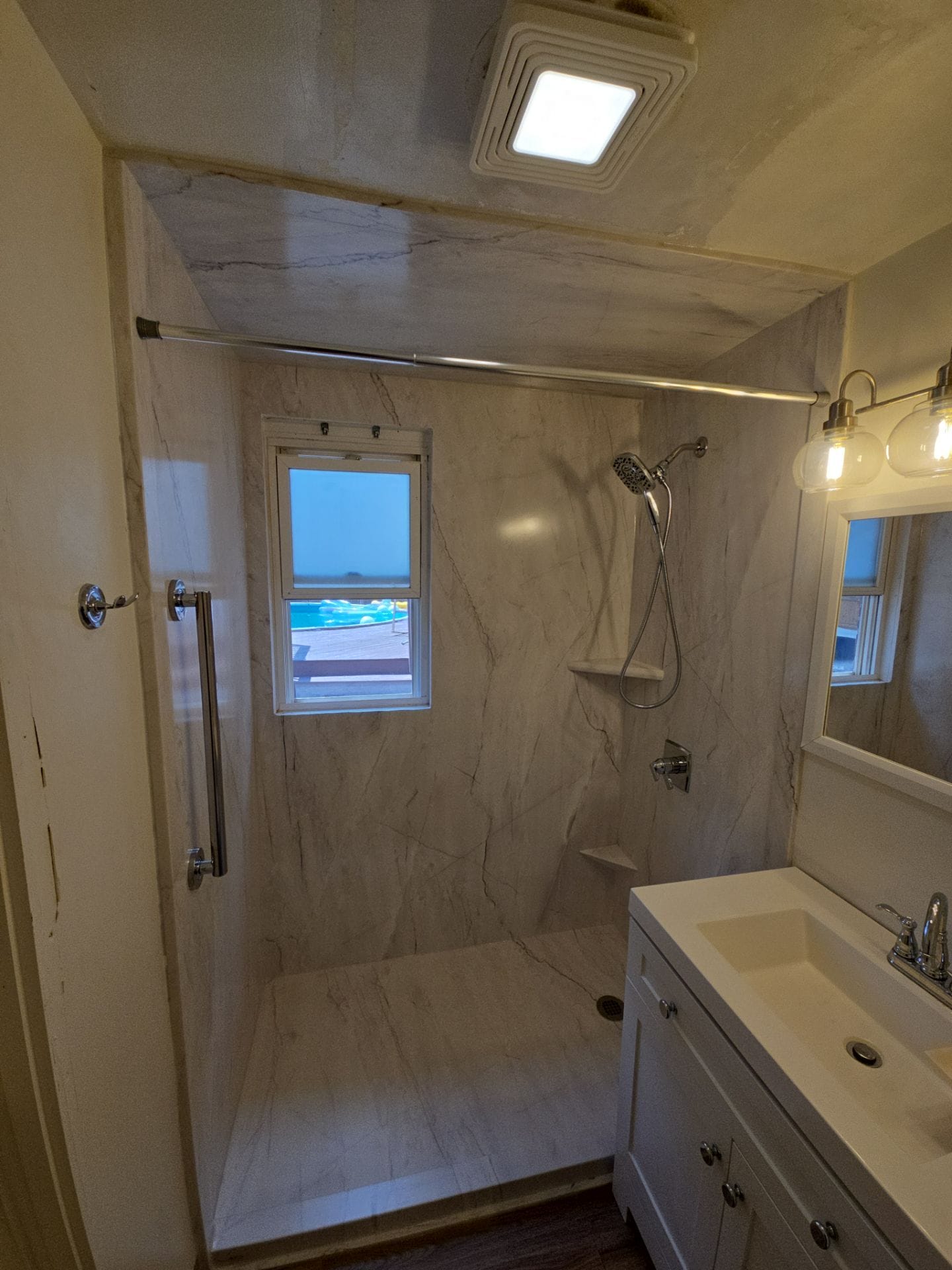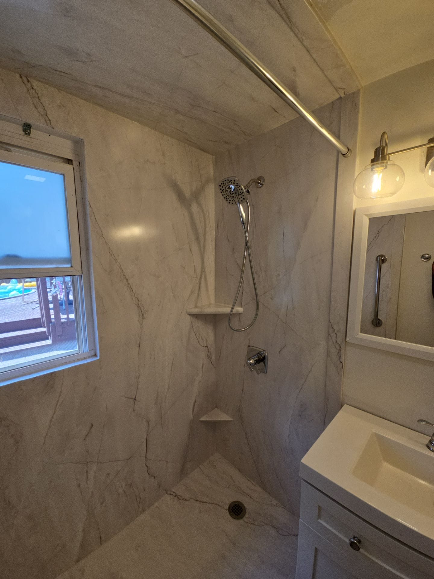 The remodel replaced the tub with a low-threshold walk-in shower pan. Smart Choice wall panels in a light marble pattern were installed from floor to ceiling, including the angled ceiling surface. A brushed nickel shower system with a matching handheld showerhead was added, along with a minimal two-corner shelf layout. A single vertical grab bar was mounted securely along the entry wall. The previous dark fixtures and rain glass door mentioned in the review were not used; instead, the finished space uses brushed nickel hardware and a standard curved curtain rod for entry. Flooring and vanity remained unchanged, and all surfaces around the new shower were sealed with antimicrobial silicone.