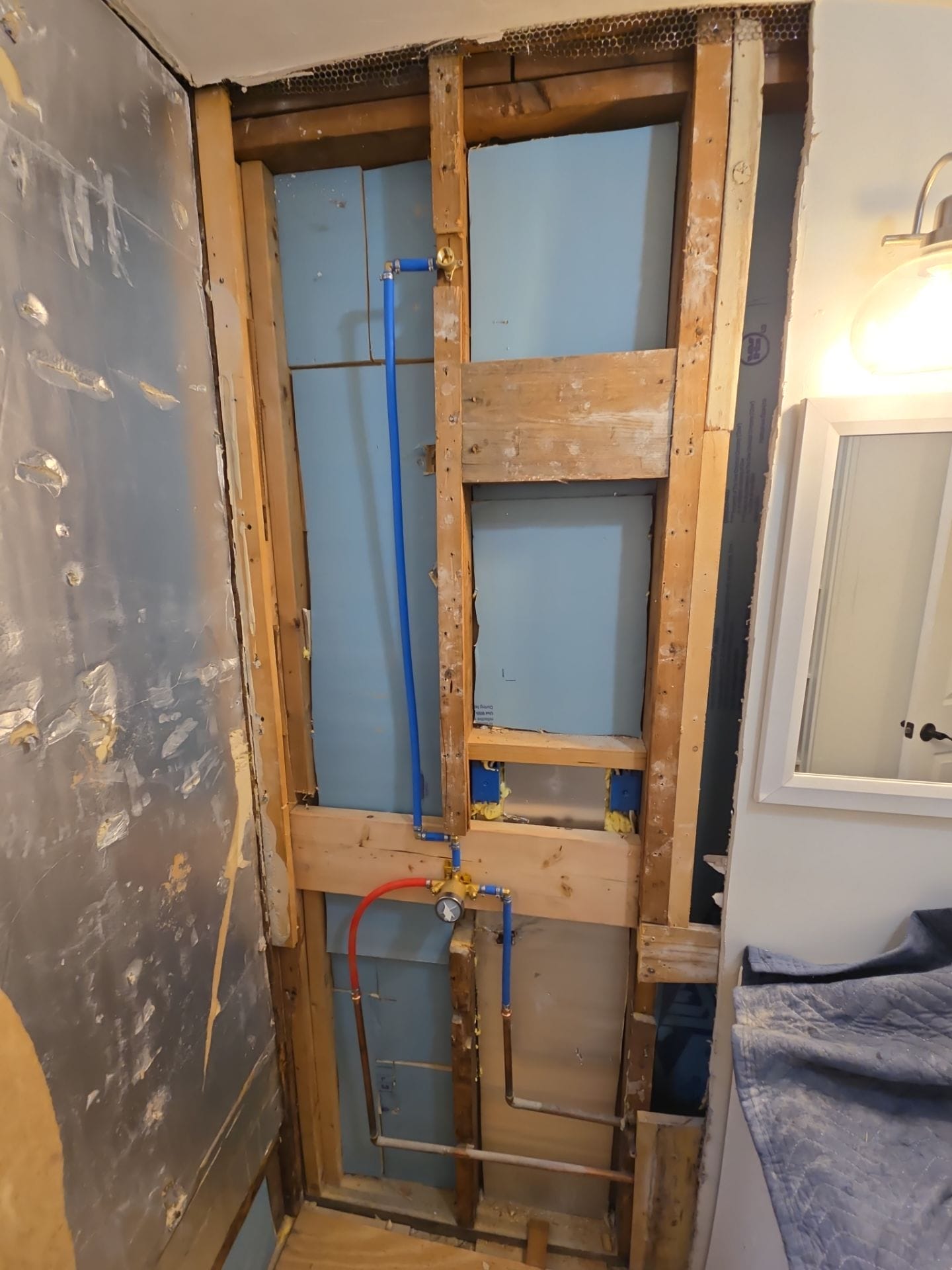 Installation included full demo to the studs, plumbing replacement, and all required structural backing. The two-day timeline was met, and the customer was offered flexible install scheduling, including unattended entry if needed. Andrew noted that all work was completed by in-house installers with over 25 years of combined experience. The glass door mentioned in the review was not part of the actual build.