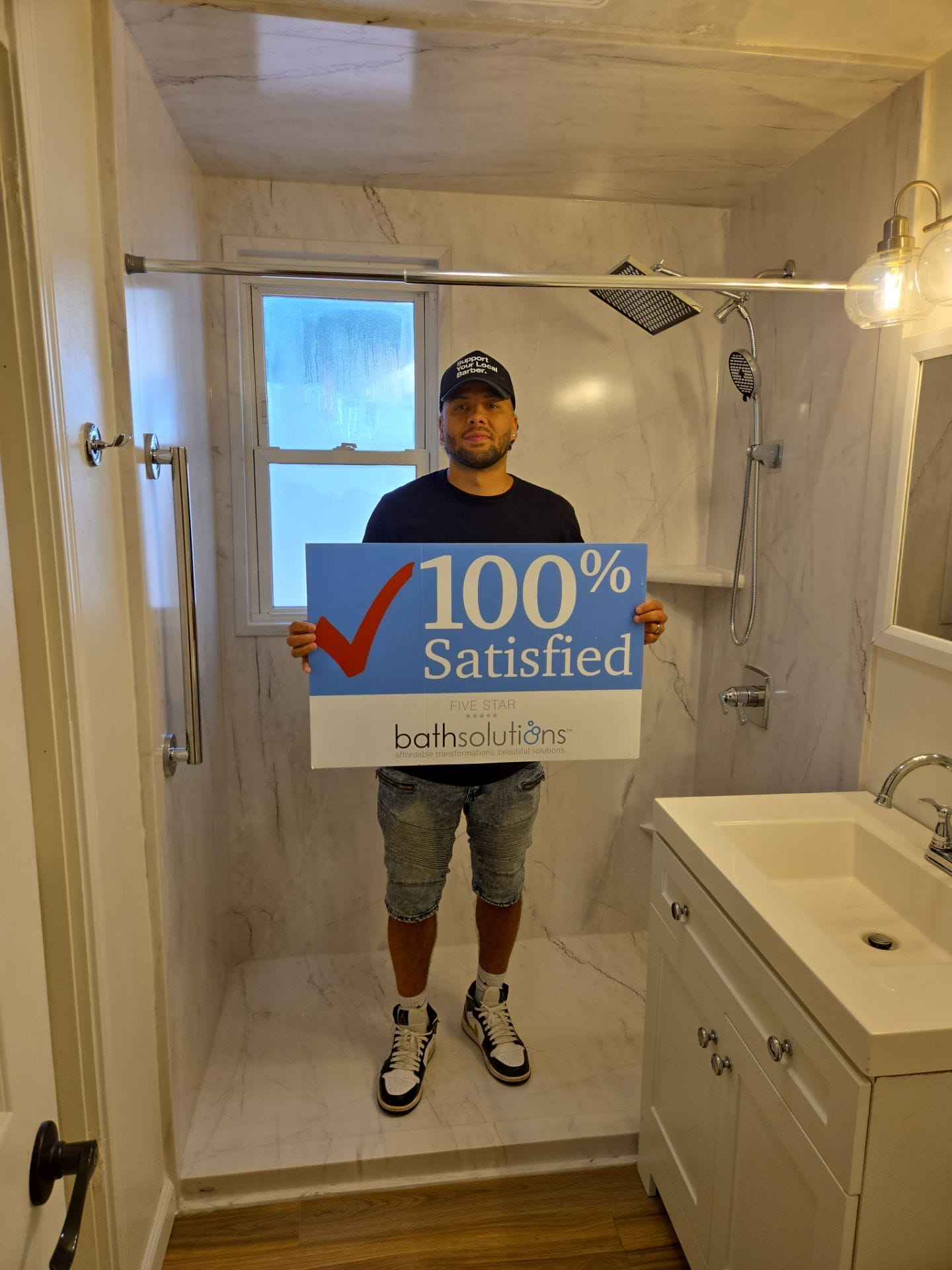 Andrew Davidson from Five Star Bath Solutions led the customer through the Smart Choice upgrade process. The system features a six-layer PVC composite wall system backed by a waterproof, non-organic board that resists mold and delamination. Andrew demonstrated how the large-format panels reduce seams, enhance cleaning ease, and resist scratches or fading. The customer selected a light-toned gray-beige veined marble finish to keep the space bright and cohesive. An optional ceiling panel was included at no cost to provide a fully sealed finish across the enclosure.