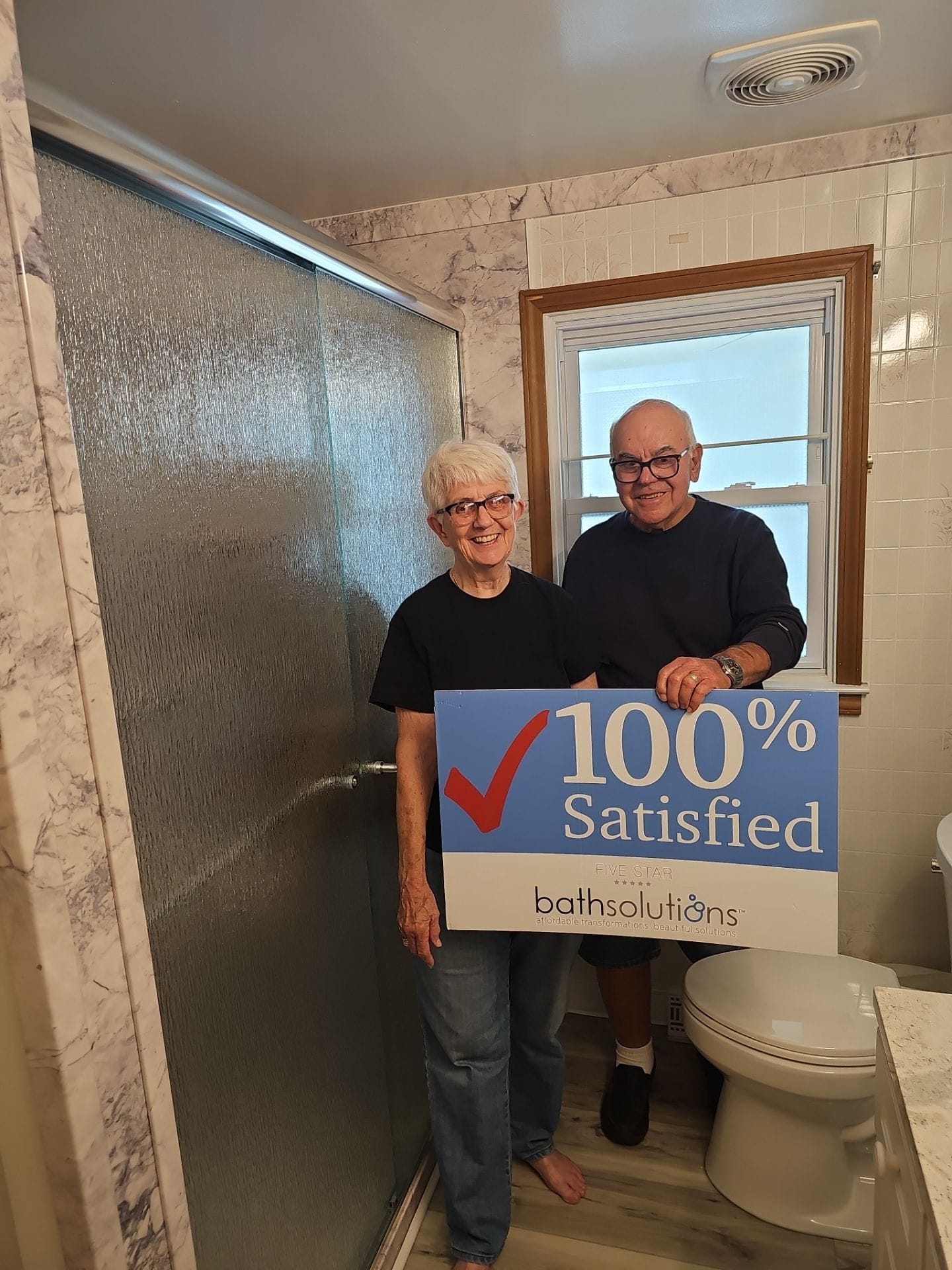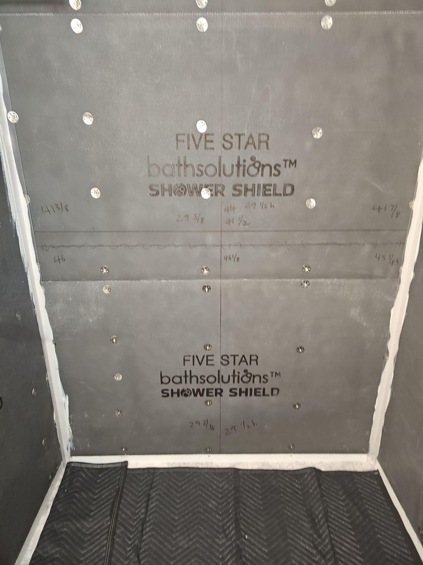 The Five Star Bath Solutions representative recommended the Smart Choice package for its antimicrobial, scratch-resistant wall panels and fully waterproof ShowerShield backer board. The six-layer composite wall system eliminates grout lines and requires no future re-caulking thanks to marine-grade silicone. Visual previews were shown using 3D modeling and physical samples to guide decisions on fixture finishes, bench type, and shelving placement.