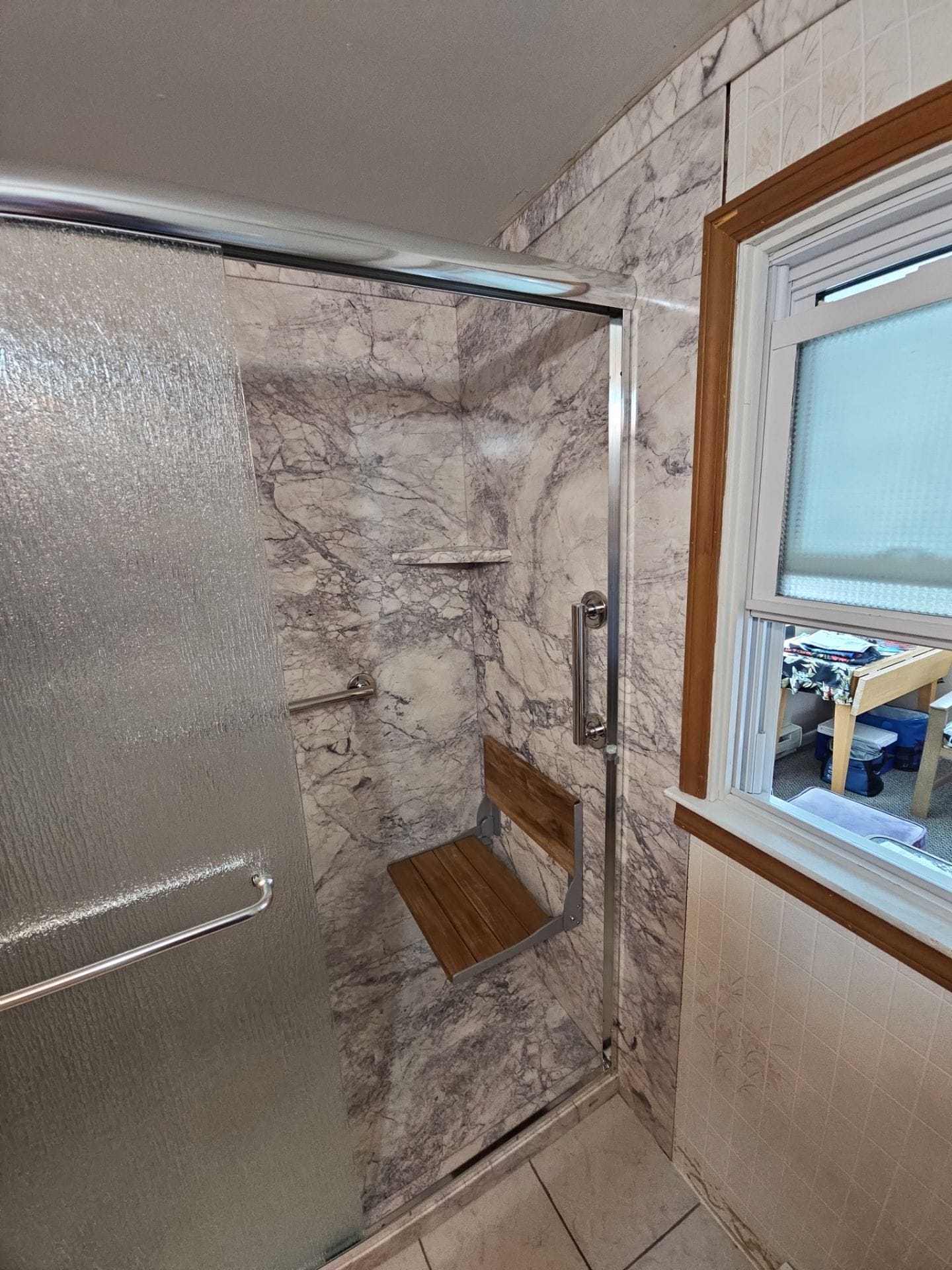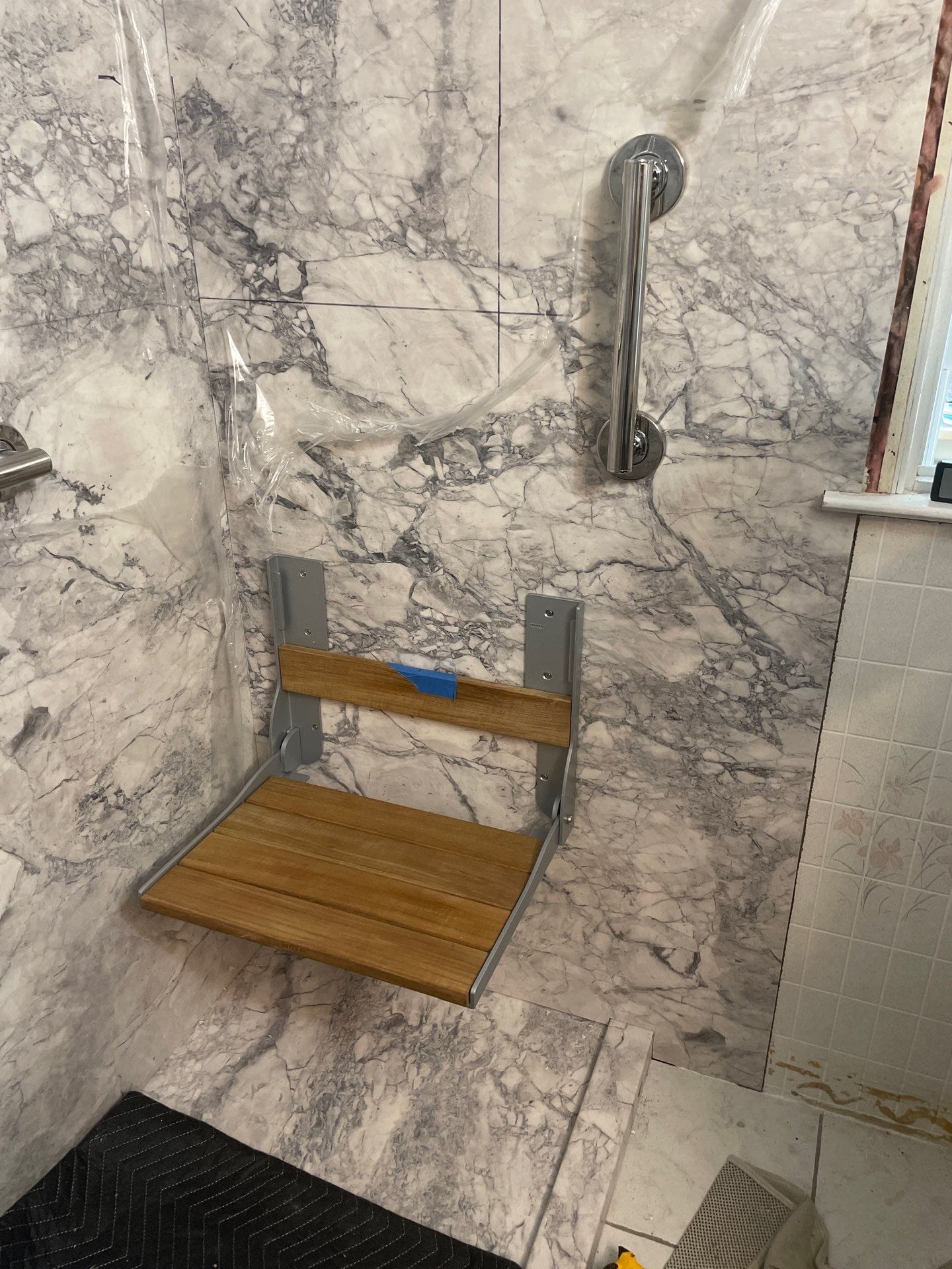 The remodel replaced the older alcove tub system and standard surround with a walk-in shower clad in composite stone-look panels. The chosen finish featured a tan-gray marbled pattern that blended with the existing tile flooring and white countertops. New components included a handheld chrome showerhead on a fixed arm, a single corner shelf, two grab bars—one vertical near the entrance and one horizontal on the back wall—and a fold-down teak seat mounted securely to the wall. The enclosure was completed with a barn-style sliding glass door in chrome, offering smooth access and high visibility while maintaining privacy with textured panels.