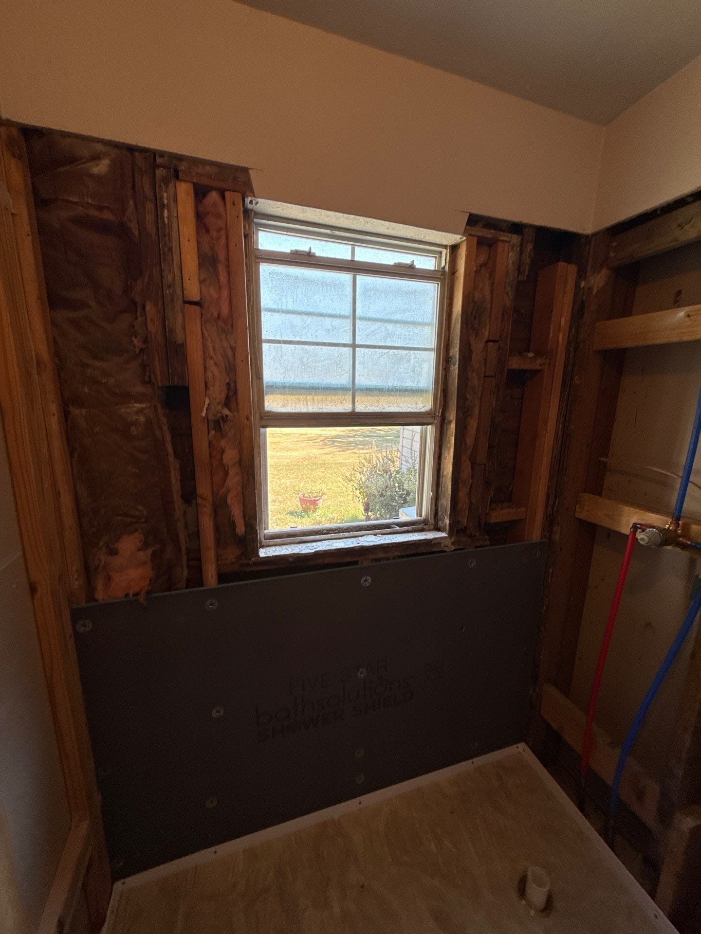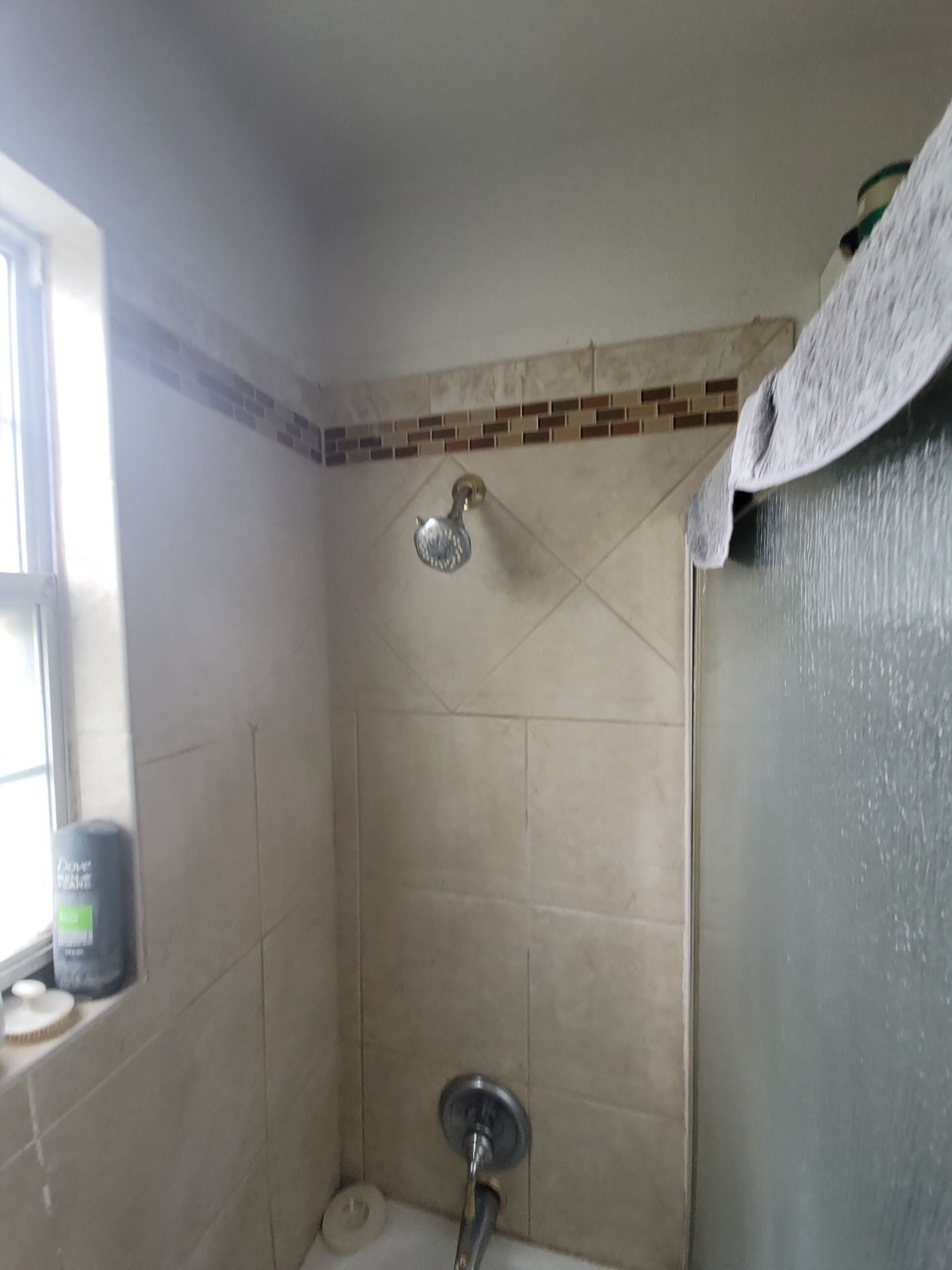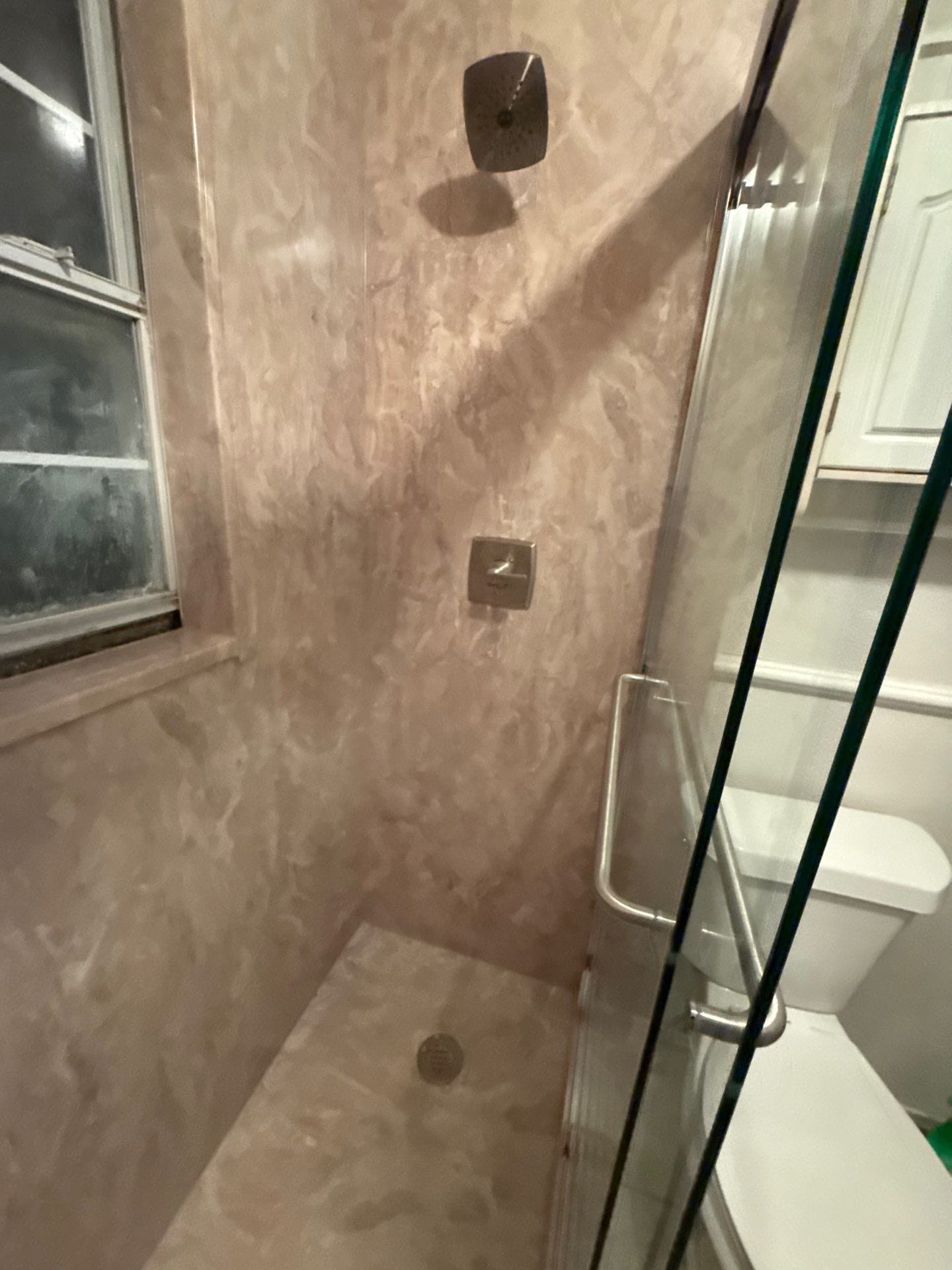 Installation followed a complete teardown approach, including stud-to-stud removal and mold/moisture inspection. The team reinforced walls for hardware support, addressed all plumbing needs, and installed a new subfloor and slip-resistant pan. Wall panels in a light marbled pattern replaced the previous tile and mosaic band, paired with a frameless sliding glass door. Finishing details included the angled grab bar, corner shelving, and fixtures consistent with the customer's request for a cleaner, modern appearance.