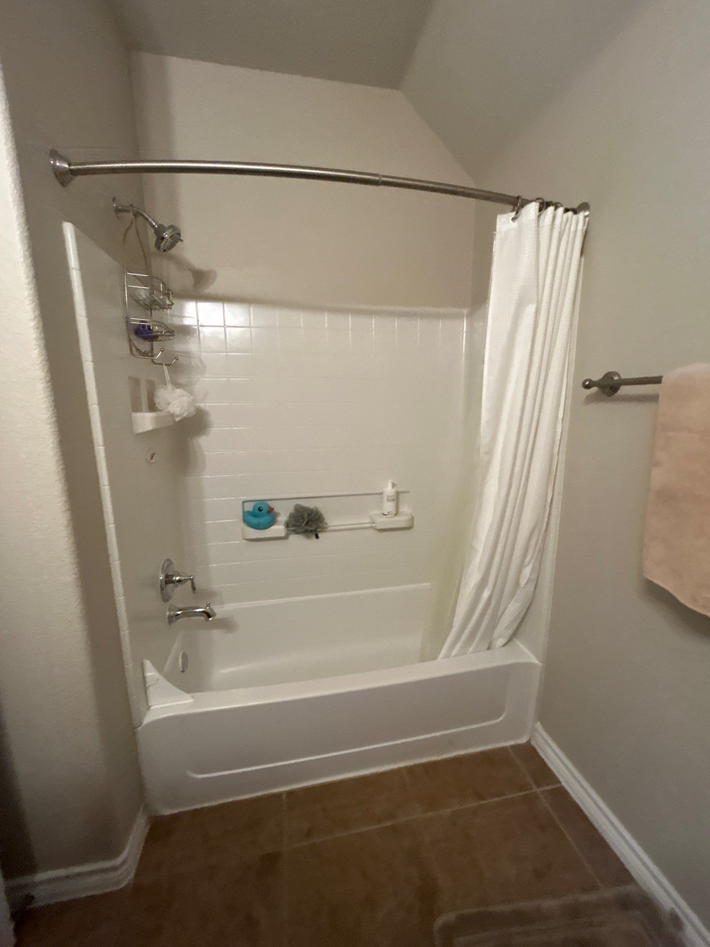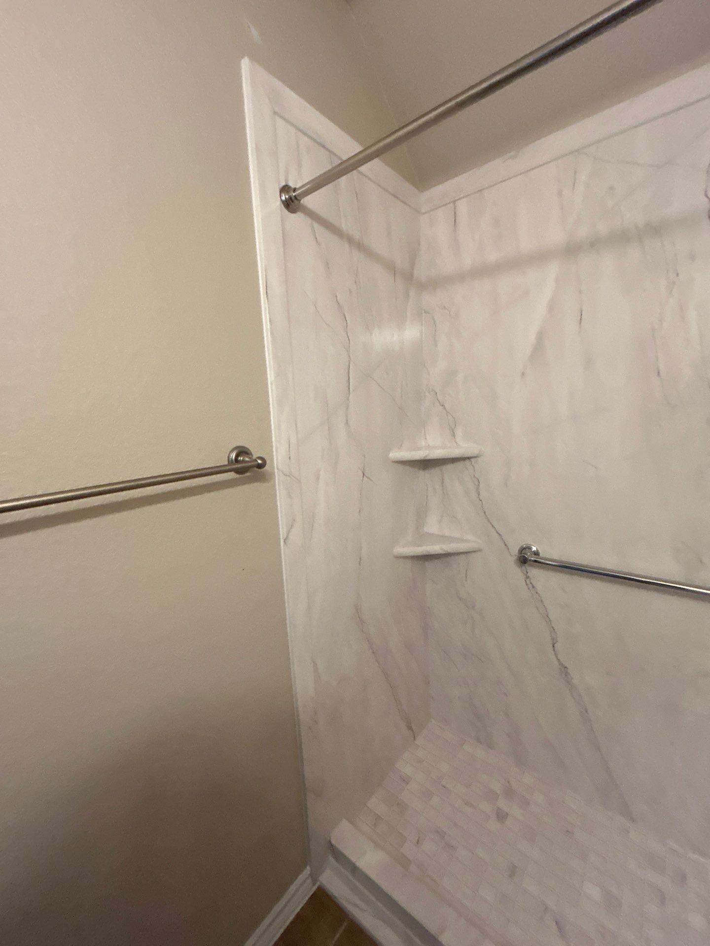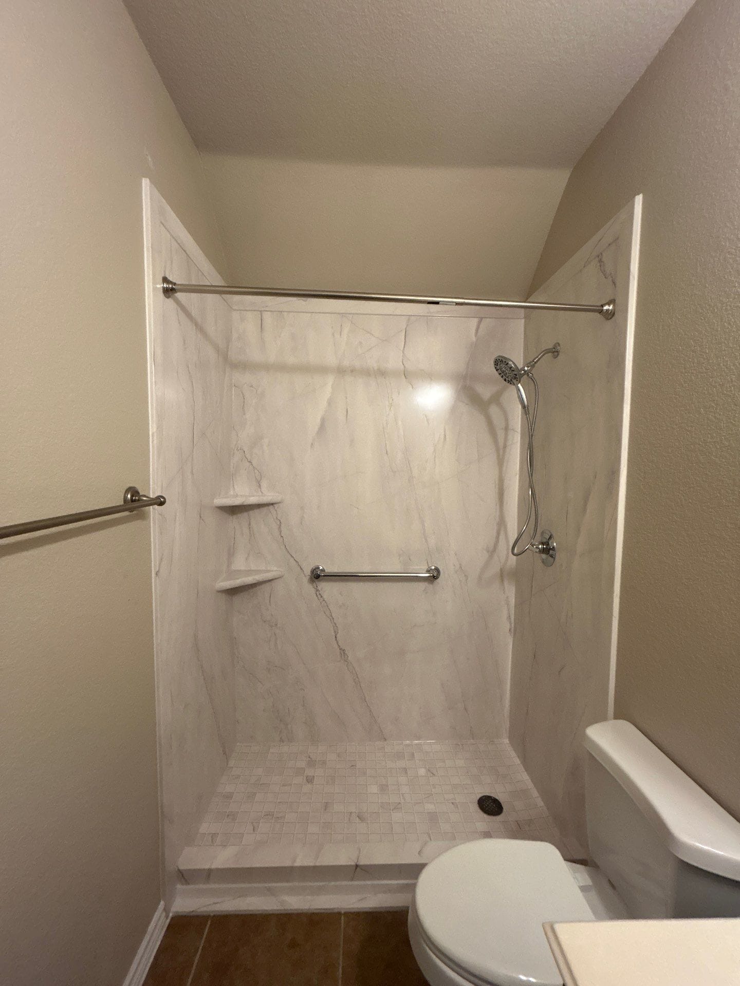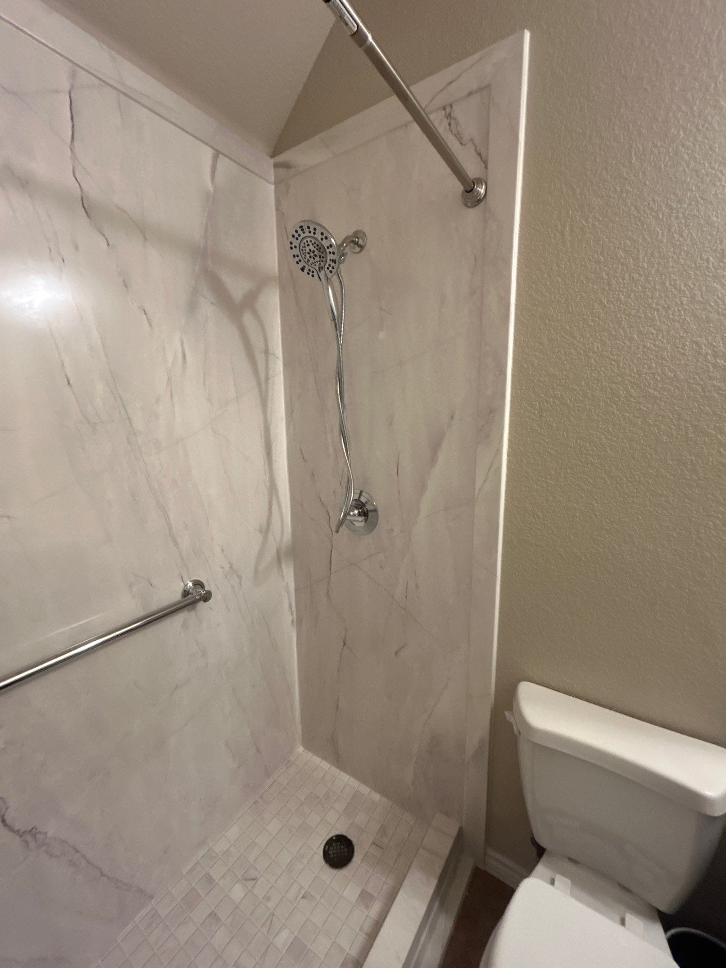 The finished remodel features a fully converted walk-in shower using vertical marble-pattern composite panels in a bright neutral tone. The original tub, tiled surround, and curtain rod were removed and replaced with a new low-threshold shower base and large-format grout-free wall panels. The selected finish resembles a natural stone look with subtle grey veining, creating a modern yet elegant backdrop. Two integrated corner shelves were included, along with a brushed nickel grab bar for safety. The original concept of a swing-open glass door was replaced with a simpler tension-mounted shower rod, allowing flexibility for future upgrades. A modern handheld showerhead with a flexible hose was installed in chrome, offering adjustable height and coverage for guest convenience.