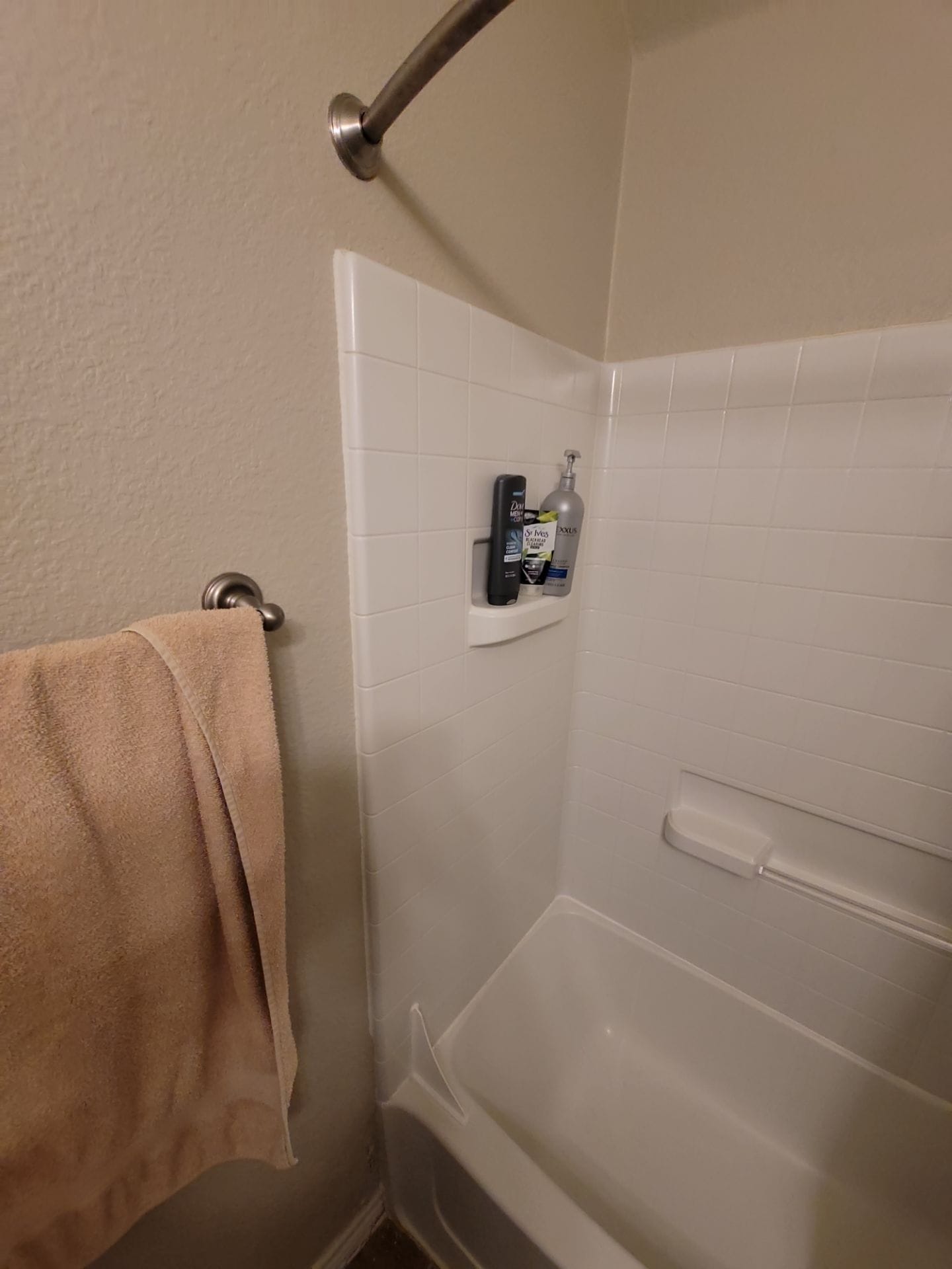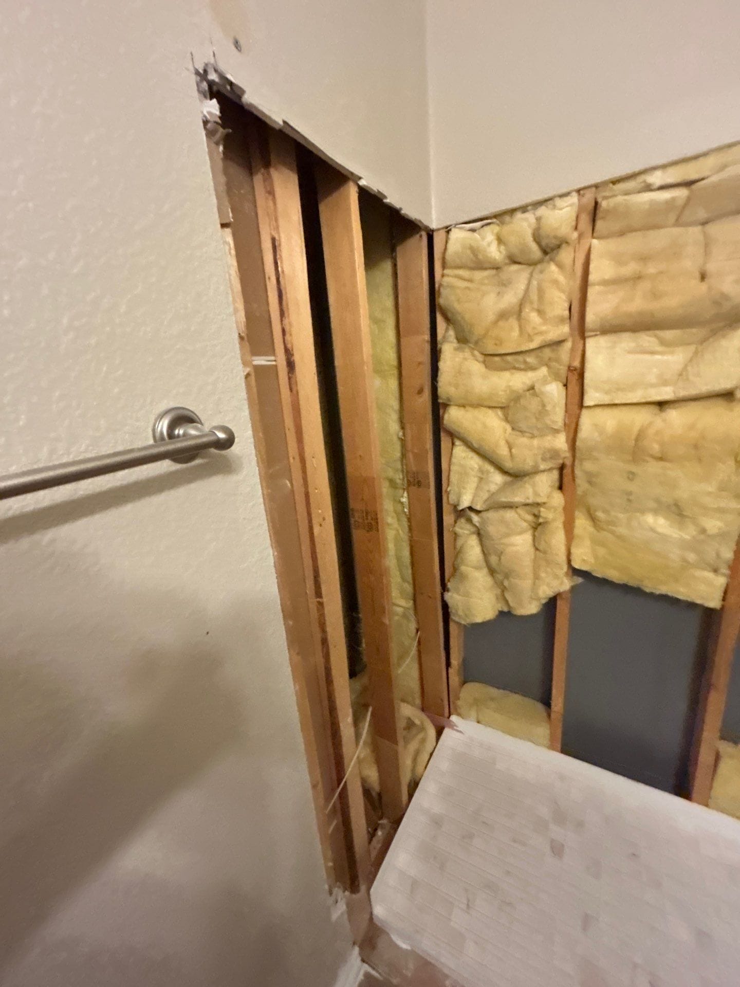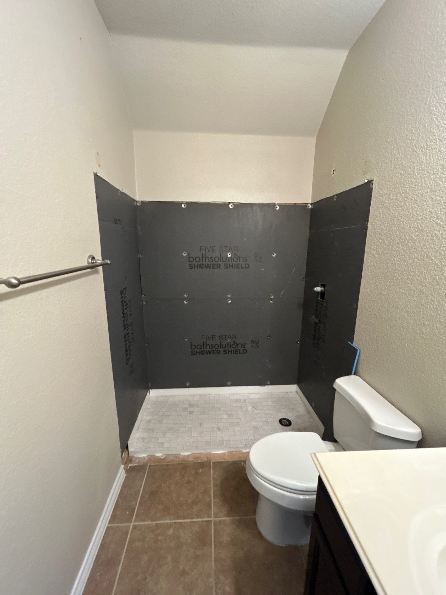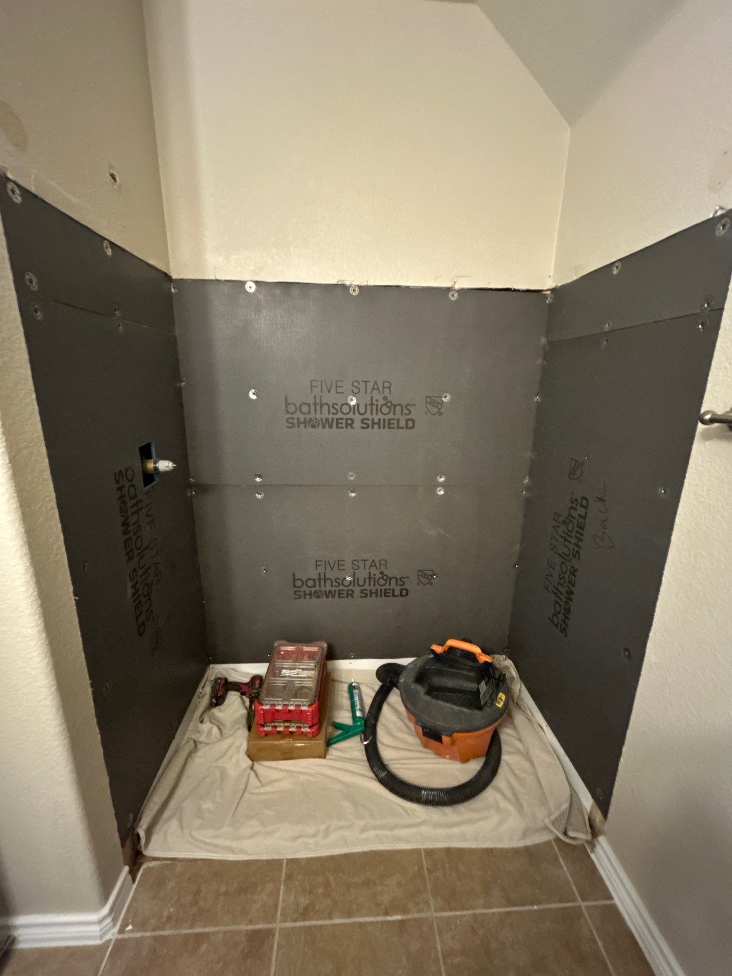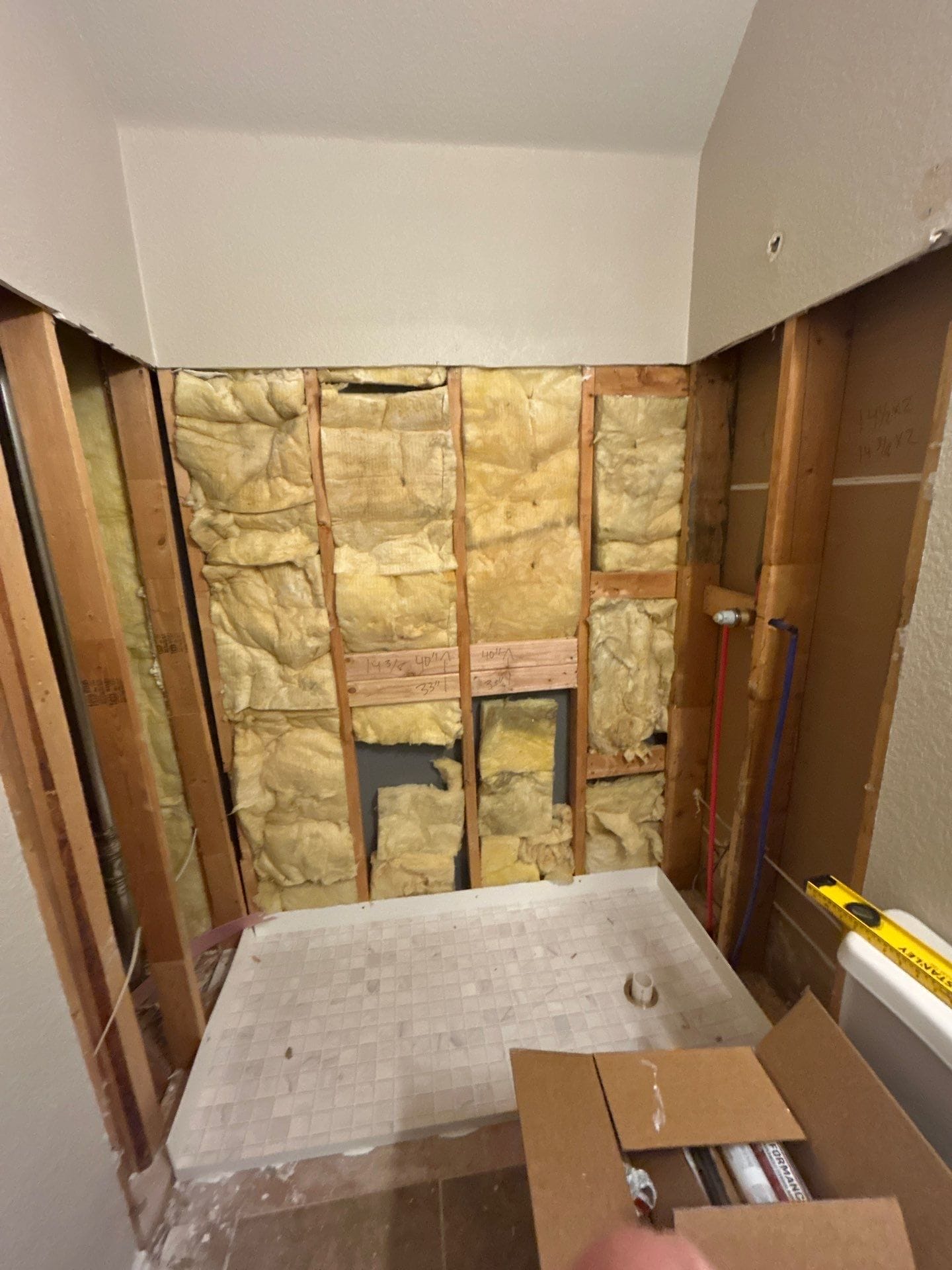 Installation involved full demolition to the studs, followed by framing checks and repairs. New PEX plumbing lines were installed behind the walls, along with the wall system and base, completed with seamless corner finishing. The crew completed the job within the expected timeline. All work was handled by insured in-house installers, with no subcontractors involved.