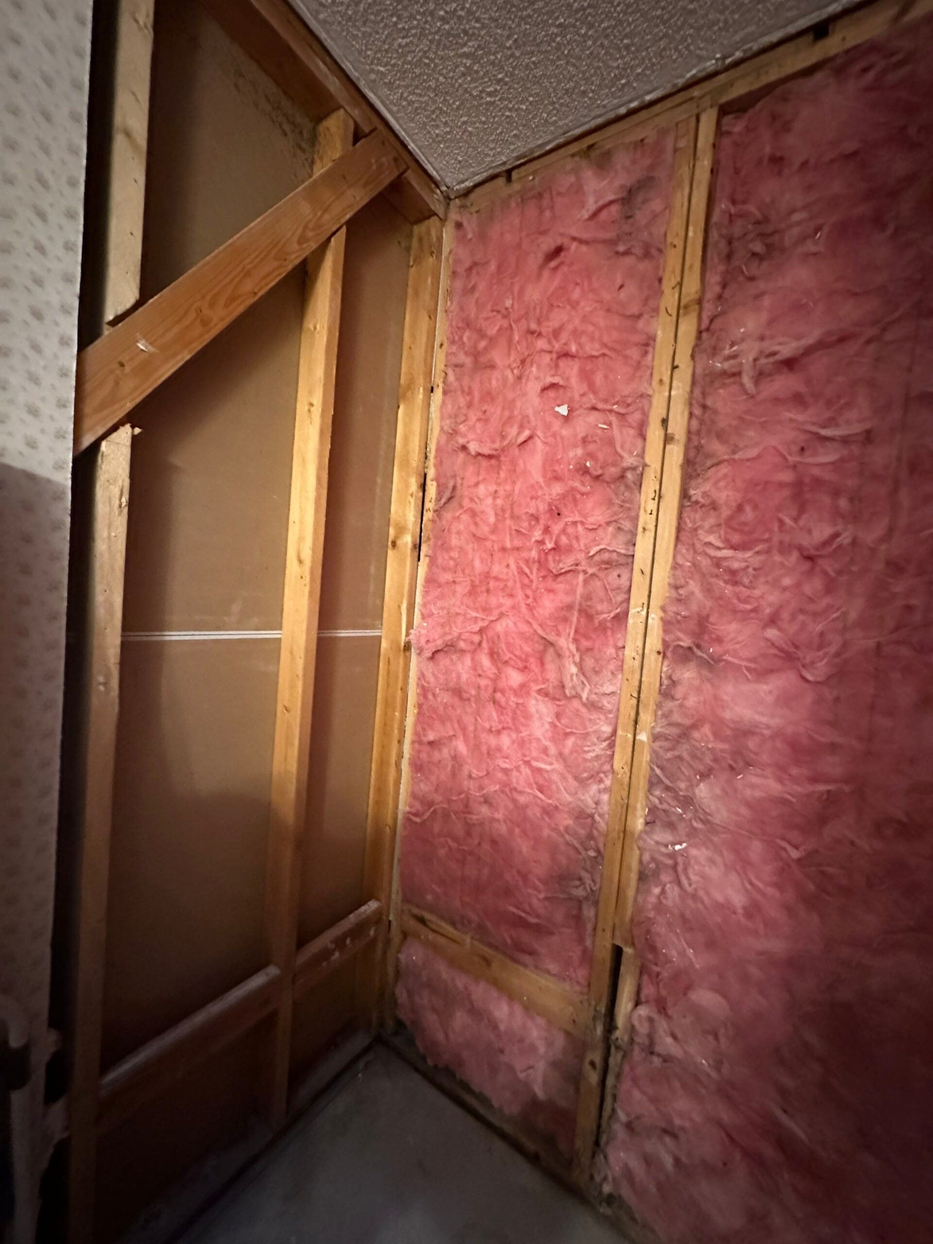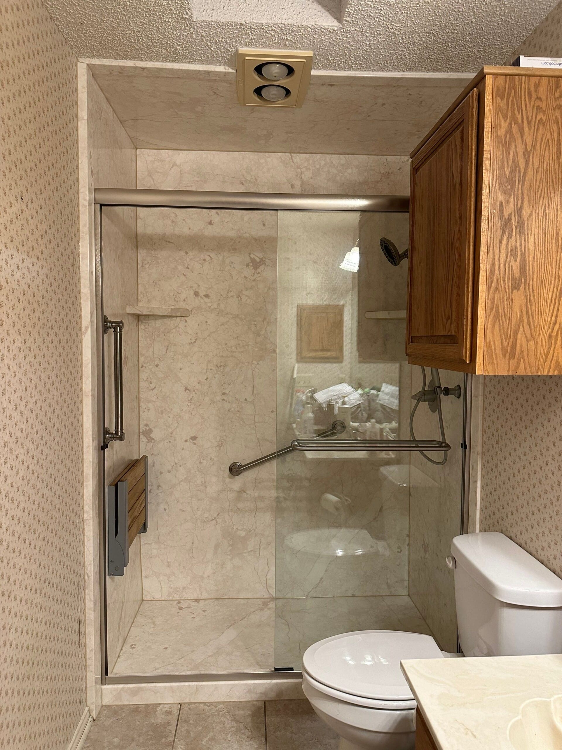 Installation began with full demolition down to studs, followed by inspection and any required repair of substructures. New PEX plumbing was installed, along with a low-threshold base and four integrated corner shelves. Grab bars were positioned on the entry and back wall, and a teak fold-down bench was mounted for added comfort. The frameless glass door system with built-in towel bar replaced the originally considered curtain rod, aligning with the customer's revised preference for a sealed, easy-clean enclosure. The cabinet above the toilet was preserved, and the original tile floor remained undisturbed. The remodel was completed within the standard two-day schedule.