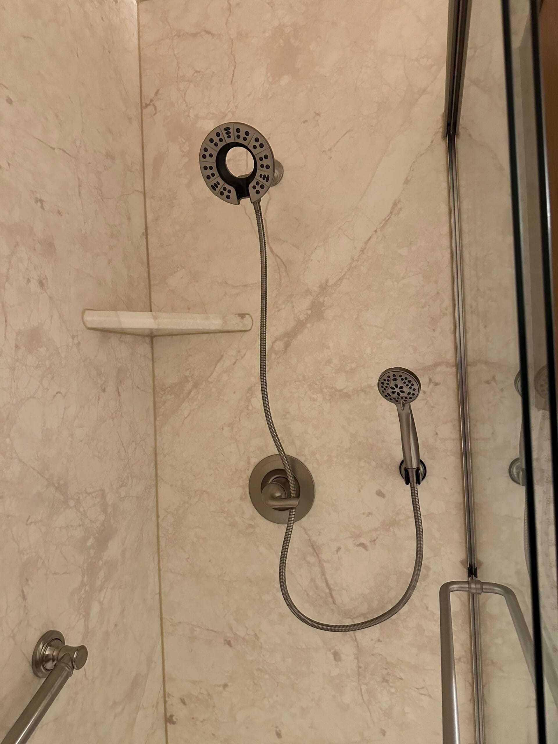 The Five Star Bath Solutions representative recommended the Smart Choice composite wall system, emphasizing its six-layer antimicrobial design that prevents mold and mildew buildup. Using 3D visualization tools and on-site samples, the customer selected Golden Beaches wall panels for a soft stone effect and opted for a chrome dual handheld showerhead. During the consultation, the representative explained that all wall panels are installed over patented ShowerShield backer board using marine-grade silicone and adhesives. A two-panel frameless glass bypass door system was ultimately chosen for added safety and a more enclosed design.