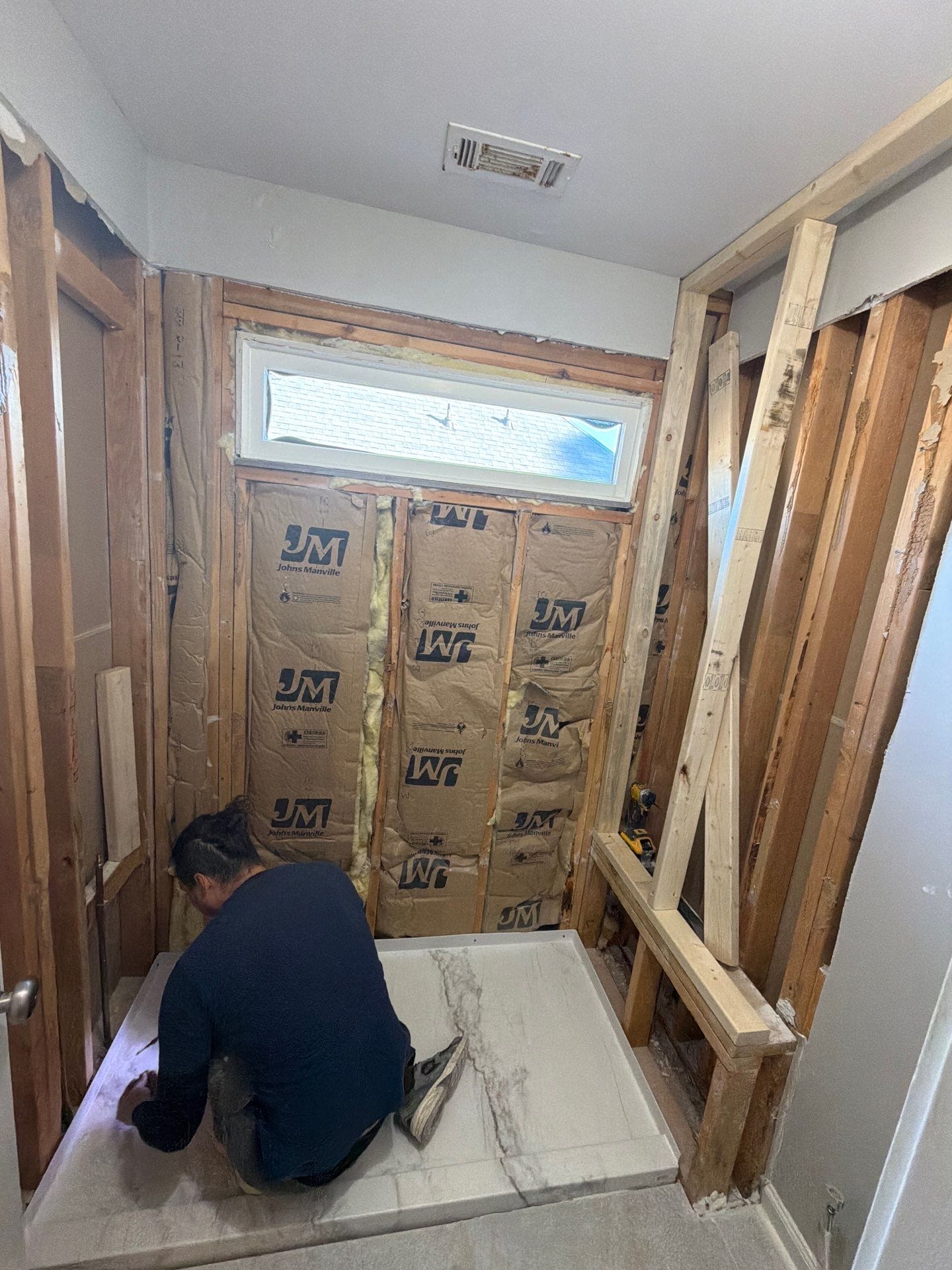 Installation included a full demo of the existing system down to the studs, subfloor review, and the addition of structural blocking to support grab bars and the bench. Composite panels were installed up to the ceiling, and a low-threshold, fully supported pan was placed with no risk of movement or flexing. New corner shelves were integrated into the wall system, and a frameless sliding glass door system was installed to meet visual and accessibility preferences. The magnetic shower head, straight grab bar, and wall-mounted fixture layout matched the initial customer request. The existing window was preserved within the new wall system, with tight sealing applied for moisture resistance.