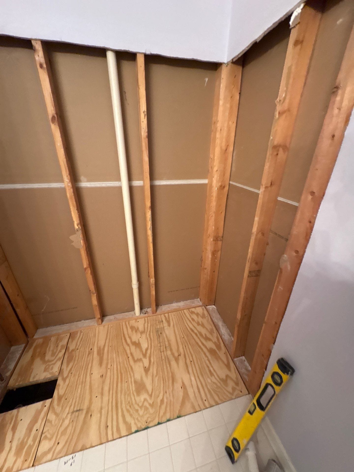 The installation process involves a complete demolition of the existing area, including the removal of old walls, green board, and the plumbing mud ring. Technicians perform necessary piping adjustments and reinforce the wall studs to provide secure anchoring for safety bars and specialized fixtures. This comprehensive approach addresses any subfloor rot or structural damage caused by previous leaks, rebuilding the area from the ground up to ensure a perfectly level and waterproof foundation. The final assembly includes a custom-fit shower base and a sliding glass door system, providing a clean and contemporary finish.