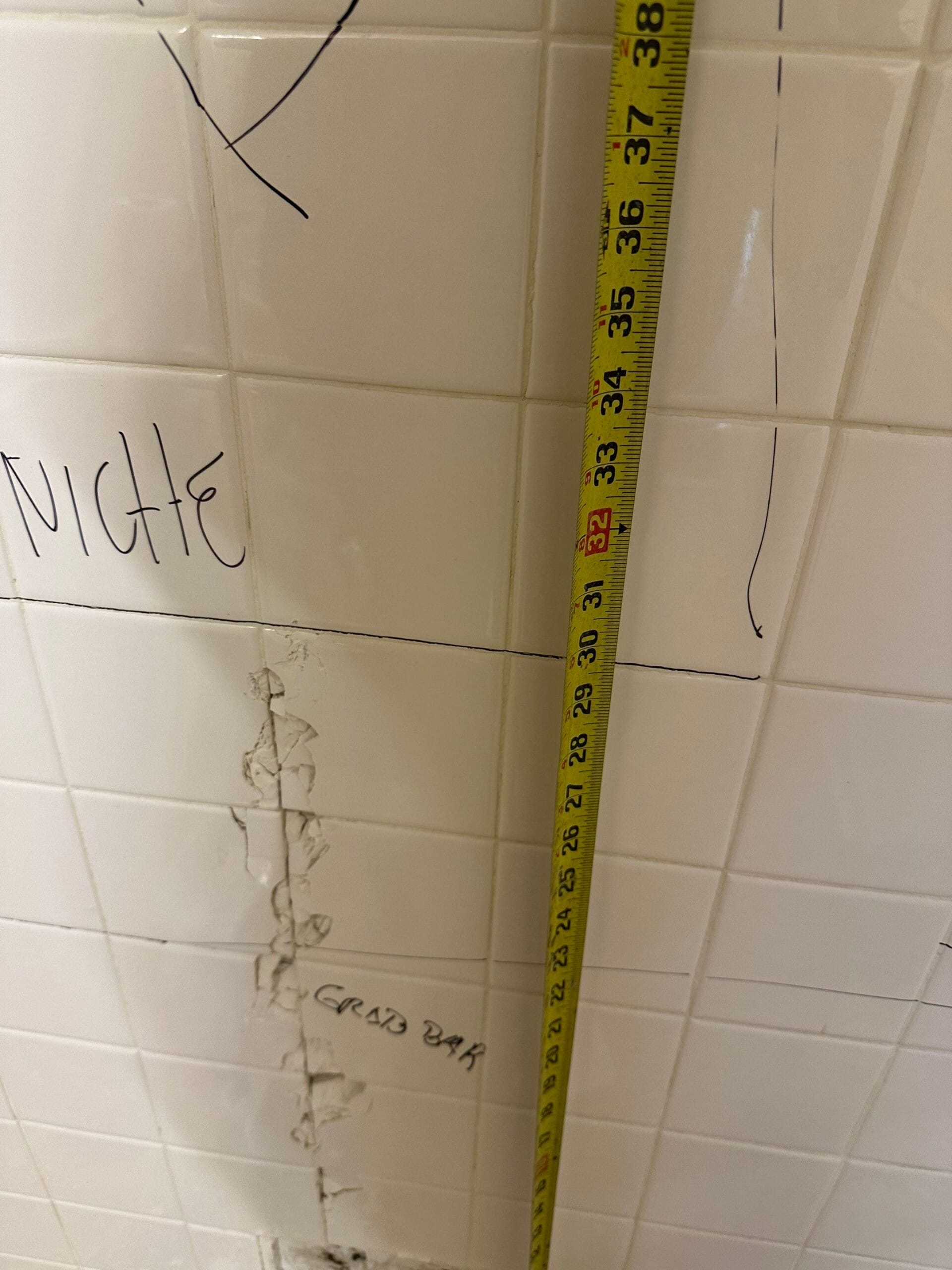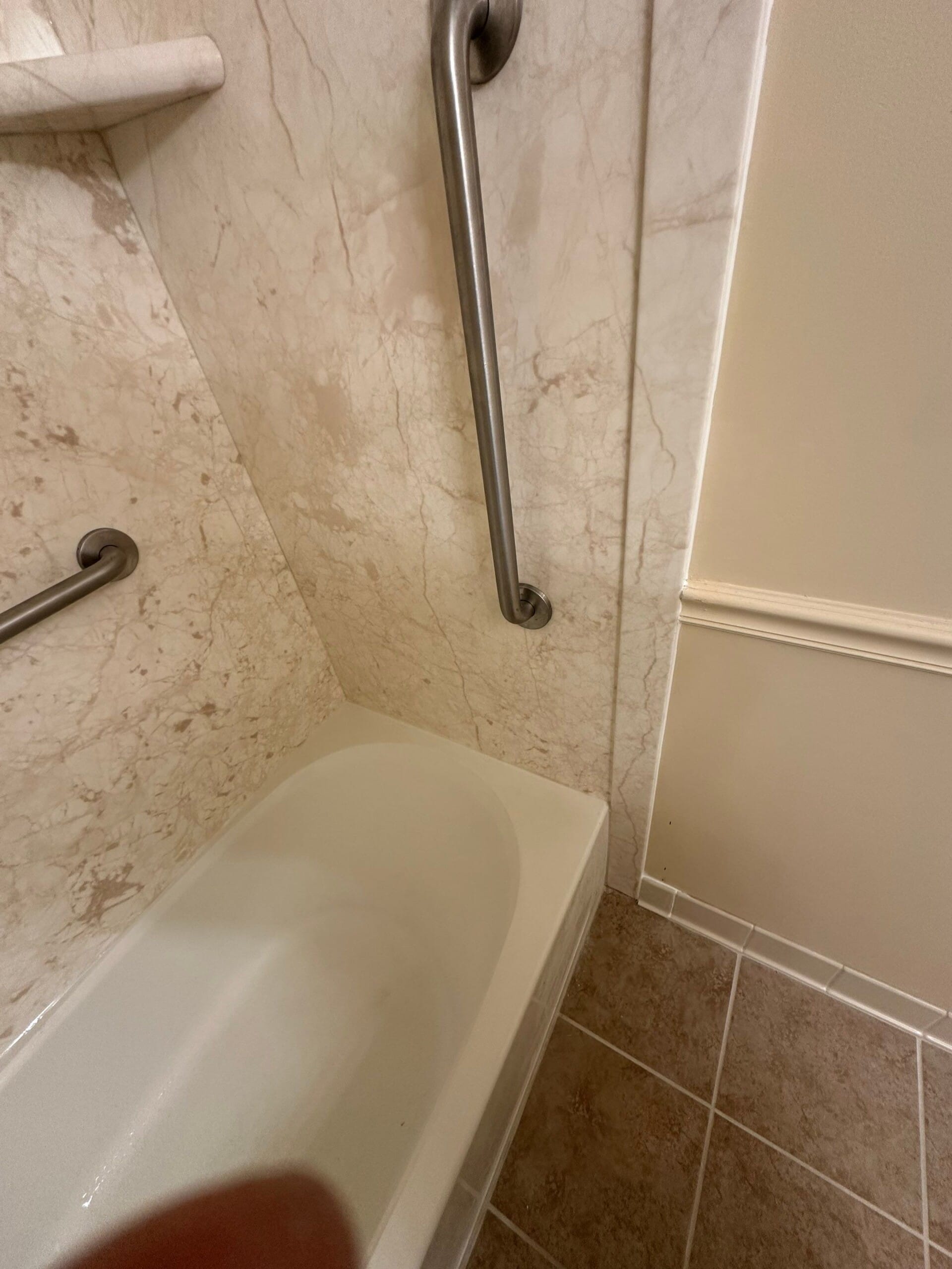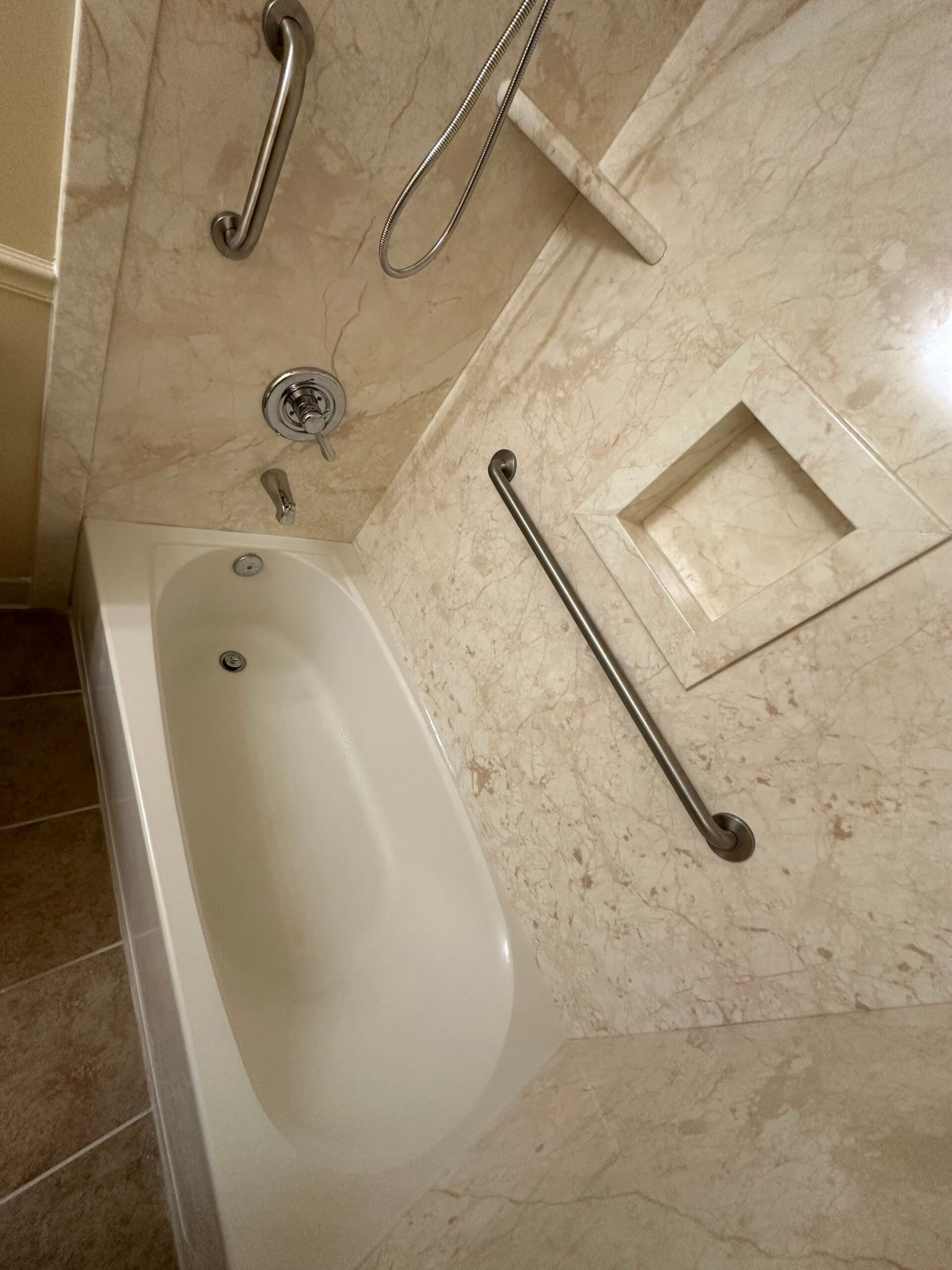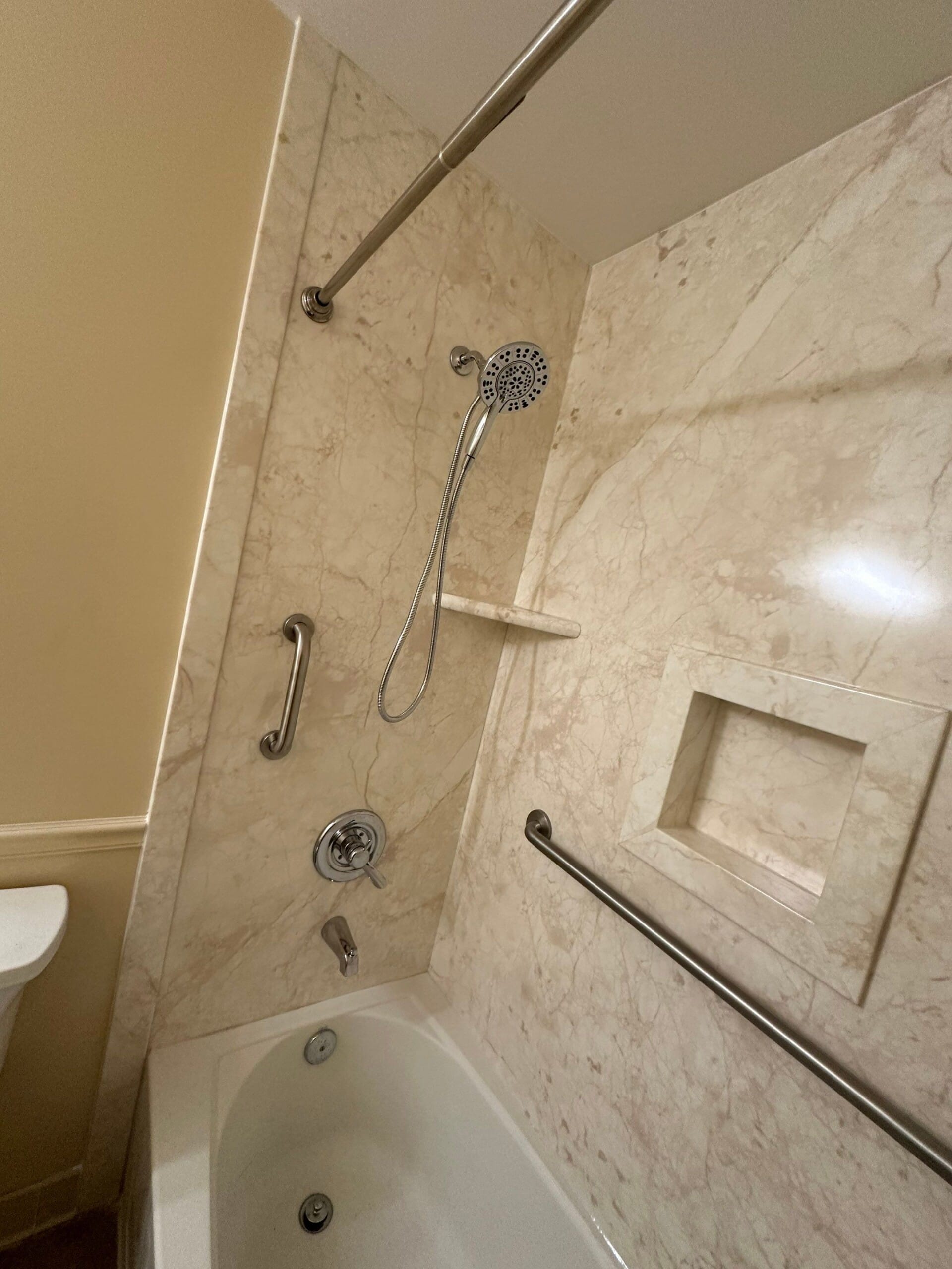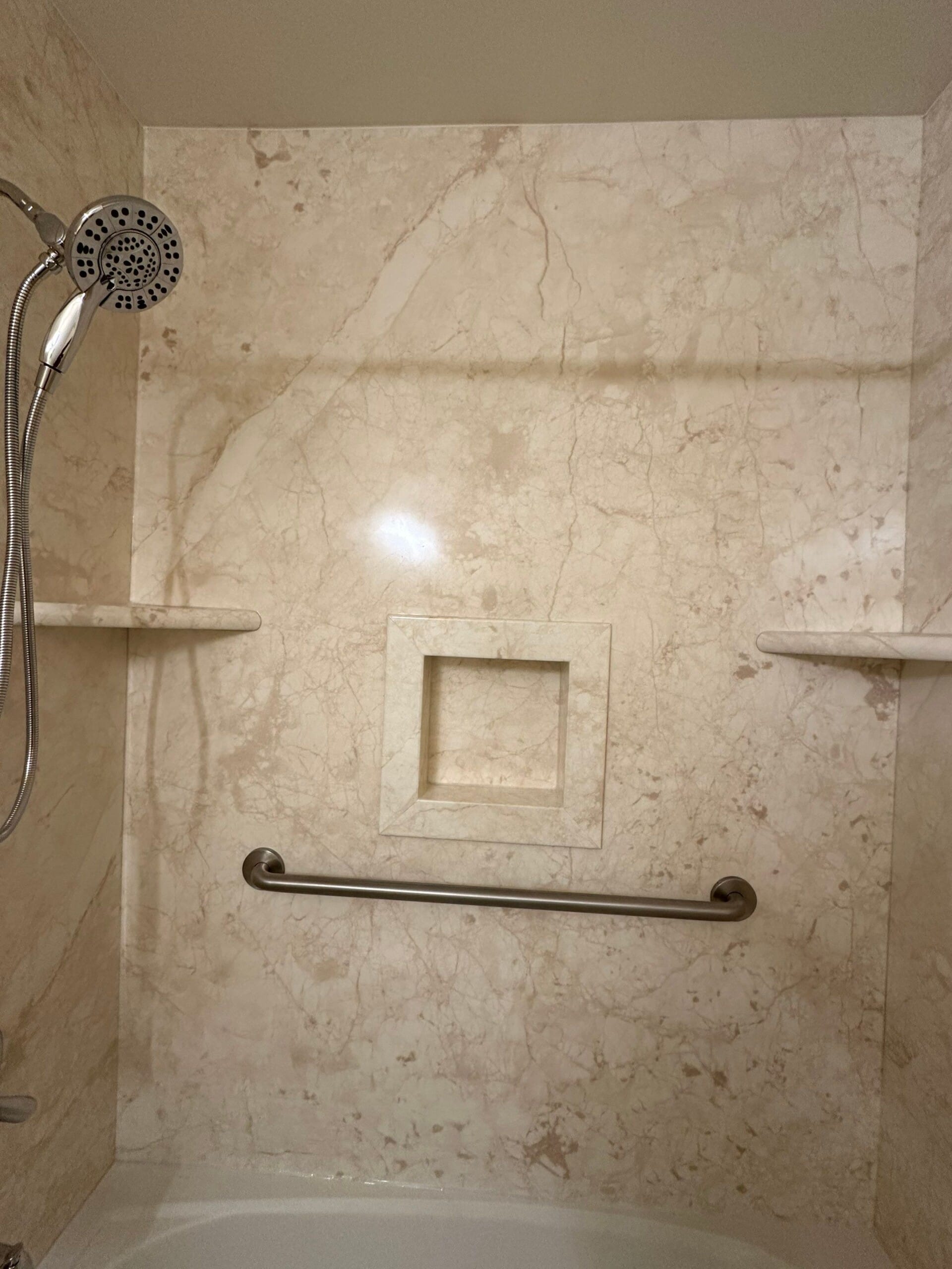 Installation included full removal of the existing tile surround down to the studs, inspection of the framing, and preparation for the new composite wall panels. Necessary structural reinforcement was completed to support the grab bars securely. The new marble-pattern surround was installed with integrated corner shelves and a centered recessed niche for convenient storage. Plumbing fixtures were replaced with updated brushed nickel components, and all grab bars were reinstalled in reinforced locations to maintain safety. The workspace was protected throughout the process, and the project was completed efficiently with careful attention to finishing details.