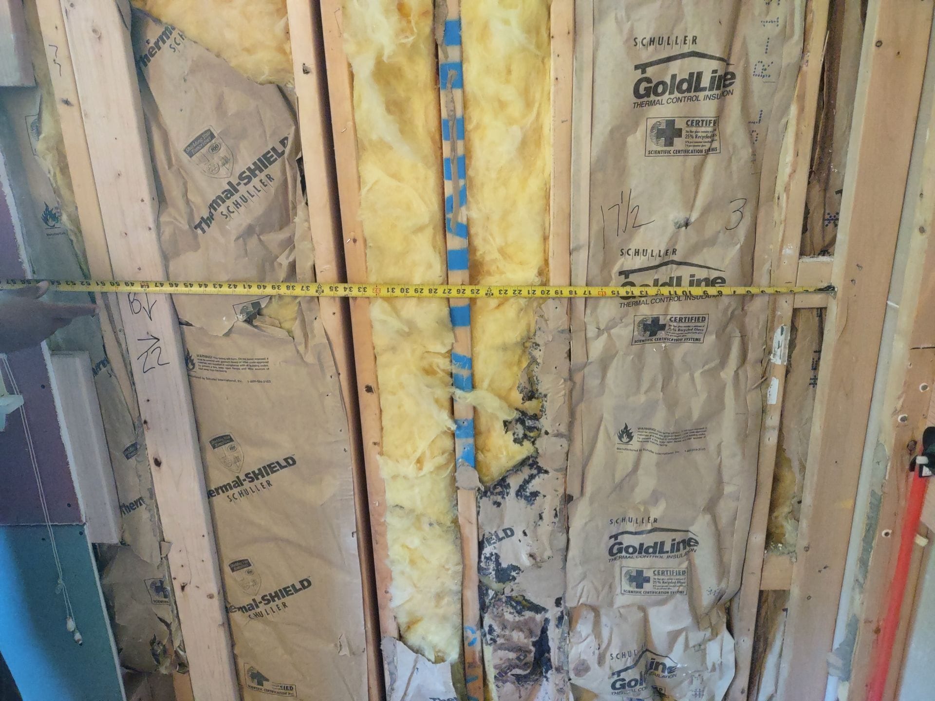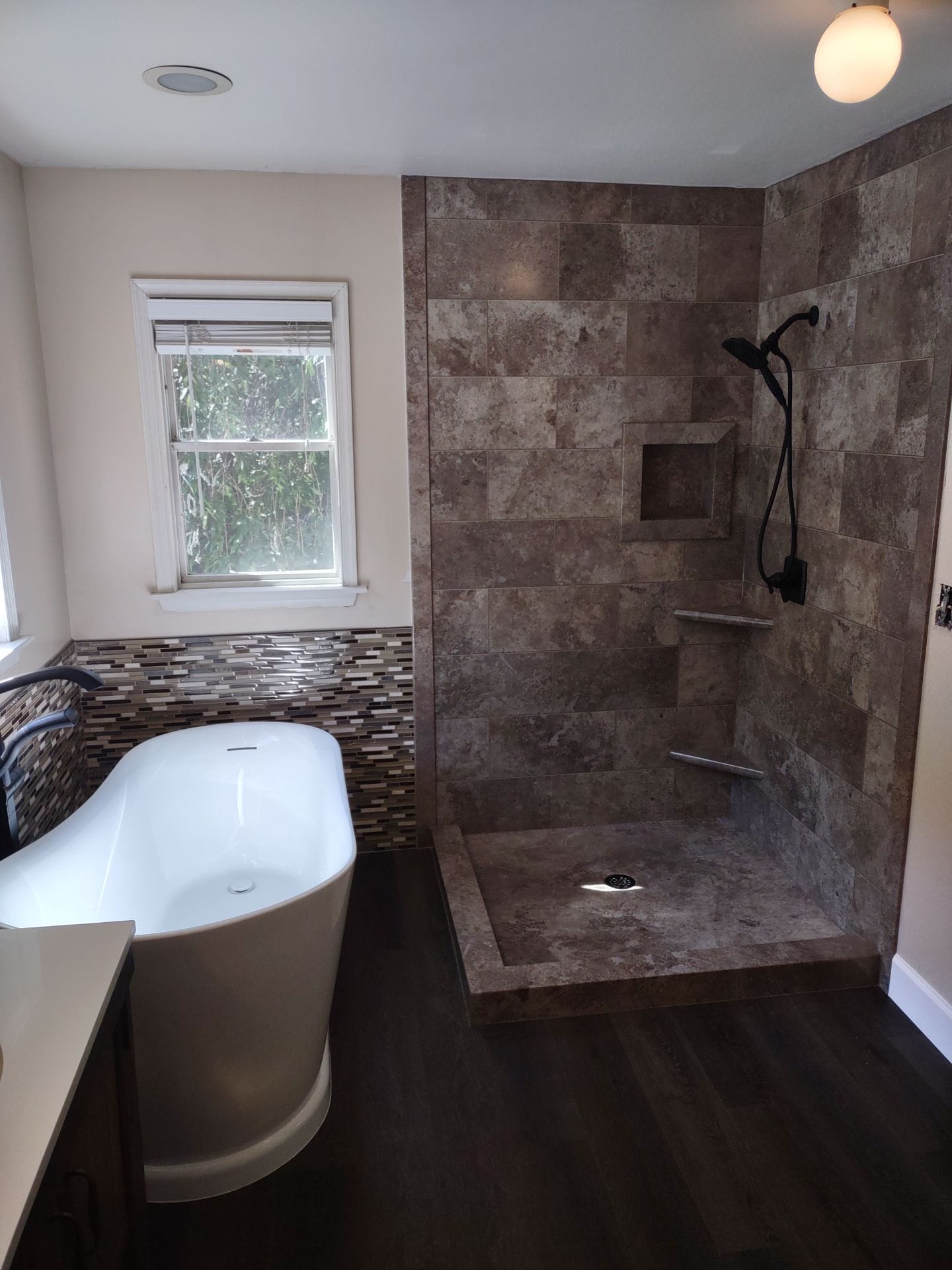 The installation process began with full tear-out of the previous shower and tub area down to the studs. Mold remediation and replacement of plumbing lines were included, with new accessories braced to studs for lasting strength. The shower was rebuilt using a solid-core, slip-resistant base paired with large-format Triton finish Smart Choice wall panels. Features such as a recessed wall niche and two corner shelves were integrated for practical storage, along with a matte black handheld shower fixture. A freestanding soaking tub was installed in place of the original jetted unit, surrounded by a mosaic tile accent wall with horizontal multi-tone striping. Final flooring selections included wide-plank dark waterproof vinyl to unify the space with a cohesive look.