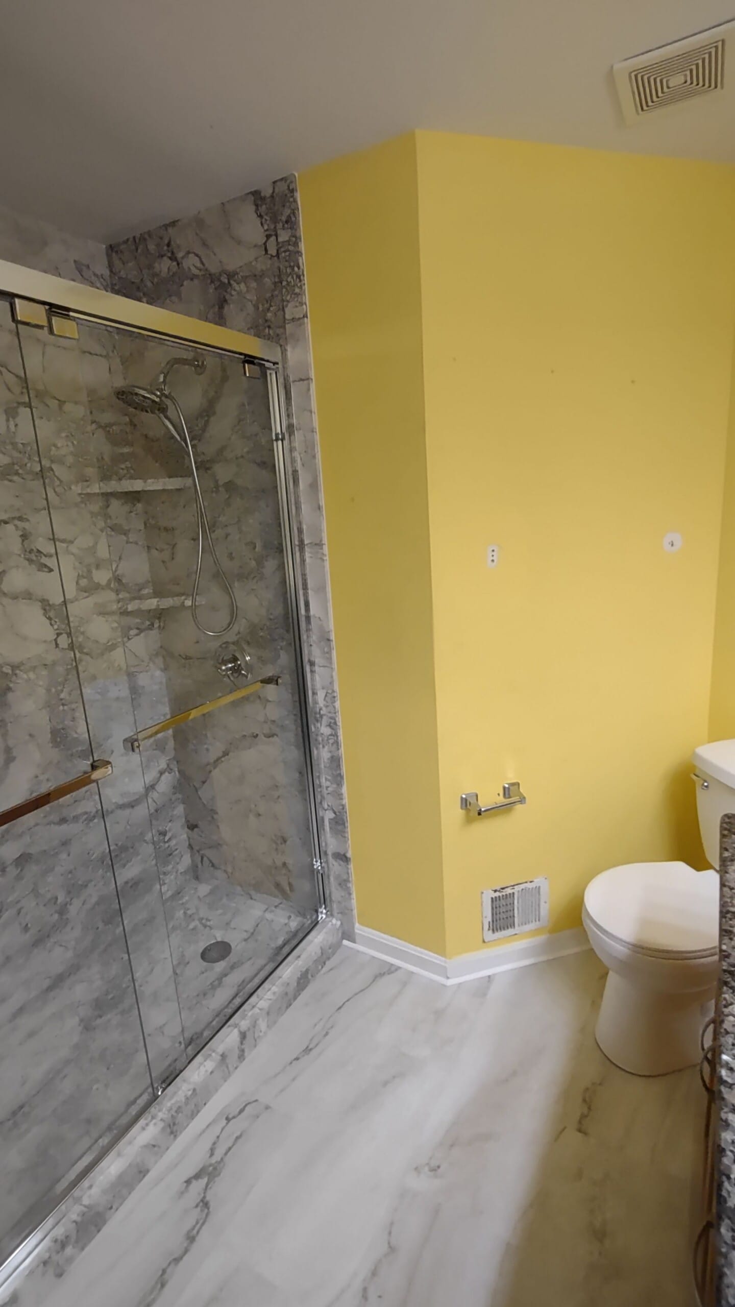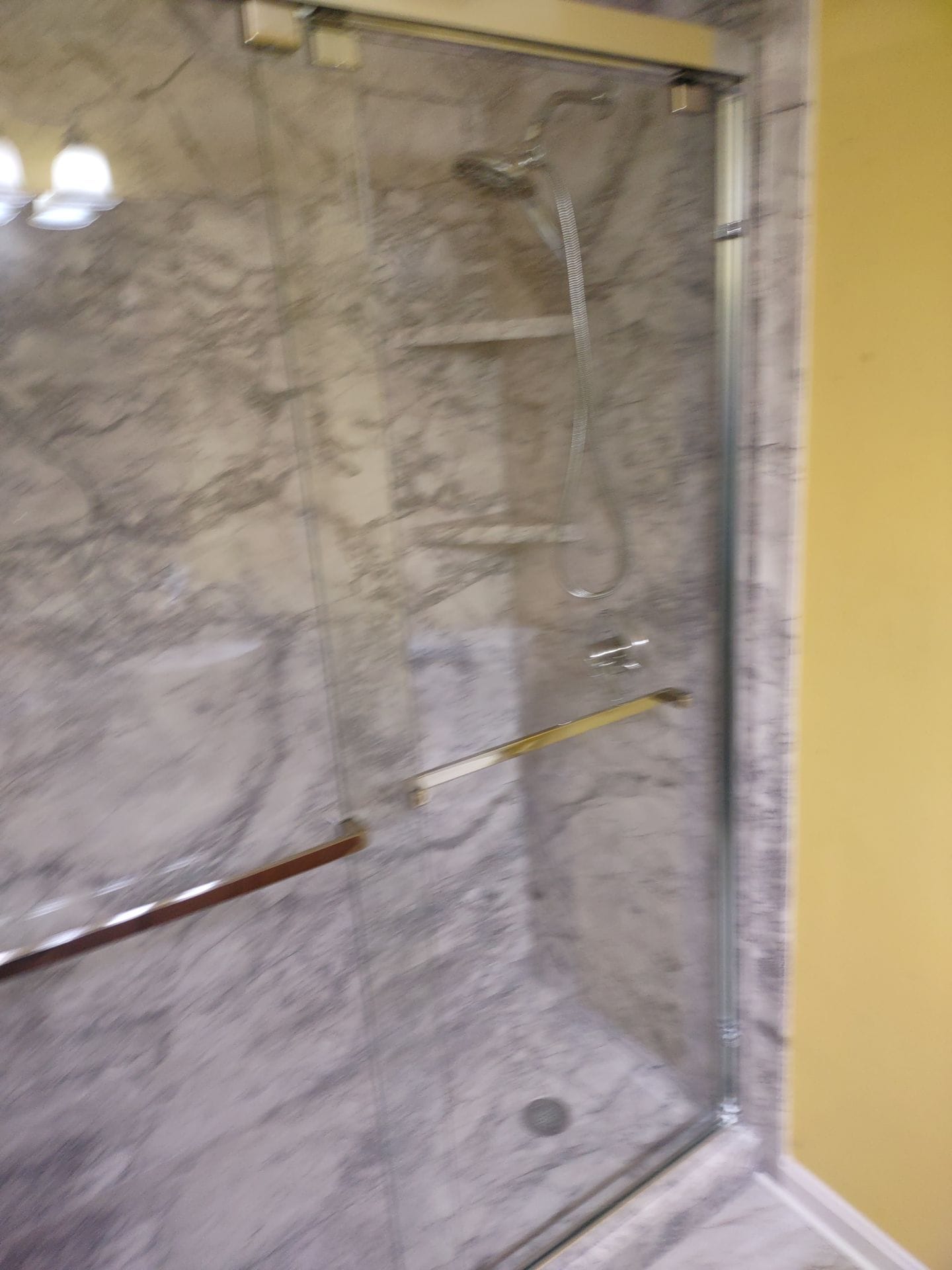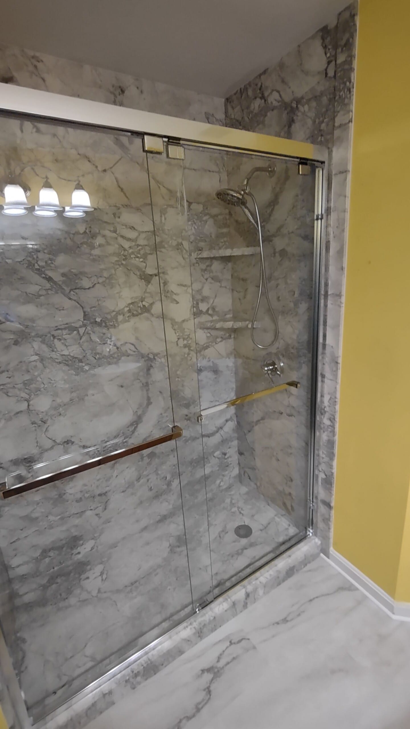 * Gray marble-style Smart Choice antimicrobial, grout-free composite wall panels with ceiling coverage