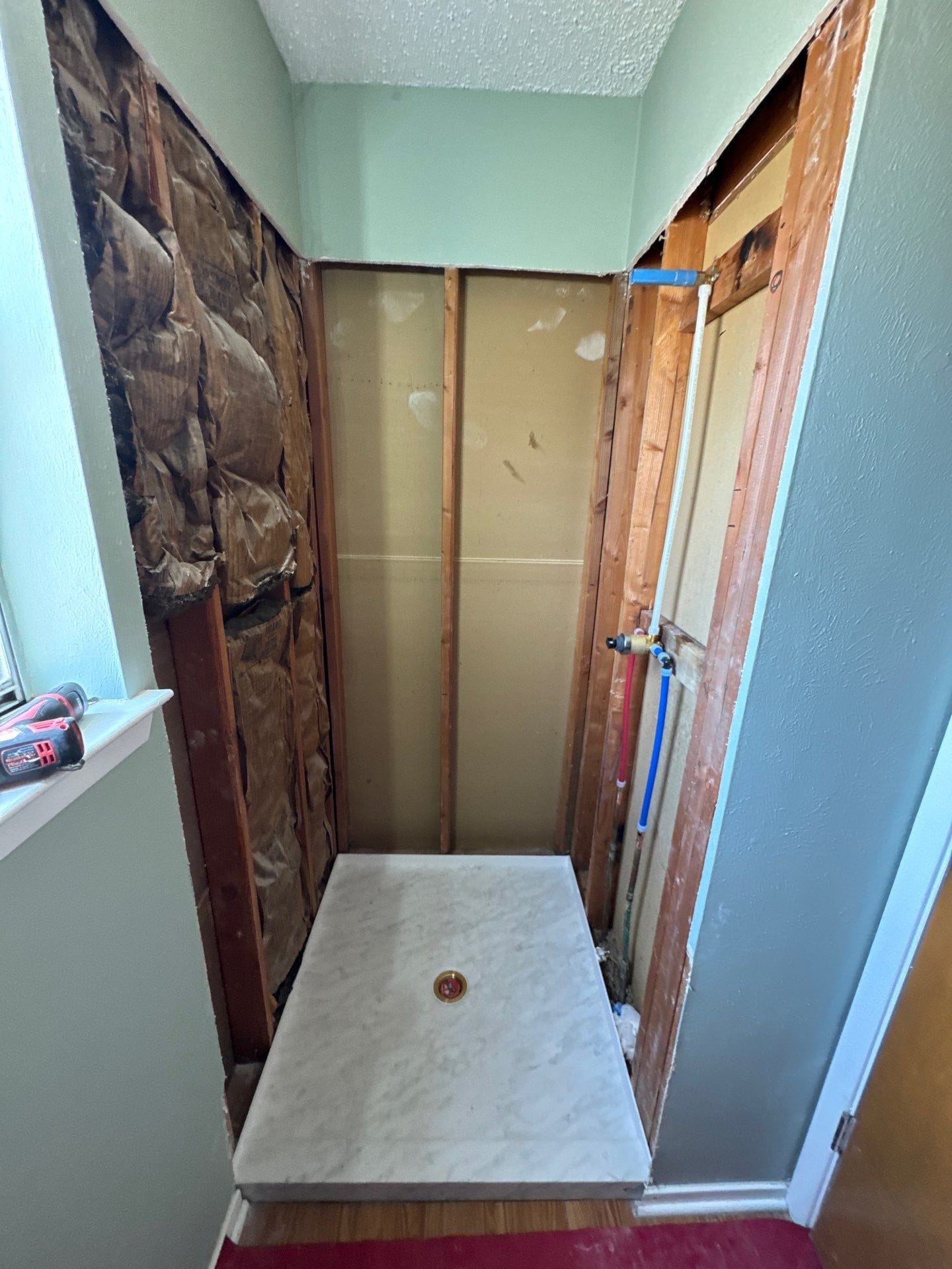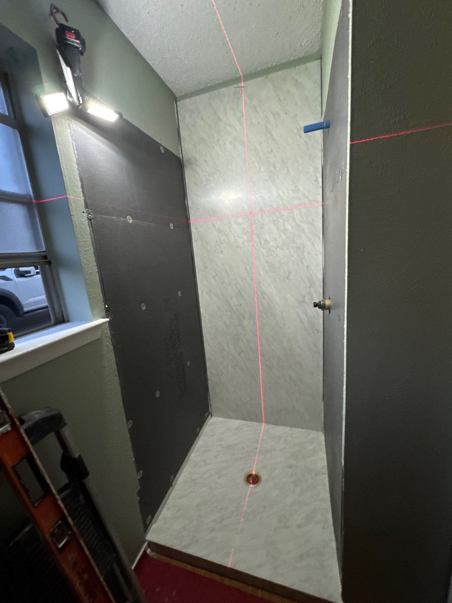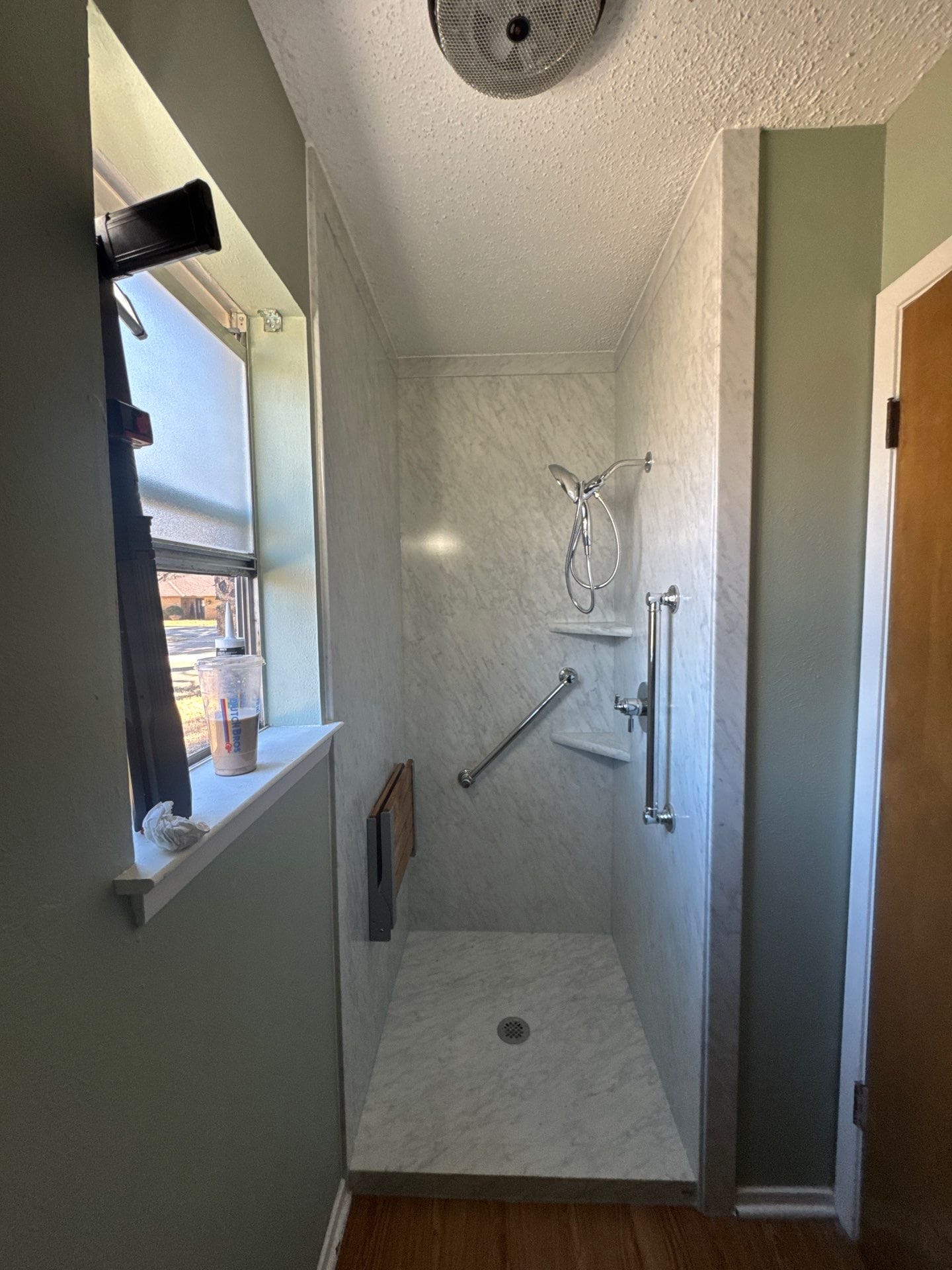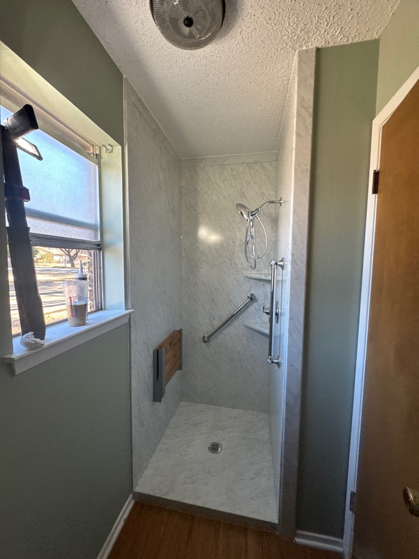 Installation followed a precise process starting with a full removal of old materials down to the wall studs to inspect for underlying issues. The crew installed new plumbing valves, a specialized moisture-resistant backing system, and custom-fit panels aligned for a watertight seal. Following the structural work, the team installed safety features including a diagonal grab bar and a fold-down teak bench, along with a custom glass enclosure and a multi-function handheld shower system.