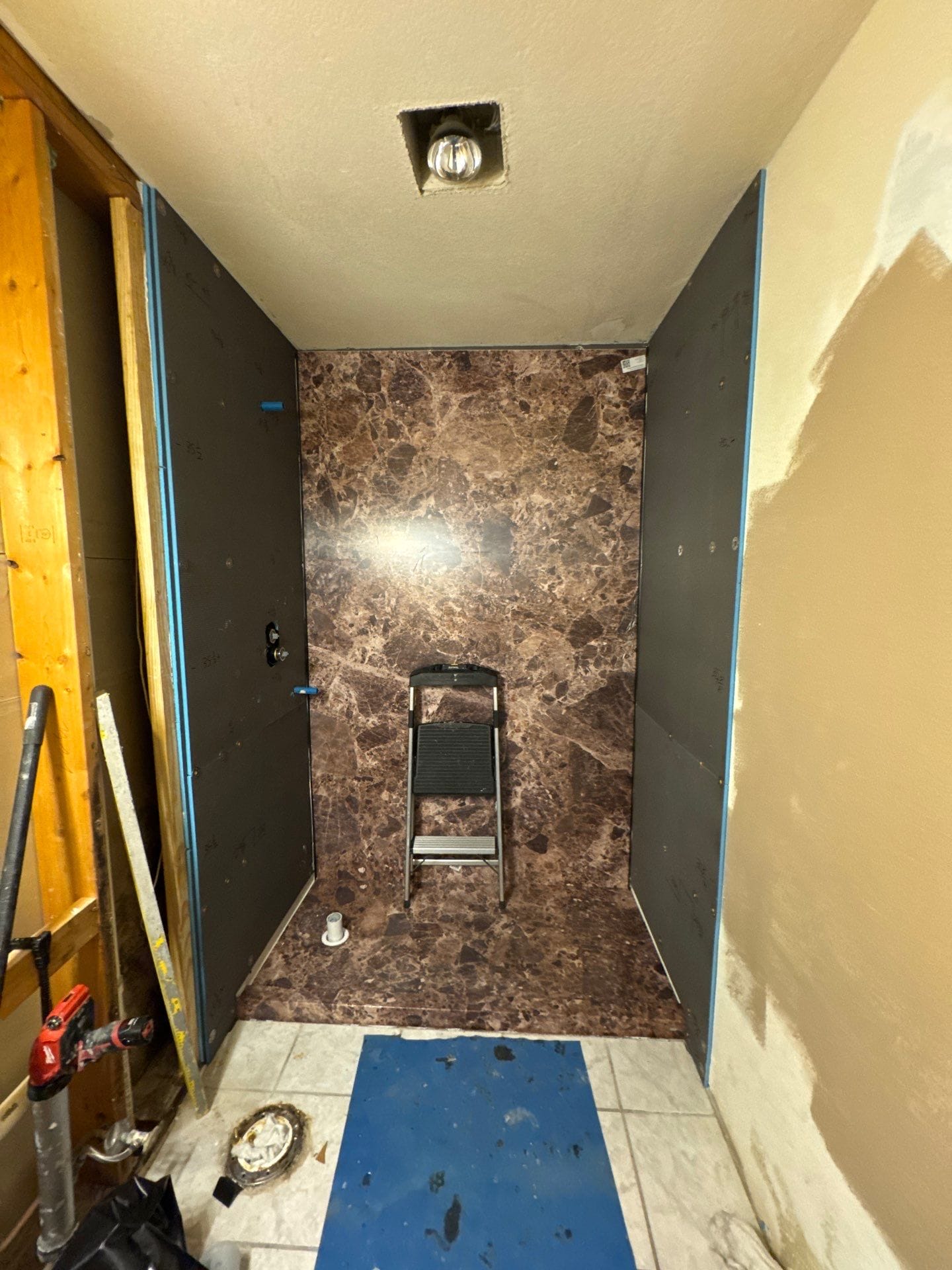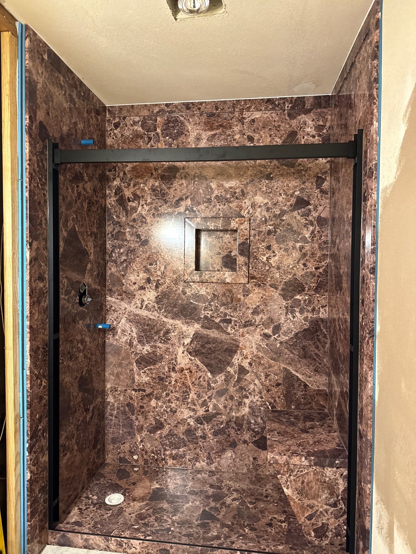 * Dark brown marble-look Smart Choice grout-free composite wall system