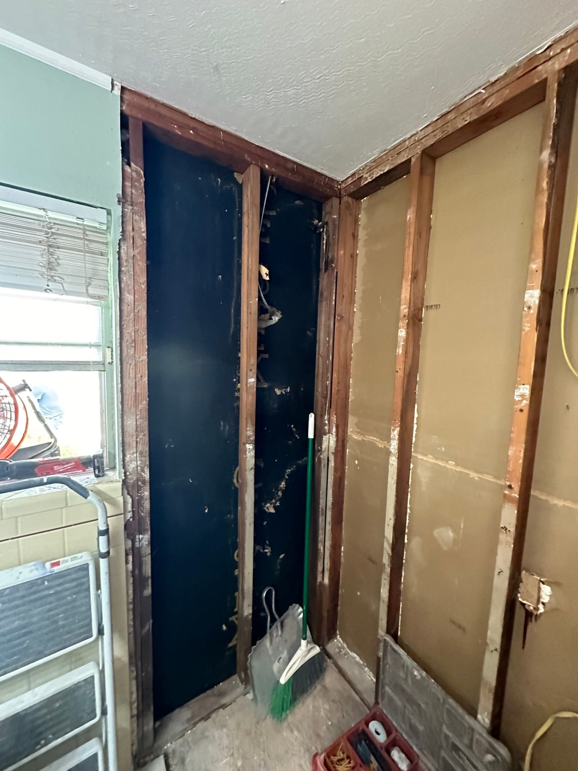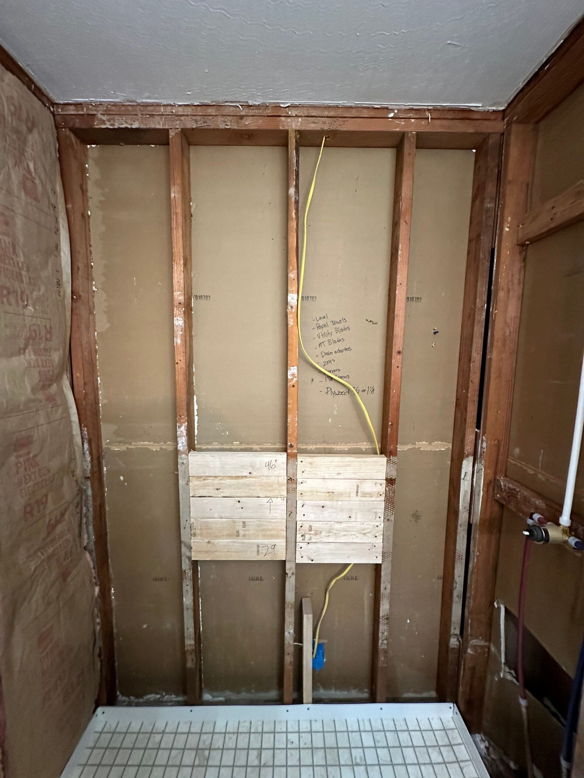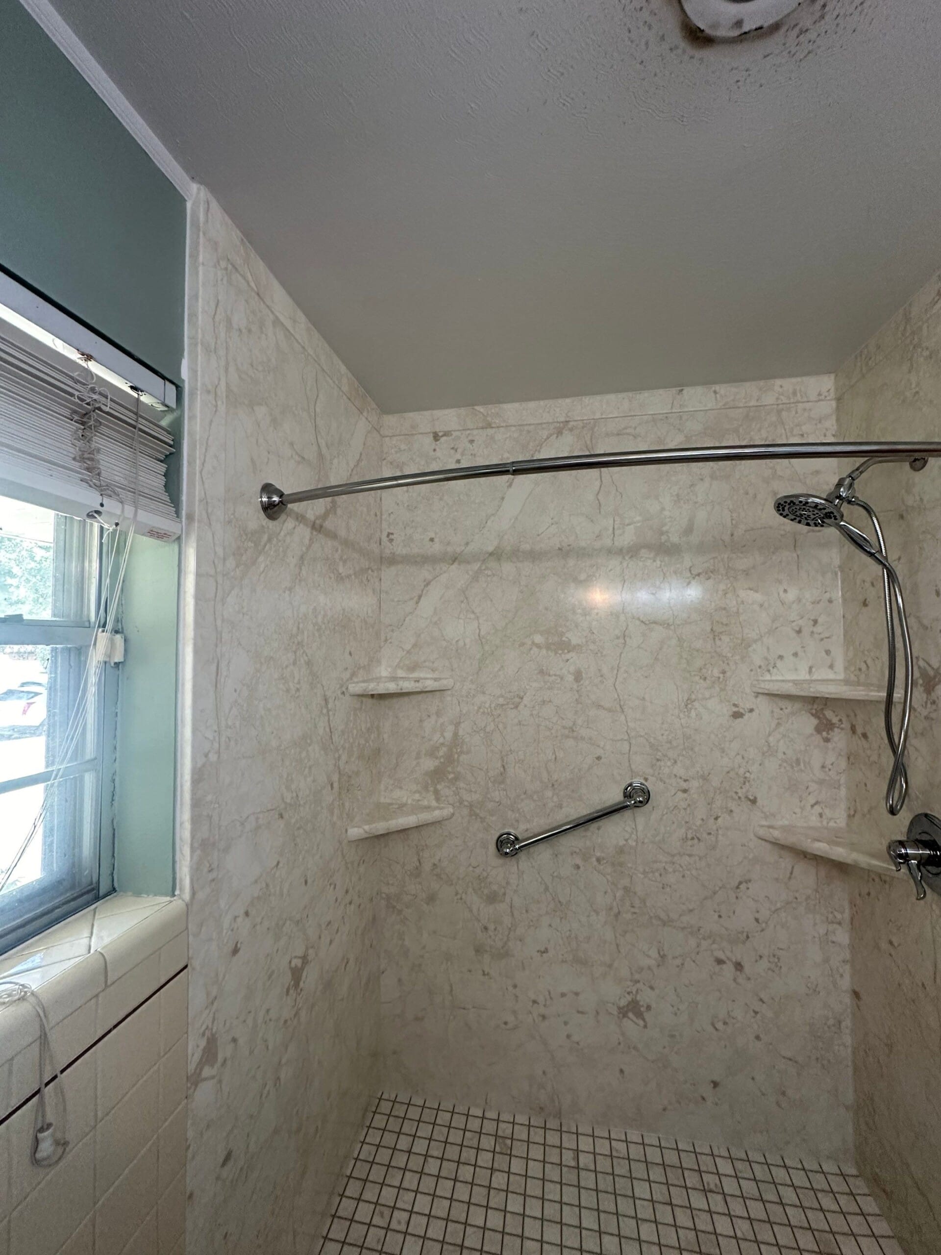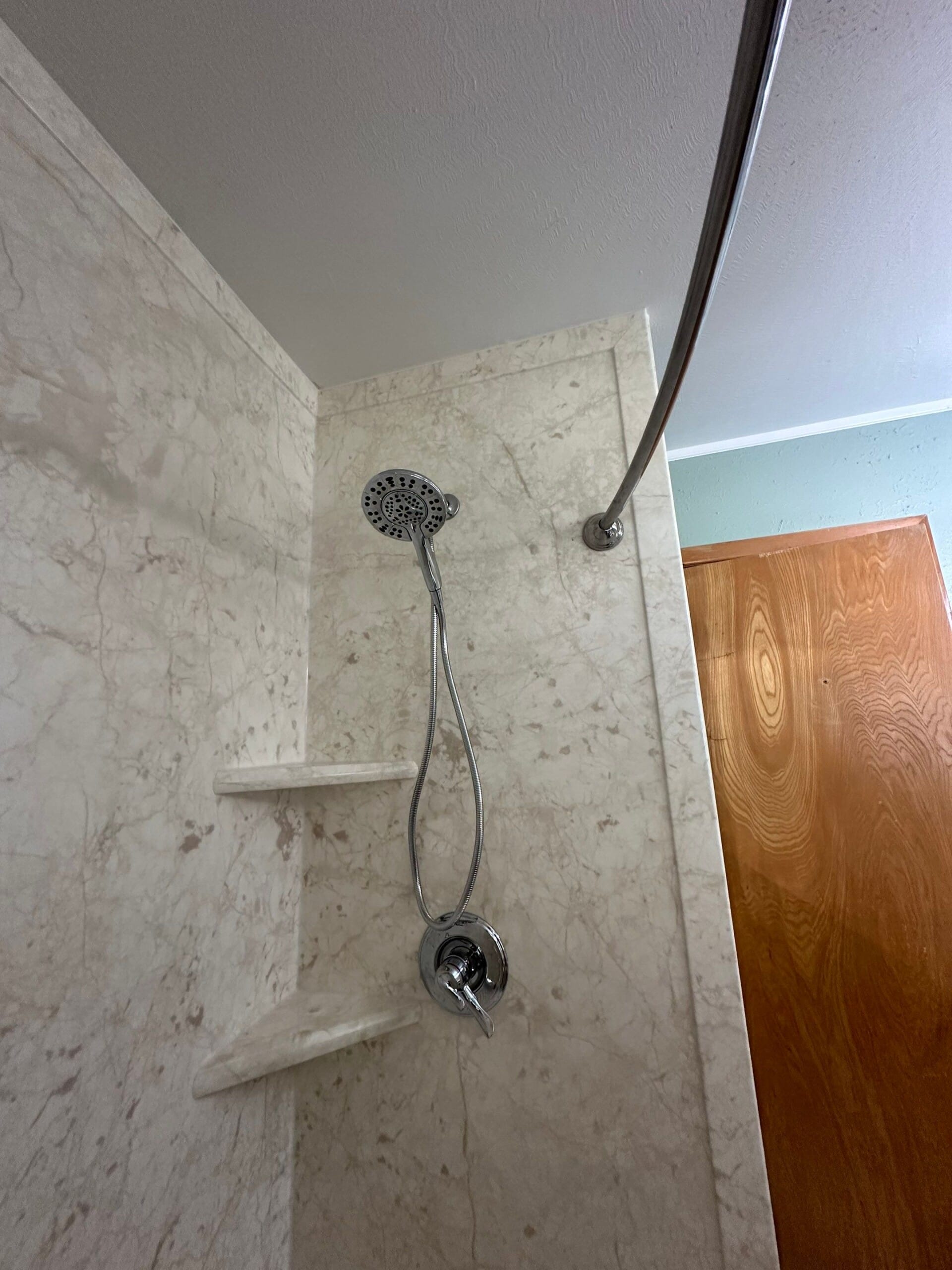 Due to high moisture readings behind the original tile and visible structural wear, the project required a full tear-out to the studs. During this process, mold remediation and necessary framing replacements were included at no charge. Installation used Shower Shield waterproof backer board reinforced by quad corner locks. A new one-piece, non-slip base with a three-inch lip was installed, along with updated plumbing and a relocated mid-height control valve. The wall panels extended to the ceiling to increase perceived shower height. Though most installations finish in one and a half days, this remodel was completed in two, with crews preserving access to non-wet area facilities during the process.