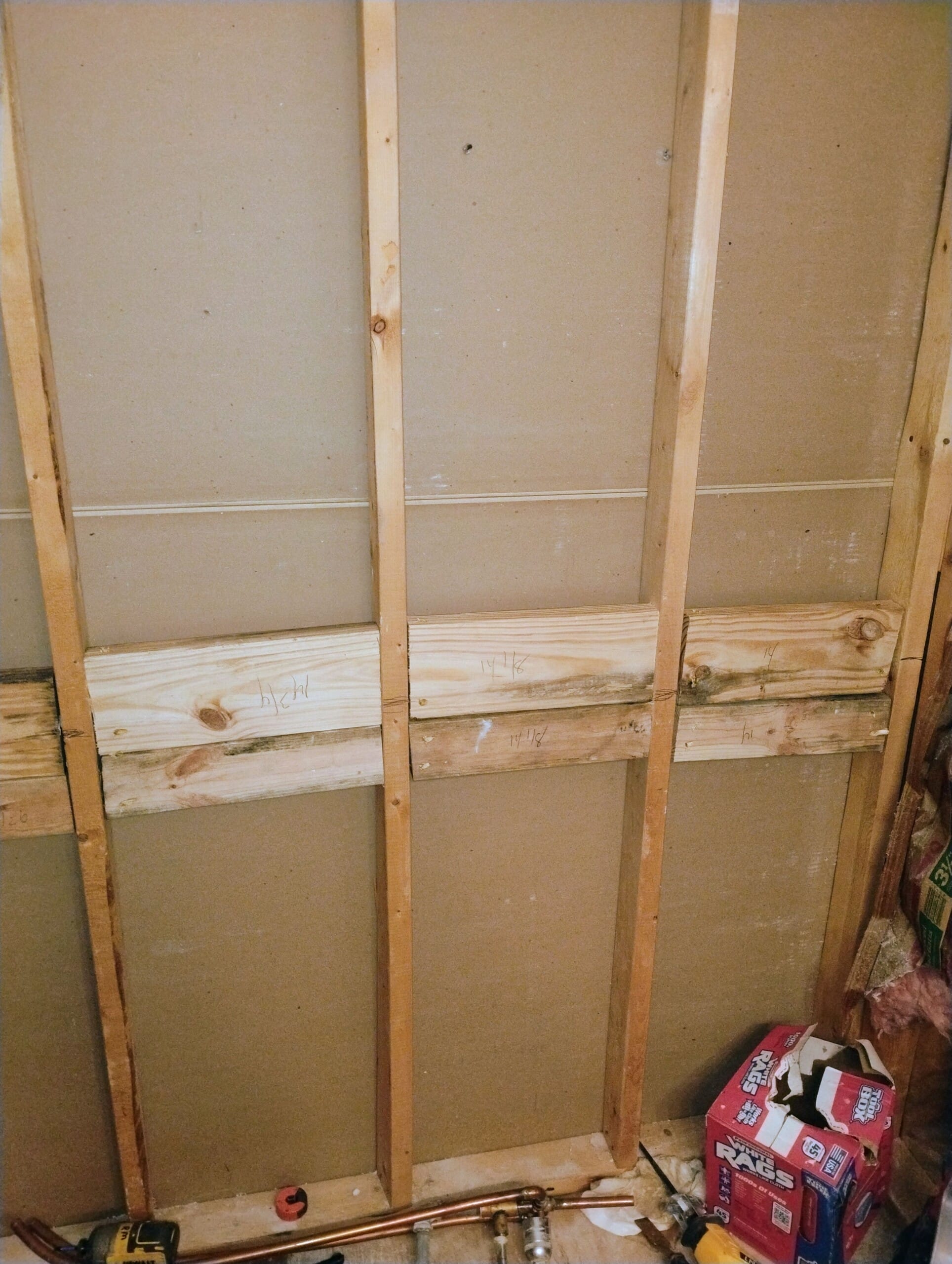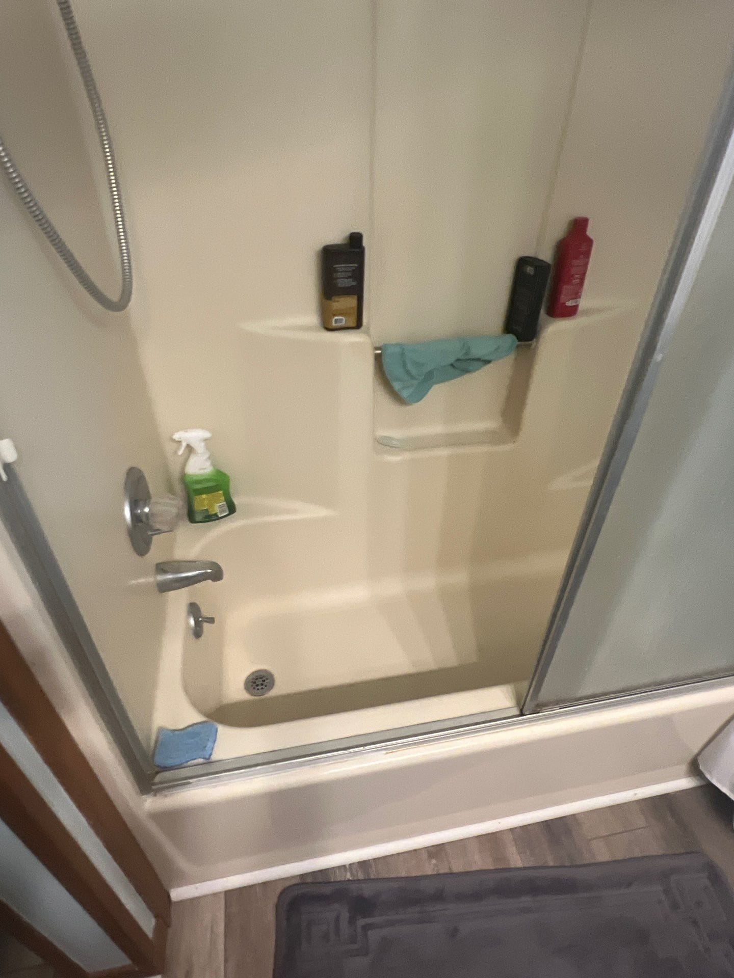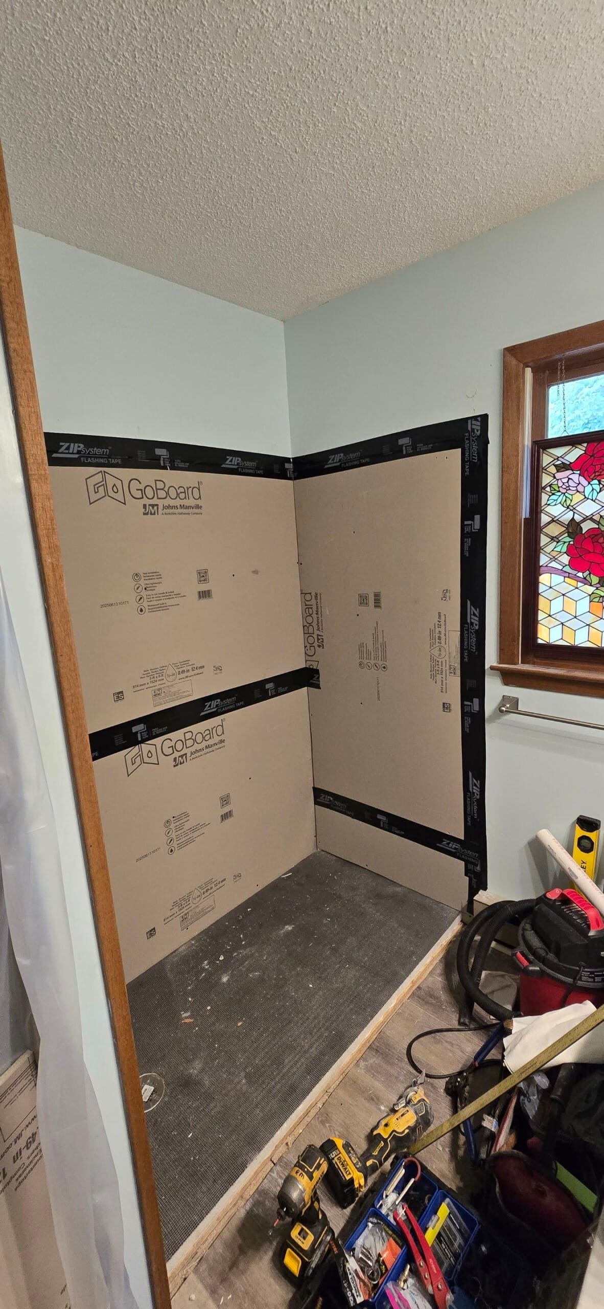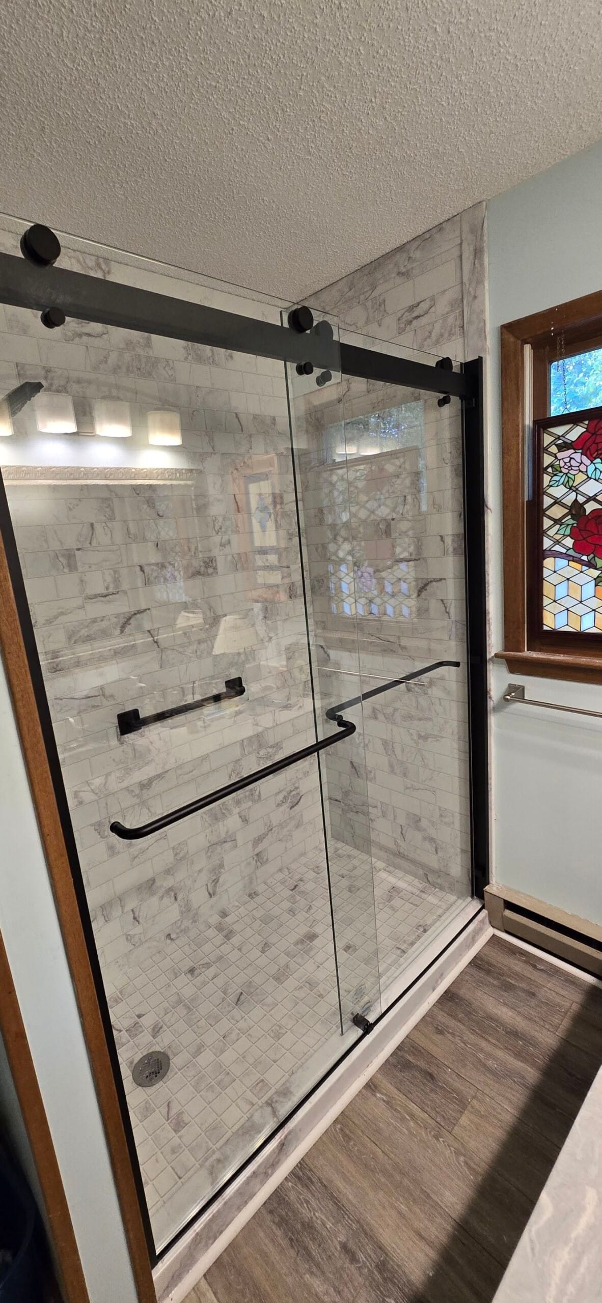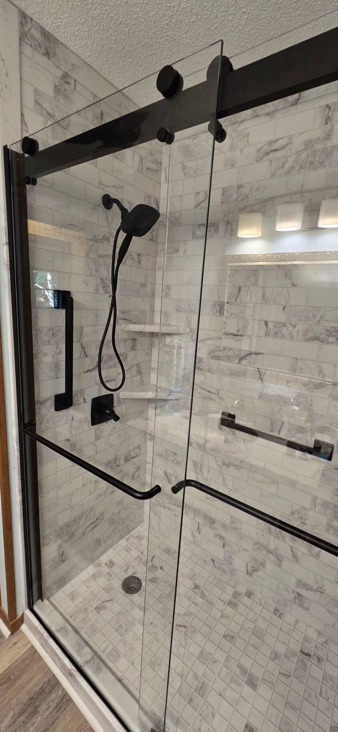 Installation began after a second site measure to confirm fit and material readiness. The team completed a full demolition down to the subfloor, replacing the internal plumbing with Delta-grade commercial metal valves. Go Board was used for full waterproofing, while a quad-lock corner protection system redirected water safely into the solid shower pan. Matte black sliding doors were installed with top-hung hardware for smooth movement and easy cleaning, complemented by integrated corner shelving and a secure grab bar to meet Vicki’s accessibility expectations.