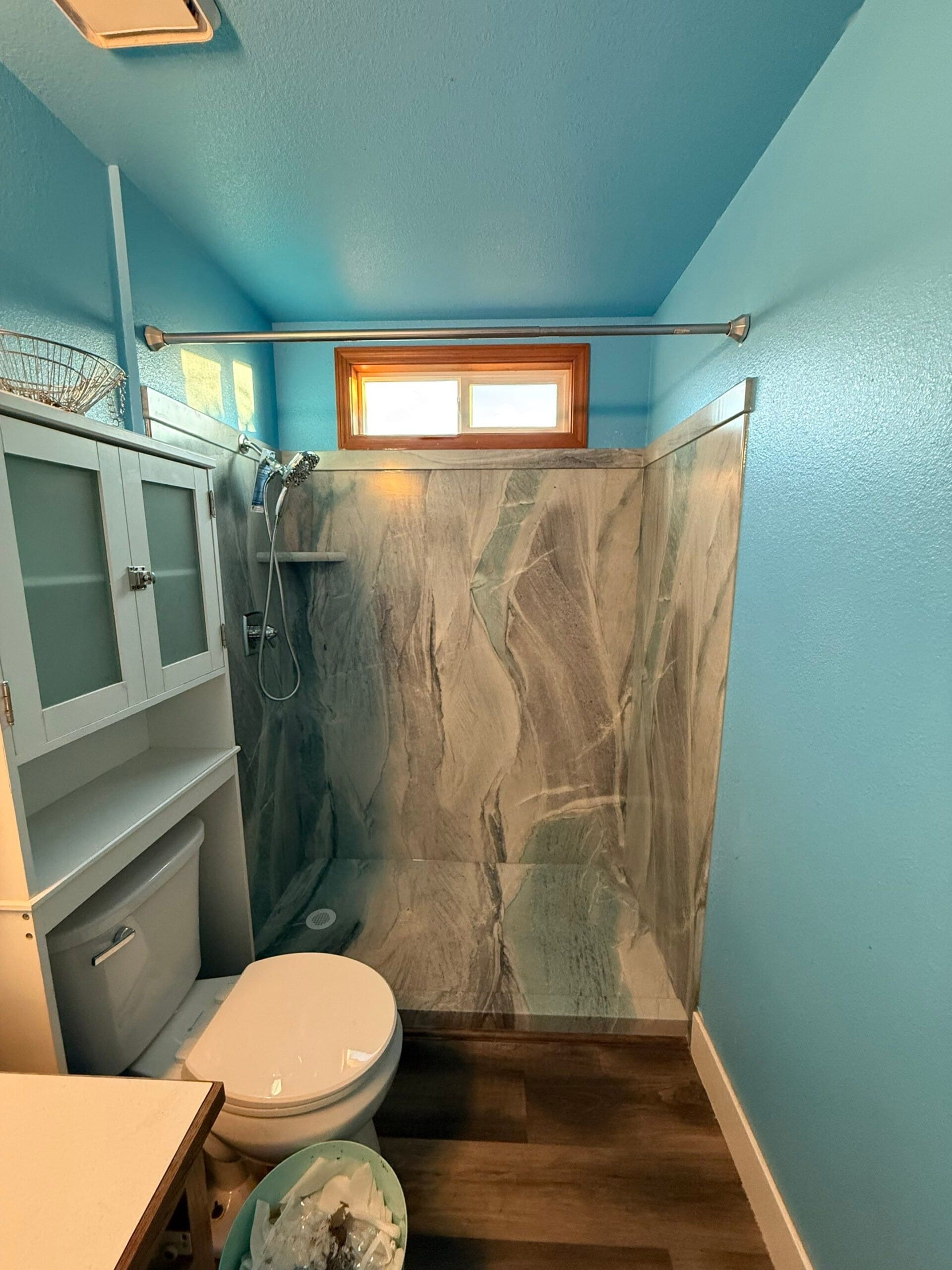 The installation involved a complete demolition down to the studs, followed by the application of the HydroBlock waterproof system and new Delta plumbing fixtures. The updated design features distinct, swirled stone-patterned wall panels with a matching low-threshold shower base for a seamless appearance. A chrome handheld shower system was installed for versatility, along with a single corner shelf for storage. The project also included a tension rod at the entry. Work was completed within a standard two-day timeline following the custom order period, with precise measurements ensuring a tailored fit.