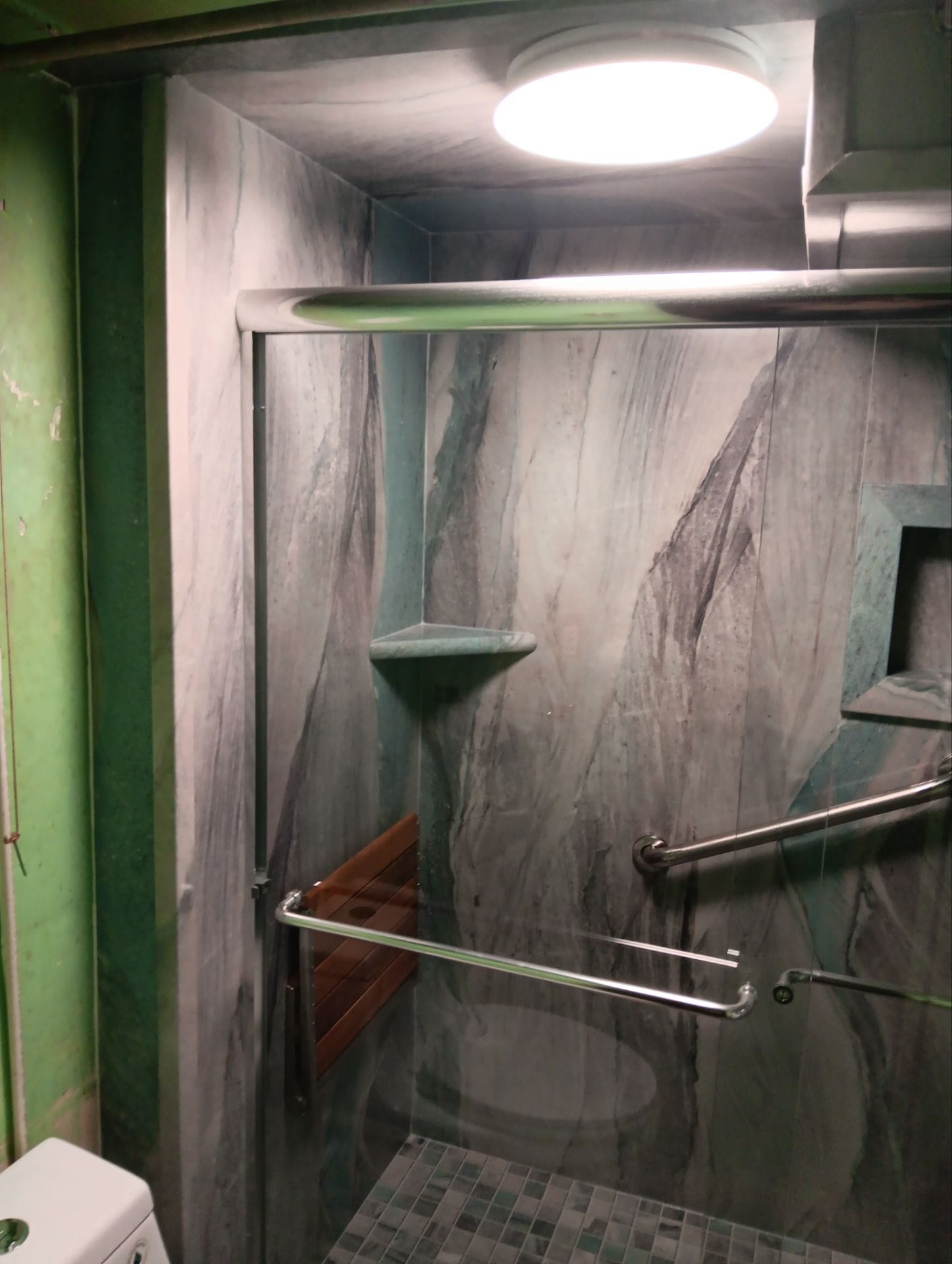 * ADA-compliant walk-in shower with fold-down teak seat and handrails