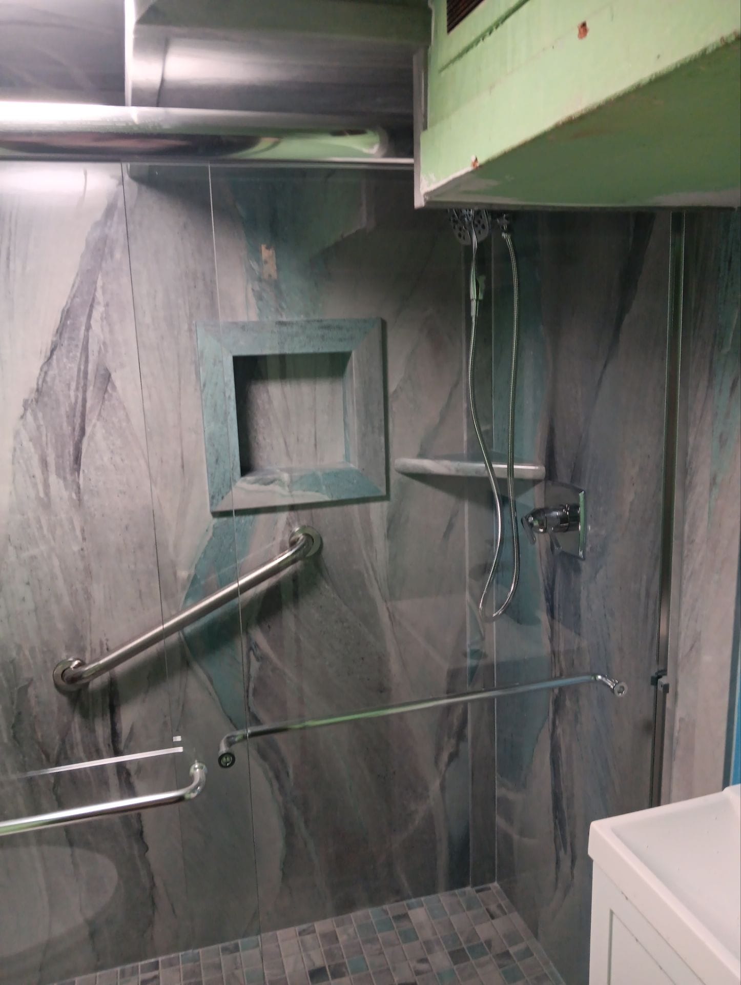 * Smooth, non-porous composite walls in variegated blue-gray stone pattern