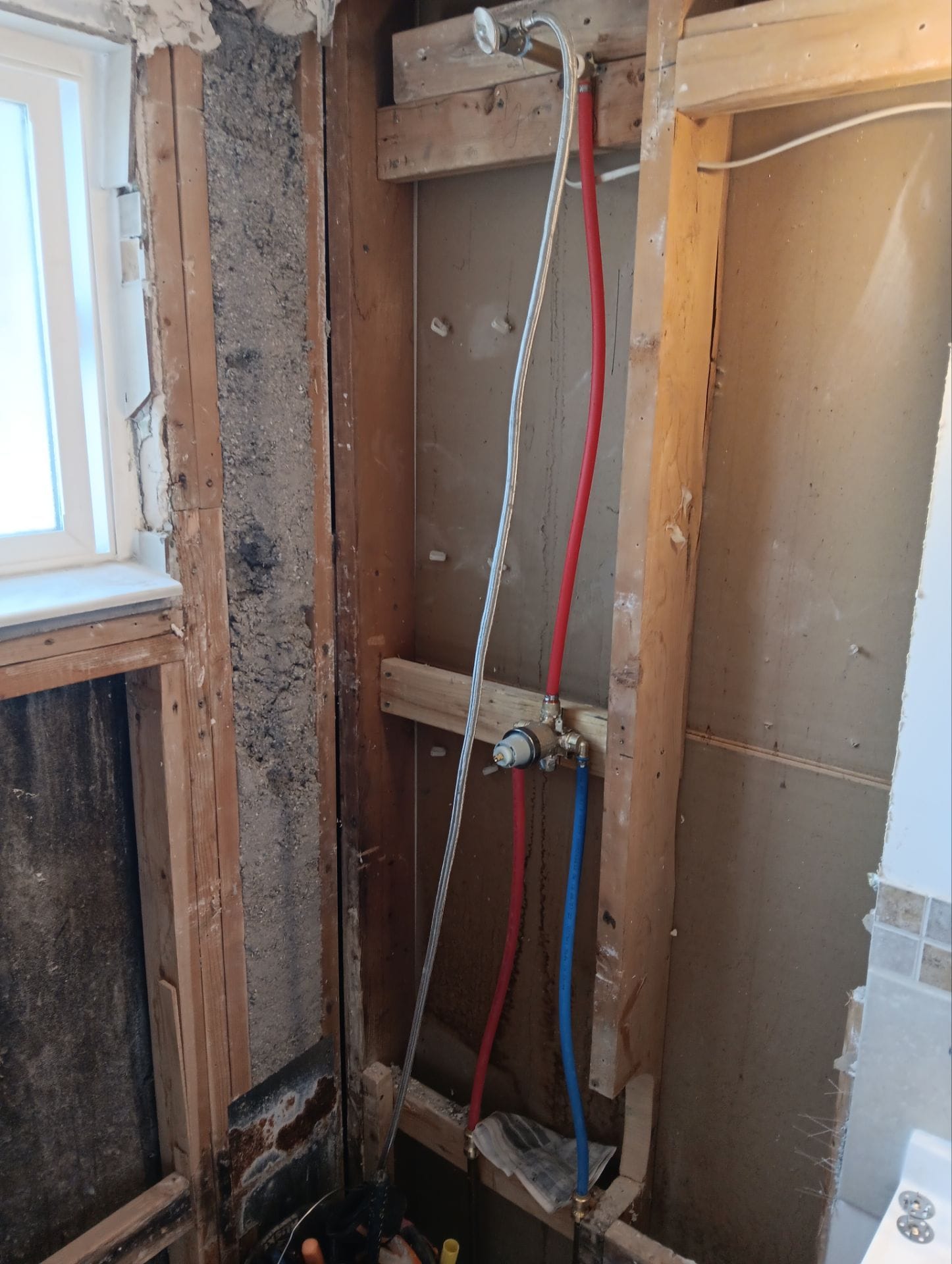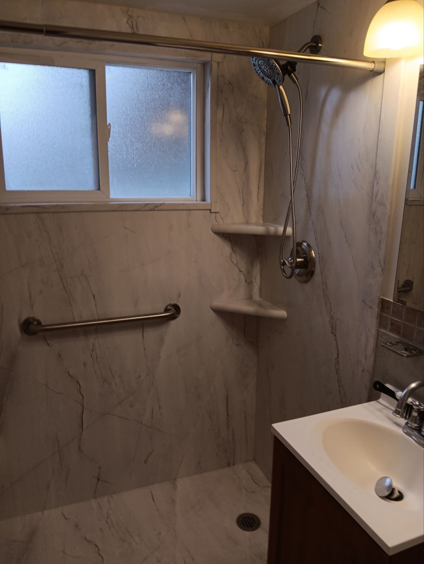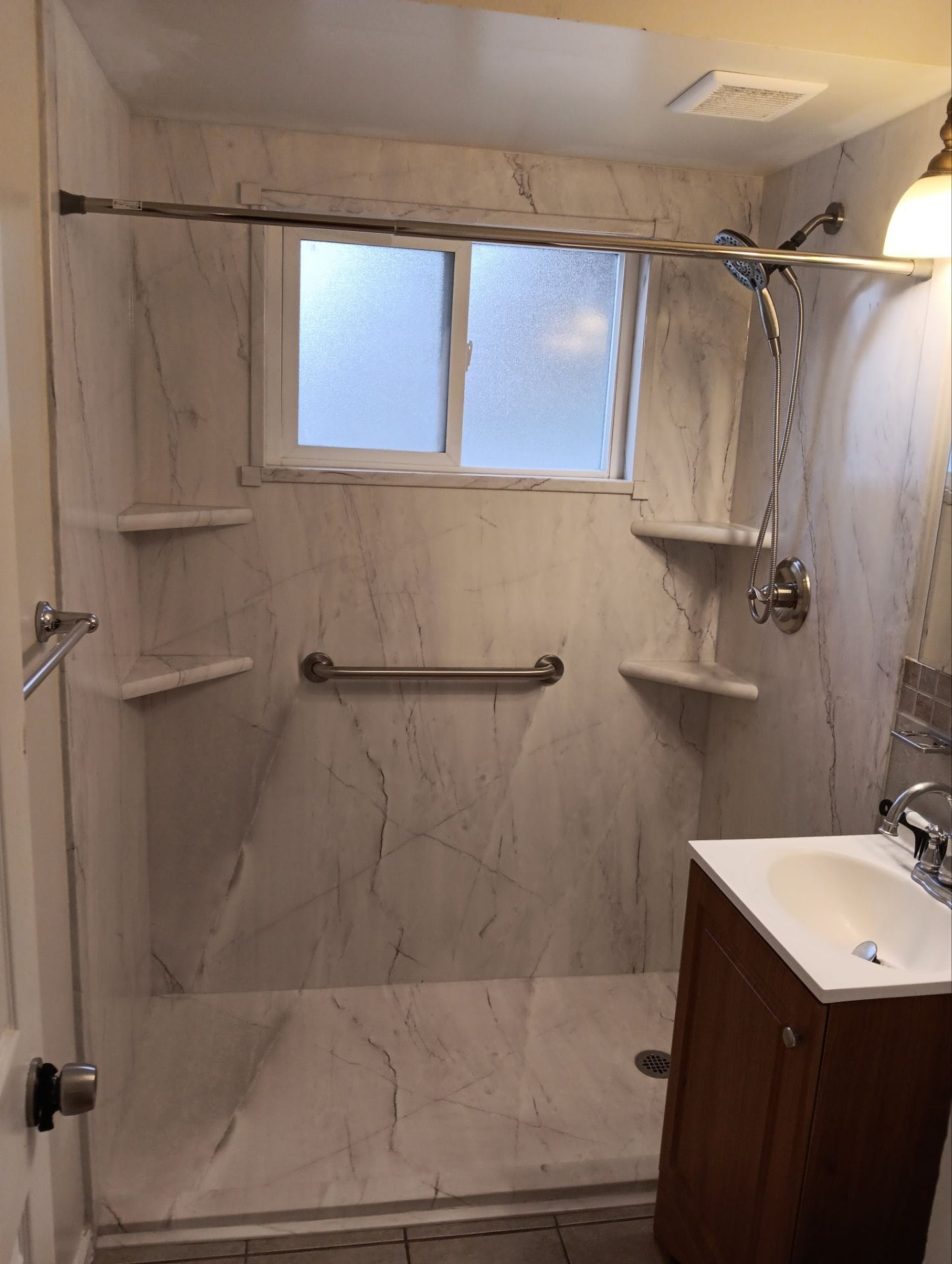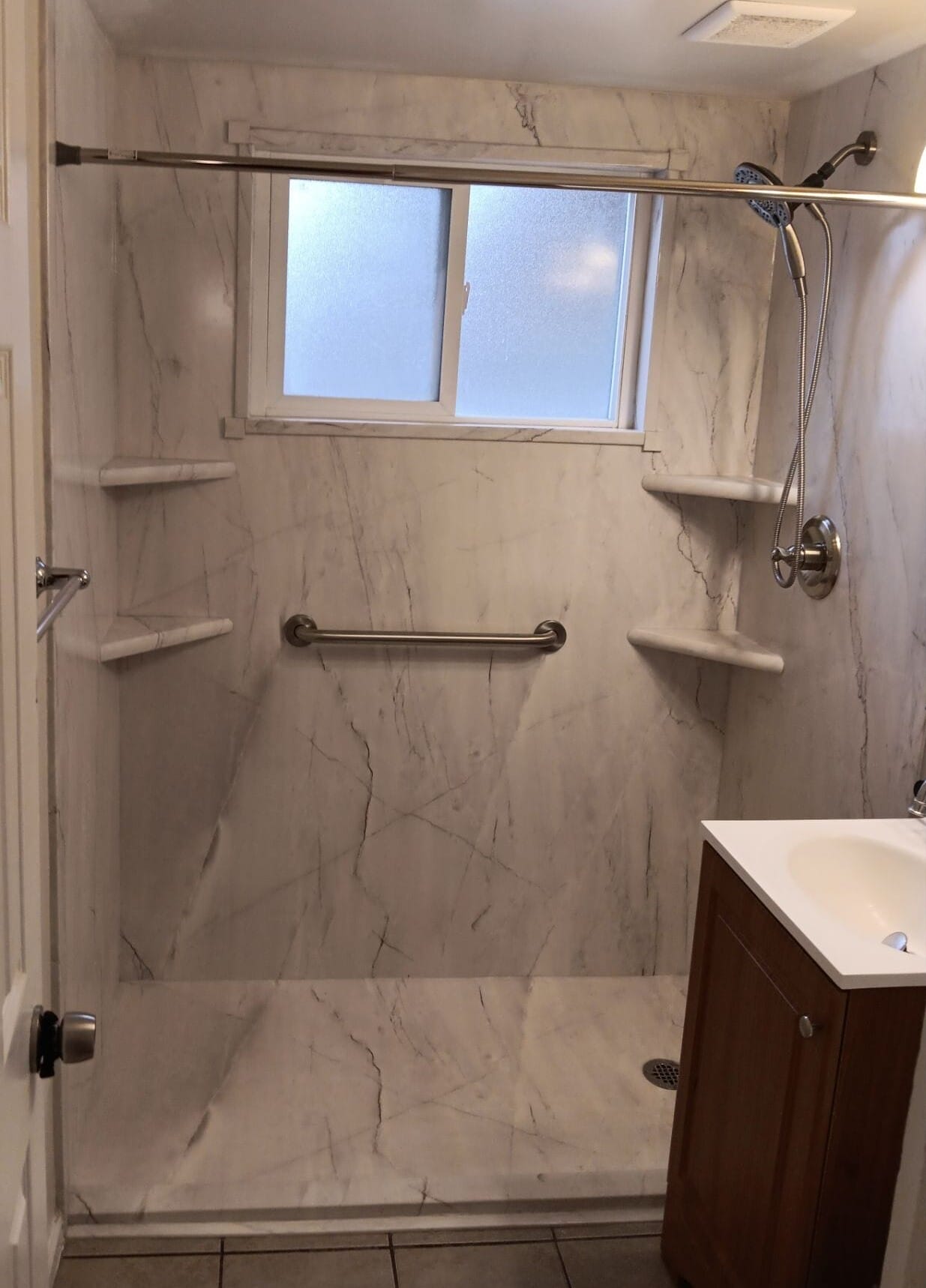 Installation included full demolition of the previous tub and wall tile, preparation of all plumbing to code, and application of a seamless wall system in a natural stone-style finish. A low-threshold base was installed for safer entry, and corner shelves were securely positioned for daily storage needs. An ADA-compliant grab bar was placed horizontally across the back wall for support. A new curtain rod was added in place of a glass door, and the upgraded system was completed in under two days by certified Five Star Bath Solutions staff.