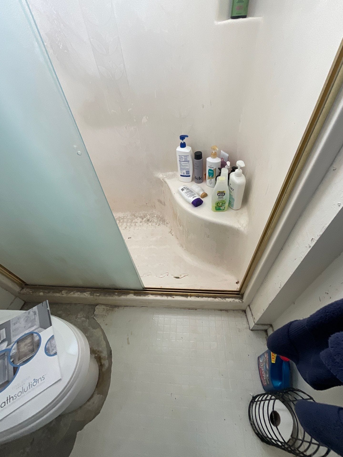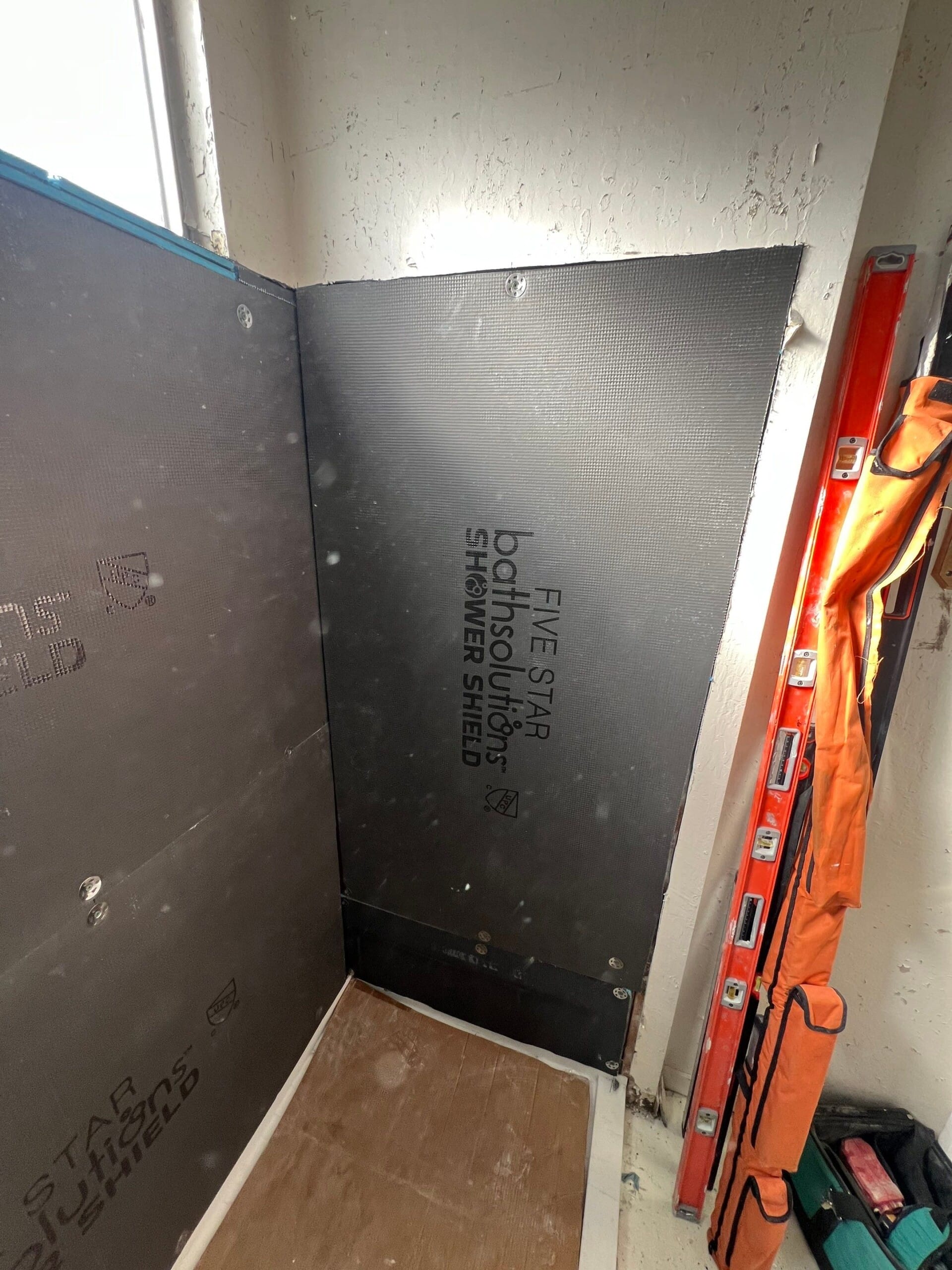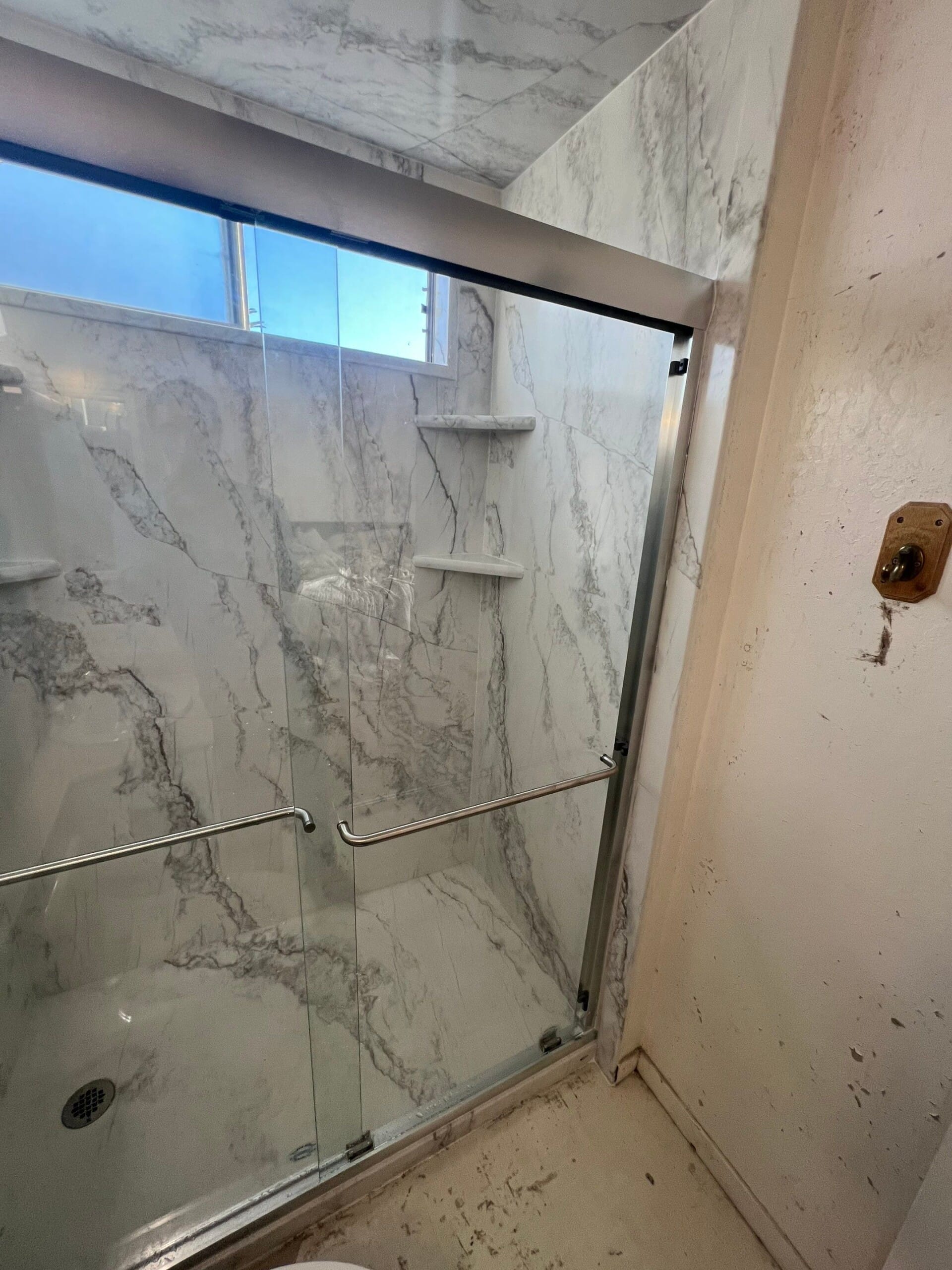 Installation was completed in under four days and began with full demolition of the original shower enclosure to the studs. Necessary framing adjustments and waterproof backing were installed prior to securing the custom pan and composite walls. The overhead ceiling panel was also upgraded to match the new wall system, creating a cohesive appearance. A Delta pressure valve and brushed nickel handheld fixture were installed, along with dual horizontal grab bars for added safety. Work was performed by certified in-house installers, with HOA-compliant insurance documentation and daily site cleanup included throughout the process.