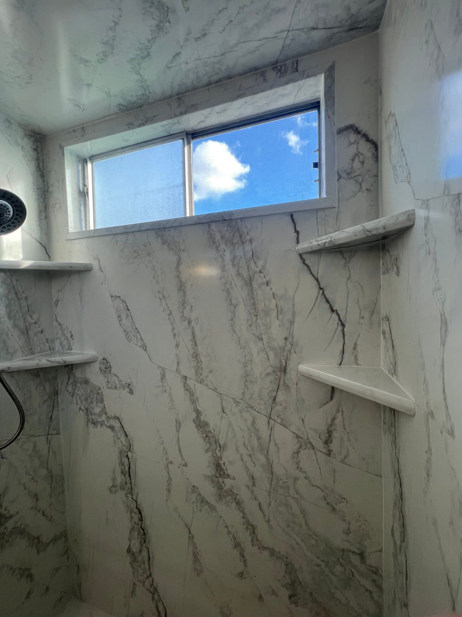 Five Star Bath Solutions presented the Smart Choice system, built from 100% PVC composite with antimicrobial, non-porous, and water-resistant surfaces. The selected Calacatta-style wall panels introduced a light, marbled look consistent with the couple’s desire for brightness while maintaining rustic appeal. While matte black fixtures and a teak bench were originally preferred, the final remodel utilized brushed nickel fixtures and frameless sliding glass doors. Two integrated corner shelves and a recessed shaving step replaced bulky accessories, keeping the enclosure clean and open. The team ensured that the installation addressed concerns about second-floor moisture protection, including sealing around the ceiling and window area.