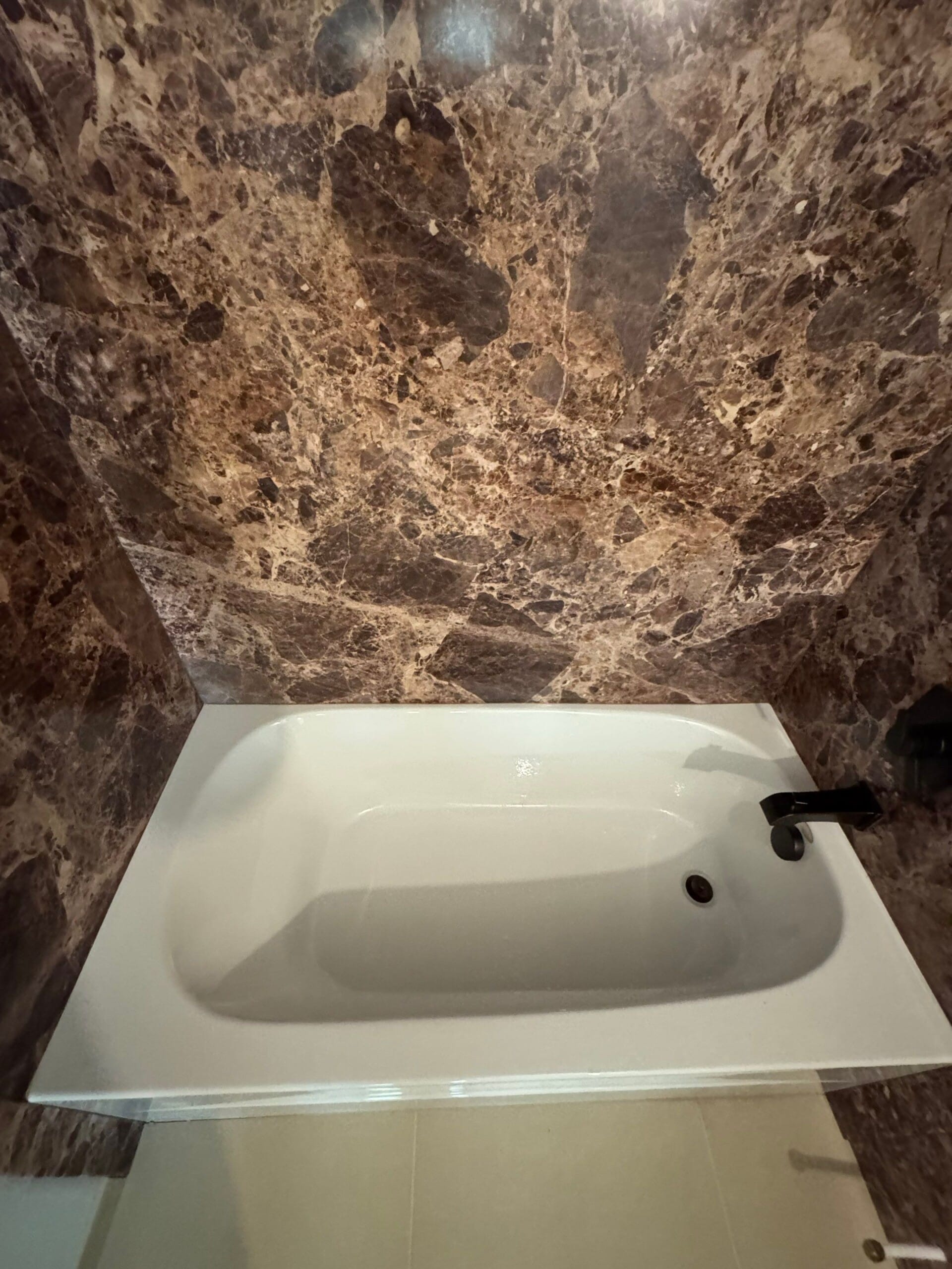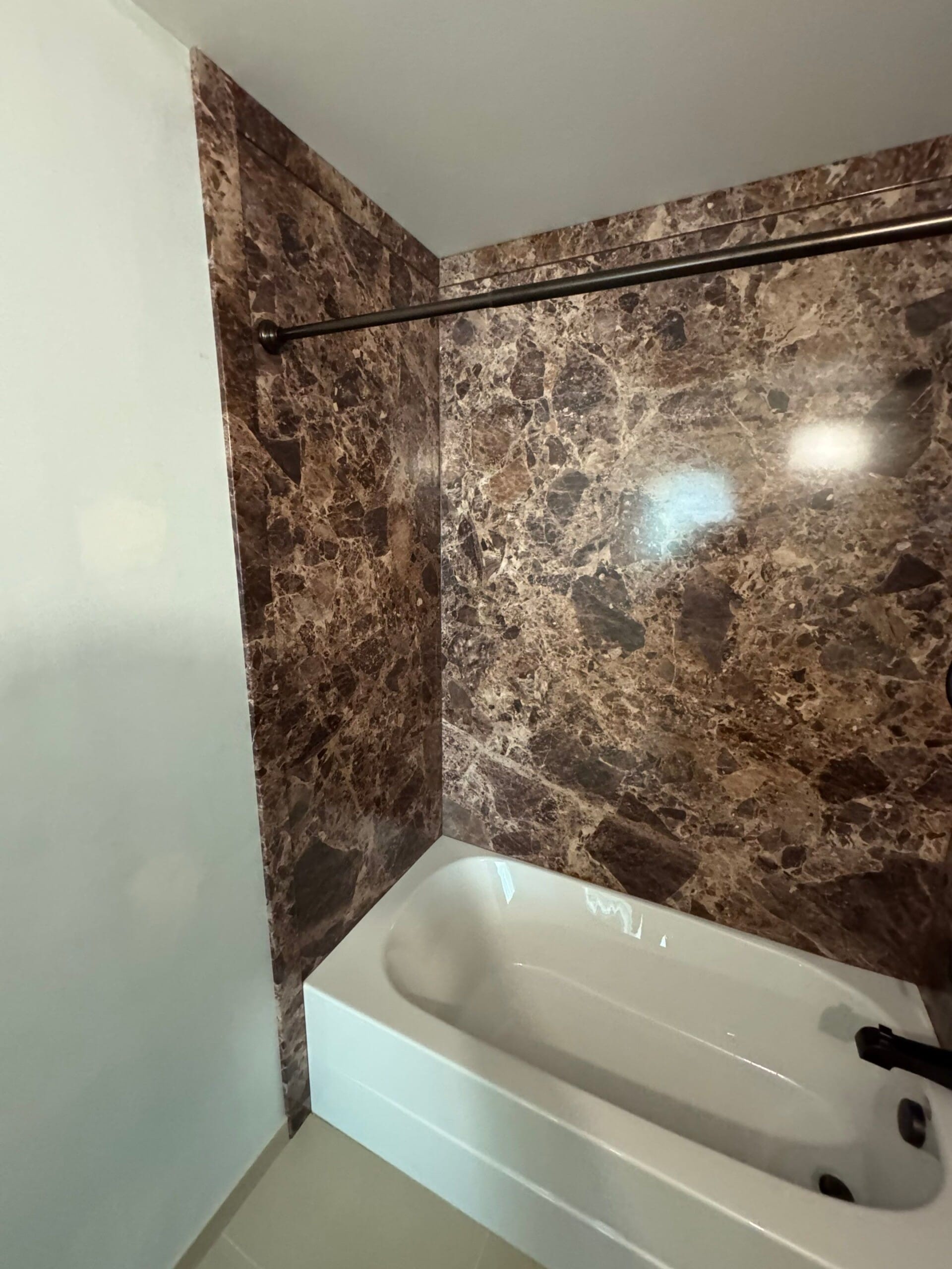 Antigone McKenna introduced the Smart Choice composite system, which she positioned as the most durable and visually appealing option available. The six-layer composite panels offer antimicrobial and scratch-resistant protection while closely mimicking the look of natural stone. The selected finish—a rich, deep brown marble pattern—was chosen for its warmth and harmony with the rest of the bathroom. While brushed nickel was initially requested, the final selection included oil-rubbed bronze fixtures for a more balanced match with the new design. The bow-front almond-colored tub was custom installed to maintain water capacity without affecting the layout or flooring.