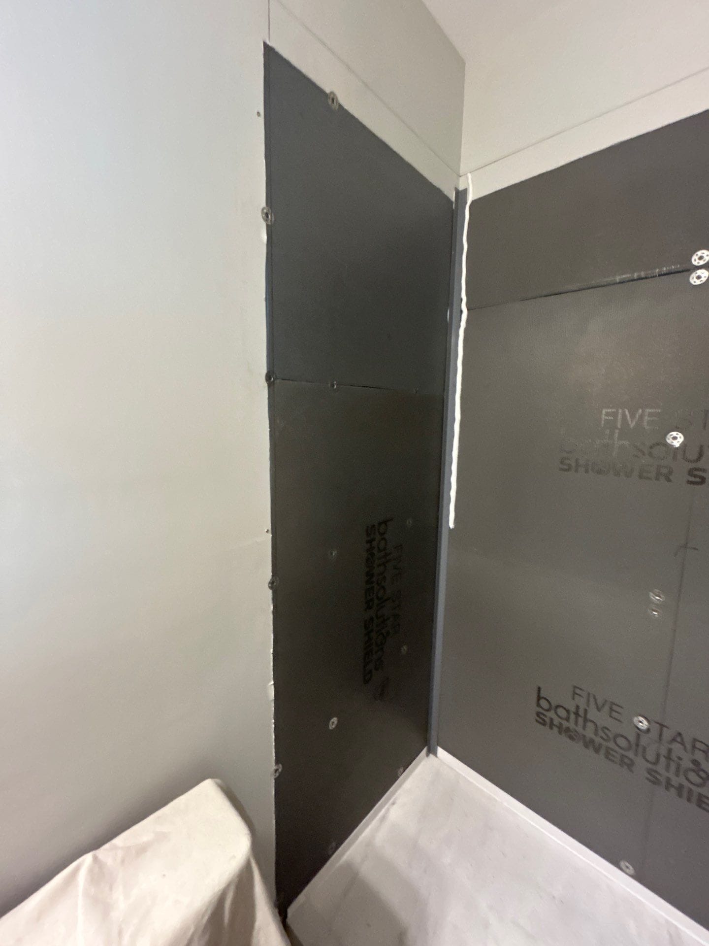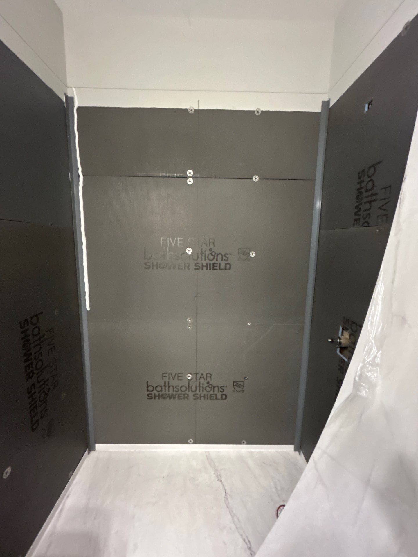 * Centrel composite grout-free wall panels in light stone finish
