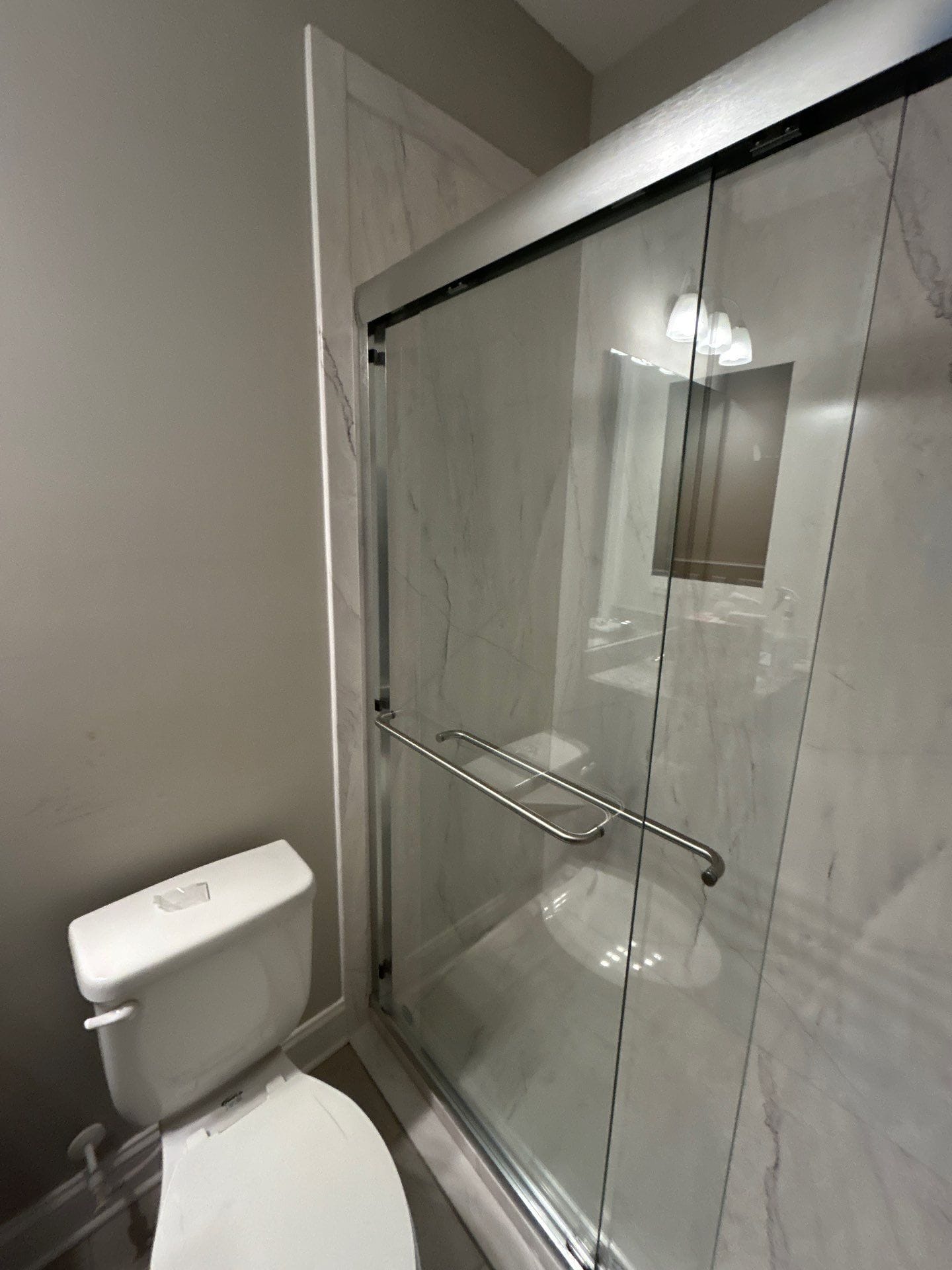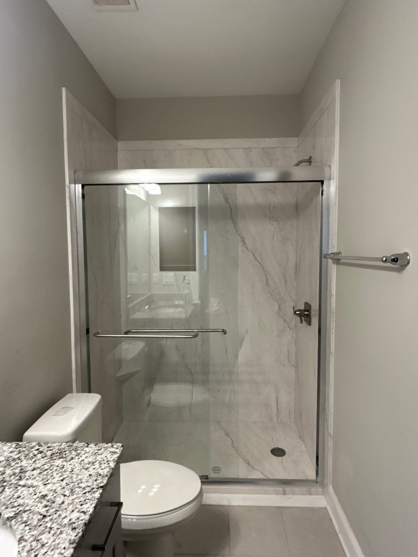 Installation involved full removal of the tile and bathtub down to the studs, followed by structural inspection and waterproof system application. A low-threshold textured shower pan was installed for slip resistance, along with new PEX piping for better durability. Three brushed nickel grab bars were mounted for safe movement, and a fold-down corner bench was integrated for seated bathing. Wall panels in a light marble tone extended floor to ceiling, coordinating with existing floor tile and preserving visual continuity. A frameless barn-style sliding glass door was installed with a brushed nickel towel bar handle and easy-glide system.
