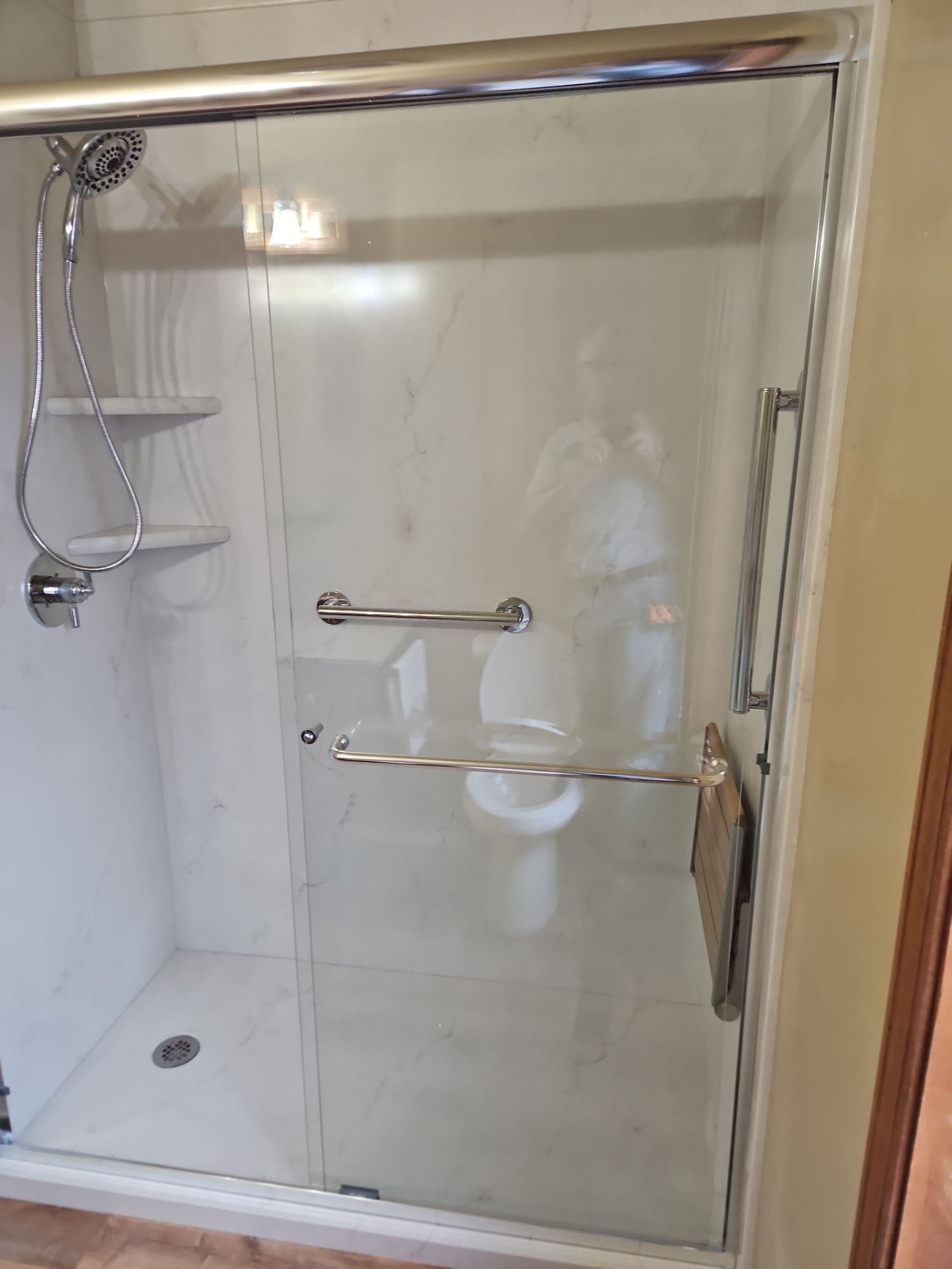 The Representative explained that the installation process begins with full demolition of the existing tub and surround, followed by inspection of plumbing and structural components. The system is then rebuilt using a waterproof cement-based backer and a properly sloped shower pan to ensure effective drainage. The wall panels are custom-fit to the space, extending fully to create a seamless appearance, while reinforced blocking is installed to support accessories such as grab bars and a fold-down seat. The process is organized and efficient, with careful preparation and cleanup, resulting in a complete transformation from the older tub setup to a fully enclosed walk-in shower with sliding glass doors.