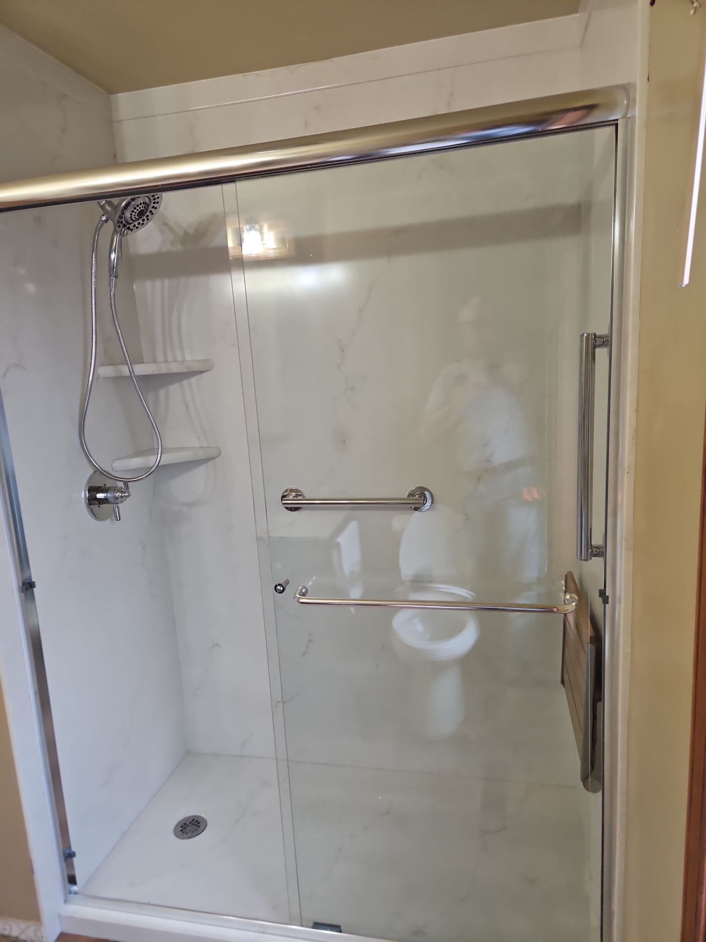 The Representative presented a solution focused on delivering a modern, low-maintenance walk-in shower system using durable, grout-free wall panels inspired by real stone patterns. The upgraded space reflects a clean, bright marble-style finish with subtle veining, paired with sleek glass sliding doors and chrome fixtures that elevate the overall appearance. The Representative emphasized the reliability of the materials, the consistency of the design, and the ease of maintenance compared to traditional tile, eliminating concerns about grout failure or moisture penetration. Confidence was reinforced through discussion of company experience, strong reputation, and commitment to quality installation backed by proper insurance and proven products.