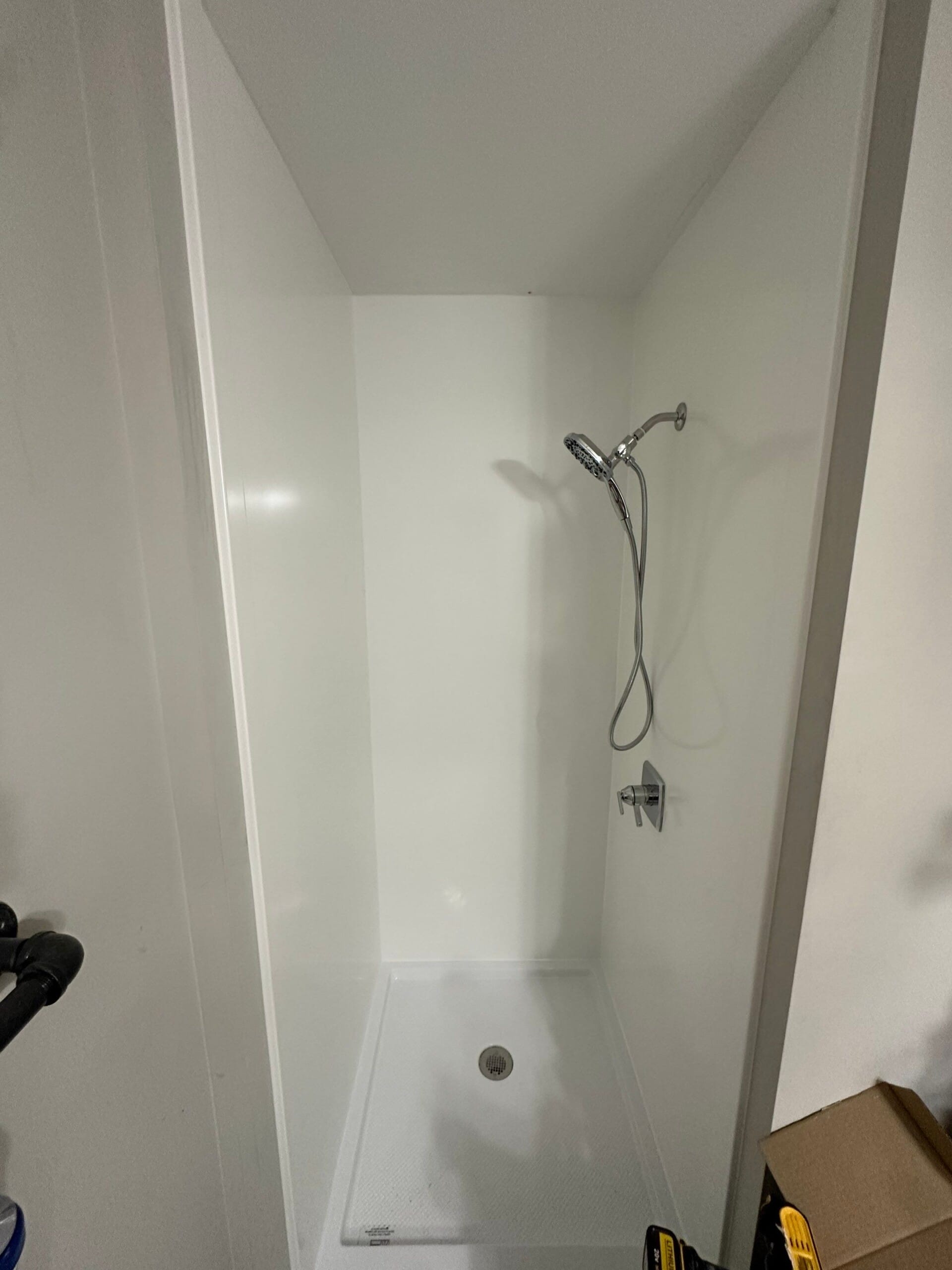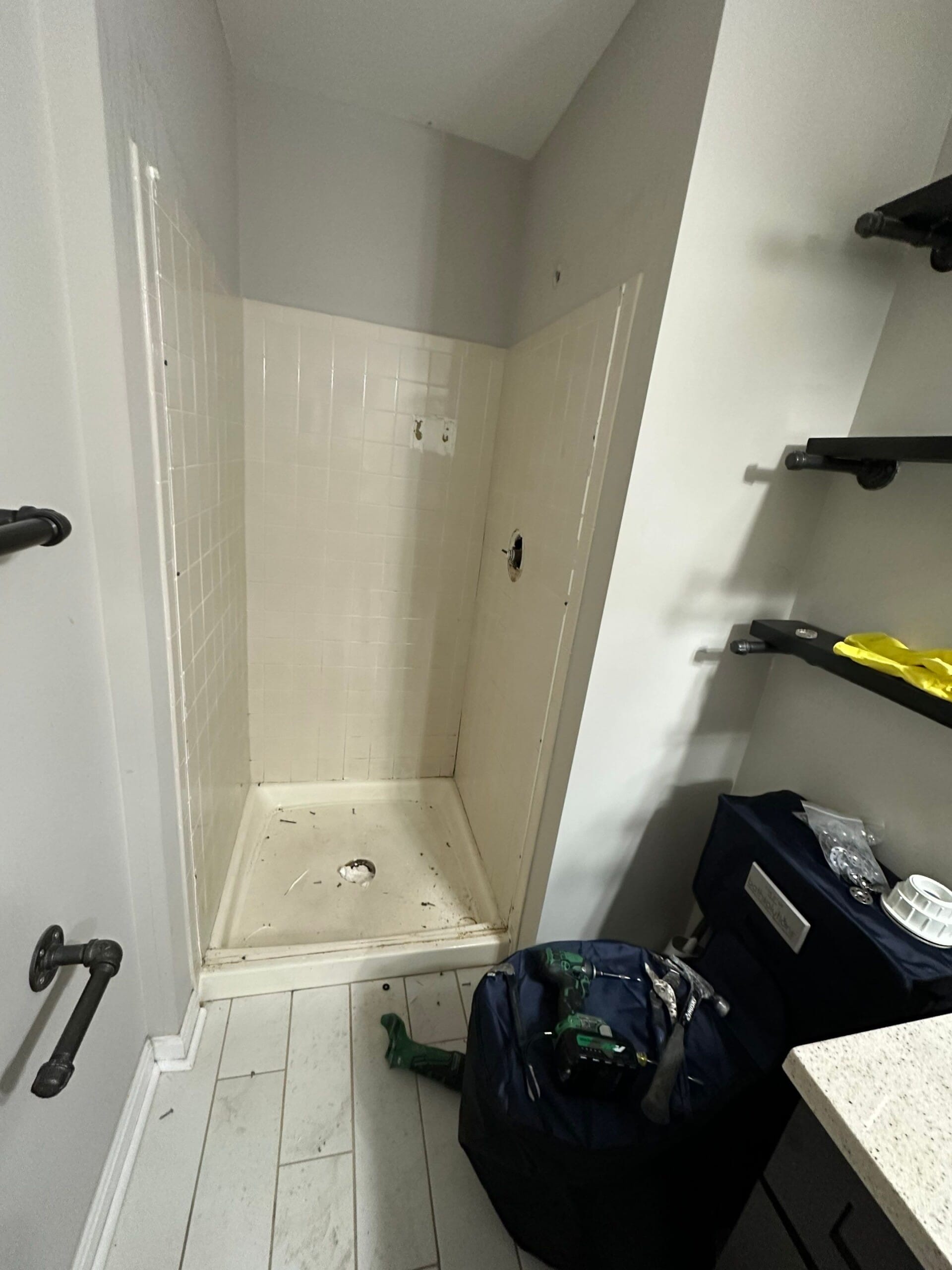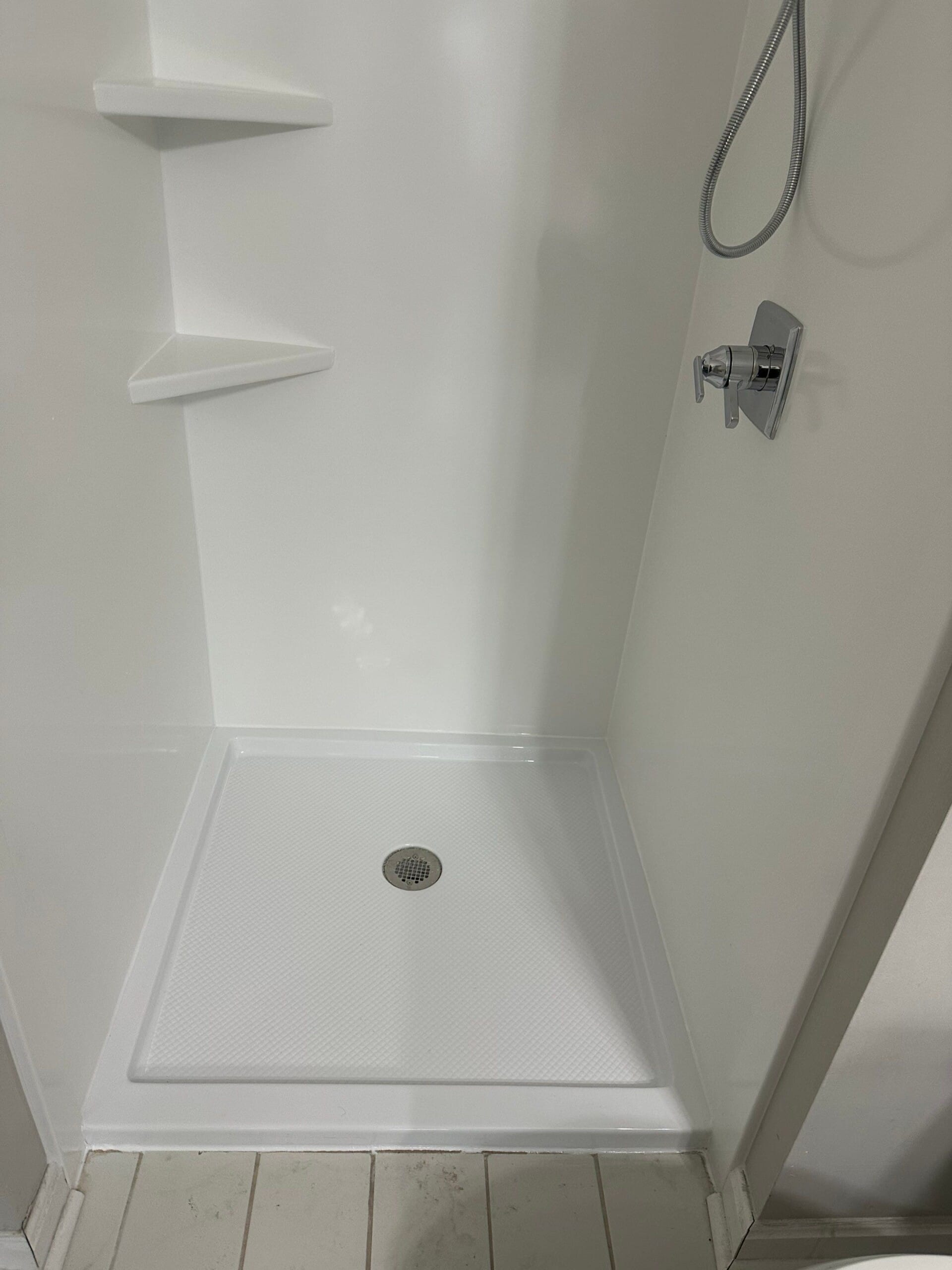 Installation was completed by trained, in-house professionals over a multi-day process. The project included removal of the existing shower enclosure, wall materials, and fixtures, followed by preparation of the space and installation of a new shower base, wall panels, and updated plumbing components. Waterproof backer materials and sealing systems were used to ensure long-term performance. The new configuration maintains a walk-in style with an open entry, eliminating the previous framed enclosure and improving accessibility within the space. The work area was protected throughout the process and fully cleaned upon completion.