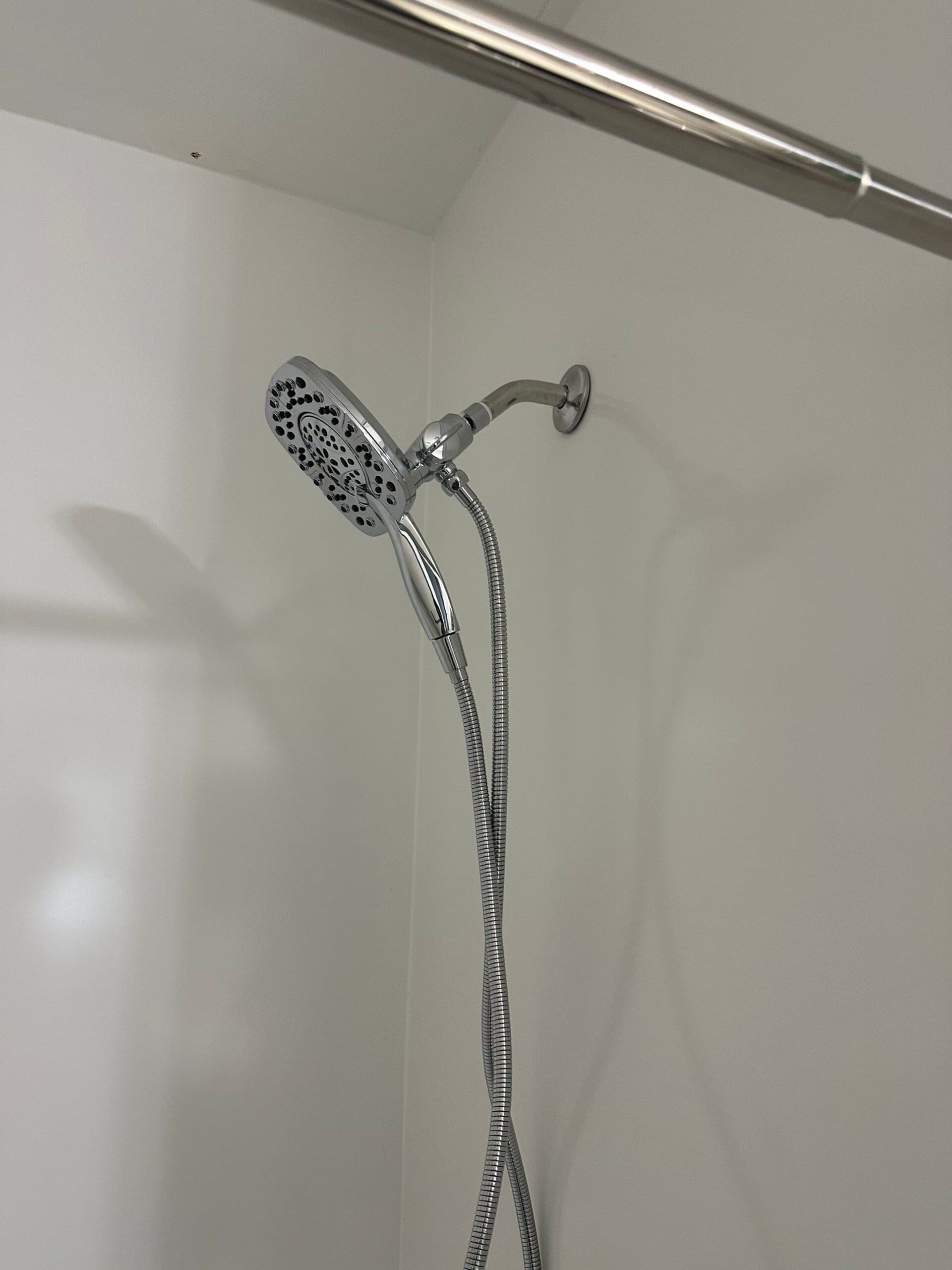The Five Star Bath Solutions representative presented a grout-free composite wall system designed to deliver a smooth, low-maintenance surface with a clean white appearance. The selected finish reflects a bright, solid tone consistent with the updated space shown, eliminating grout lines and reducing long-term upkeep. Chrome fixtures were chosen to match the existing plumbing style, including a handheld showerhead for added versatility. Integrated corner shelving was included to provide storage within the shower footprint without adding bulk. The system is designed for durability, water resistance, and ease of cleaning, aligning with the customer’s request for a functional and modern upgrade.