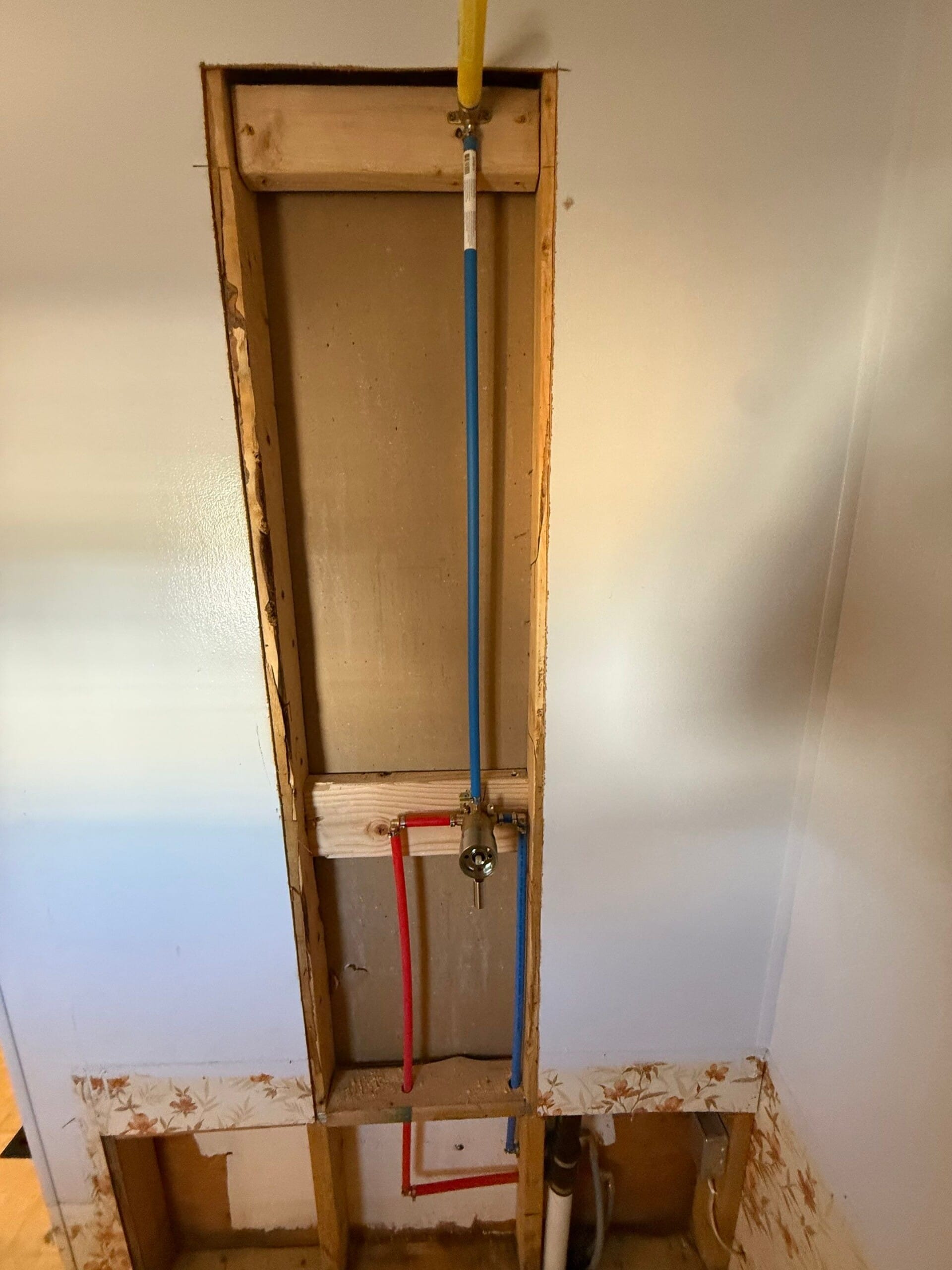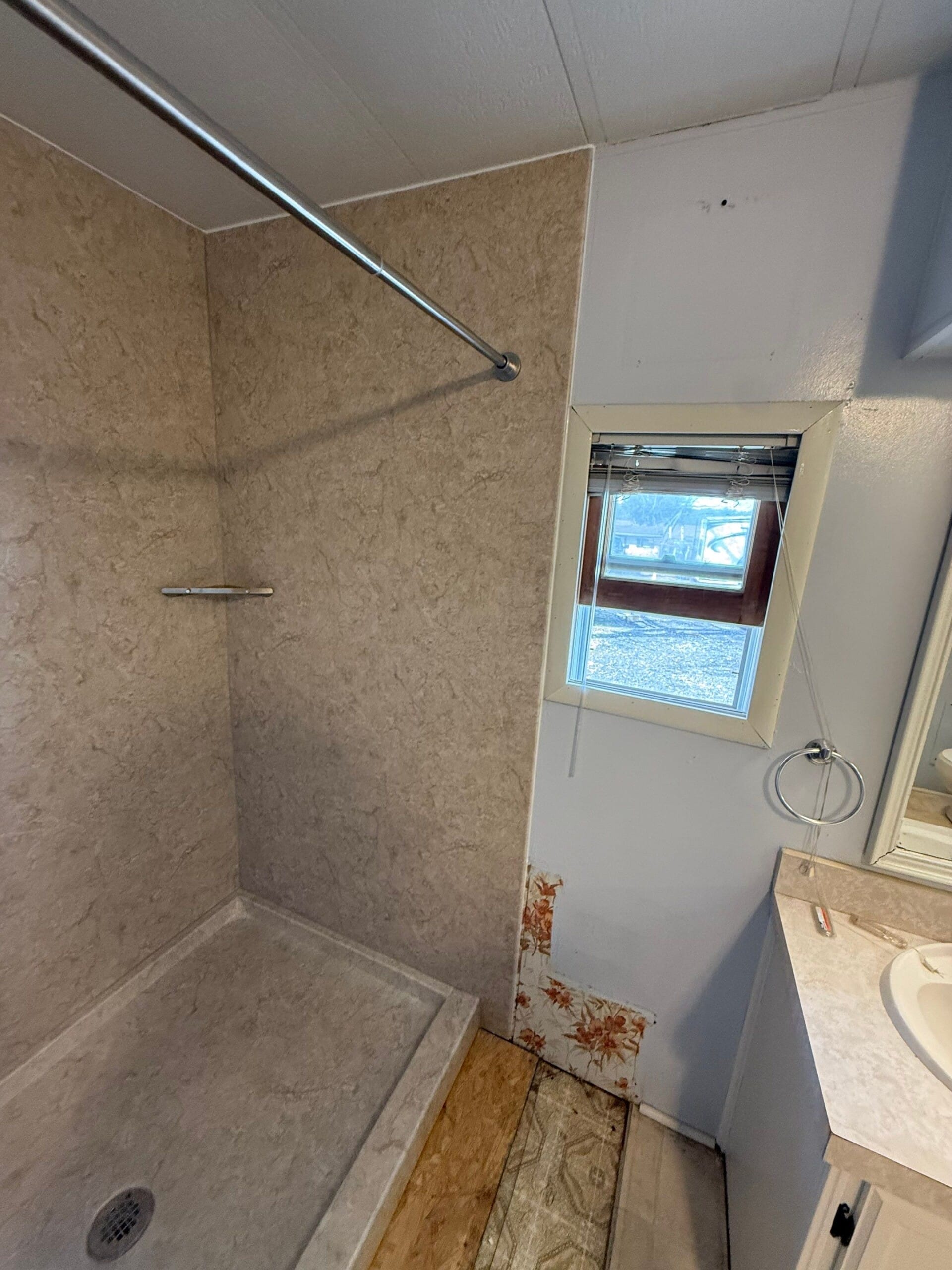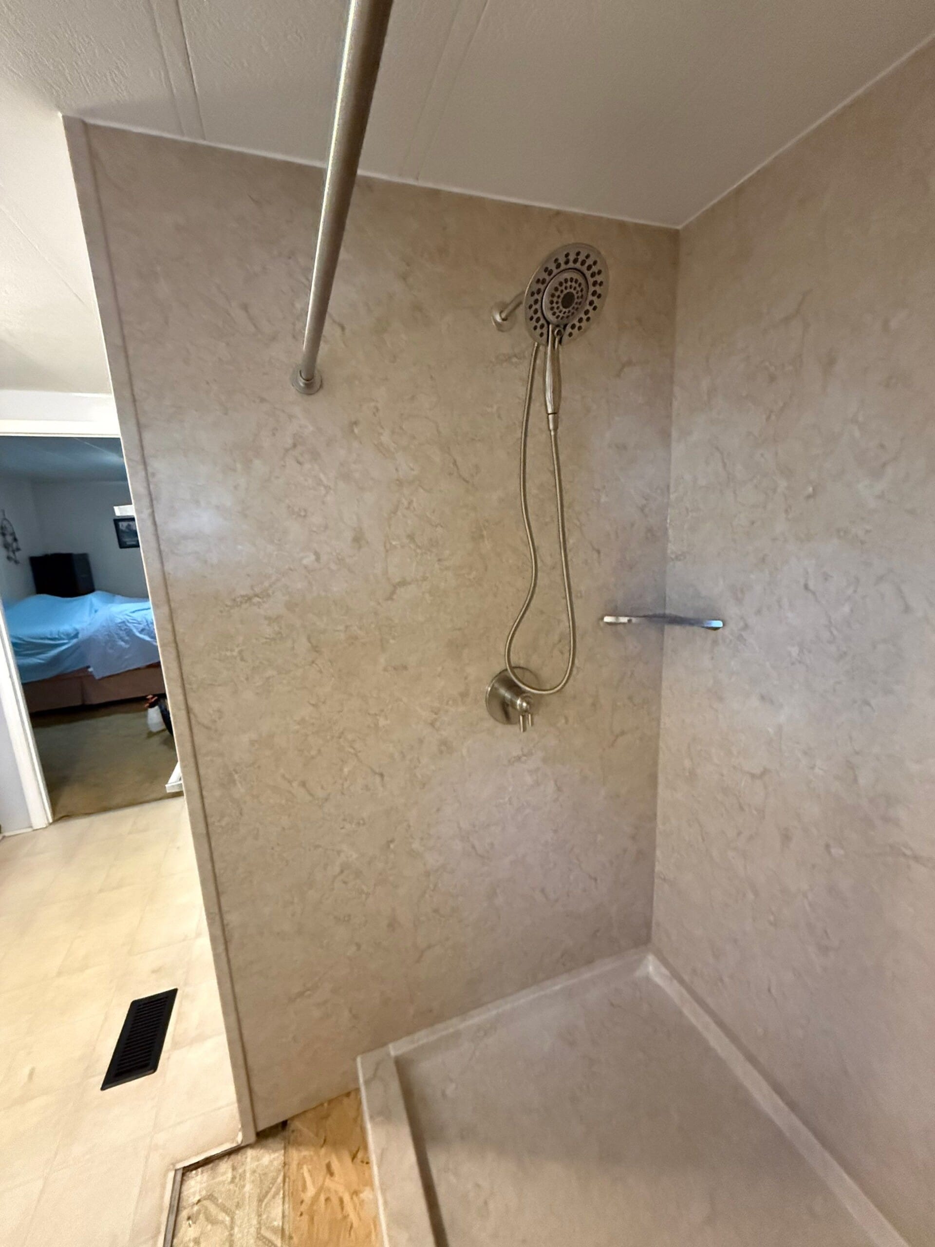 Installation was completed as a two-day project. The existing tub and surrounding materials were removed down to the framing, followed by inspection and preparation of the wet area. A new low-threshold shower base and waterproof backing system were installed, along with composite wall panels and plumbing fixtures. The team completed sealing, cleanup, and final detailing on-site, ensuring the space was left functional and ready for use without requiring extended disruption.