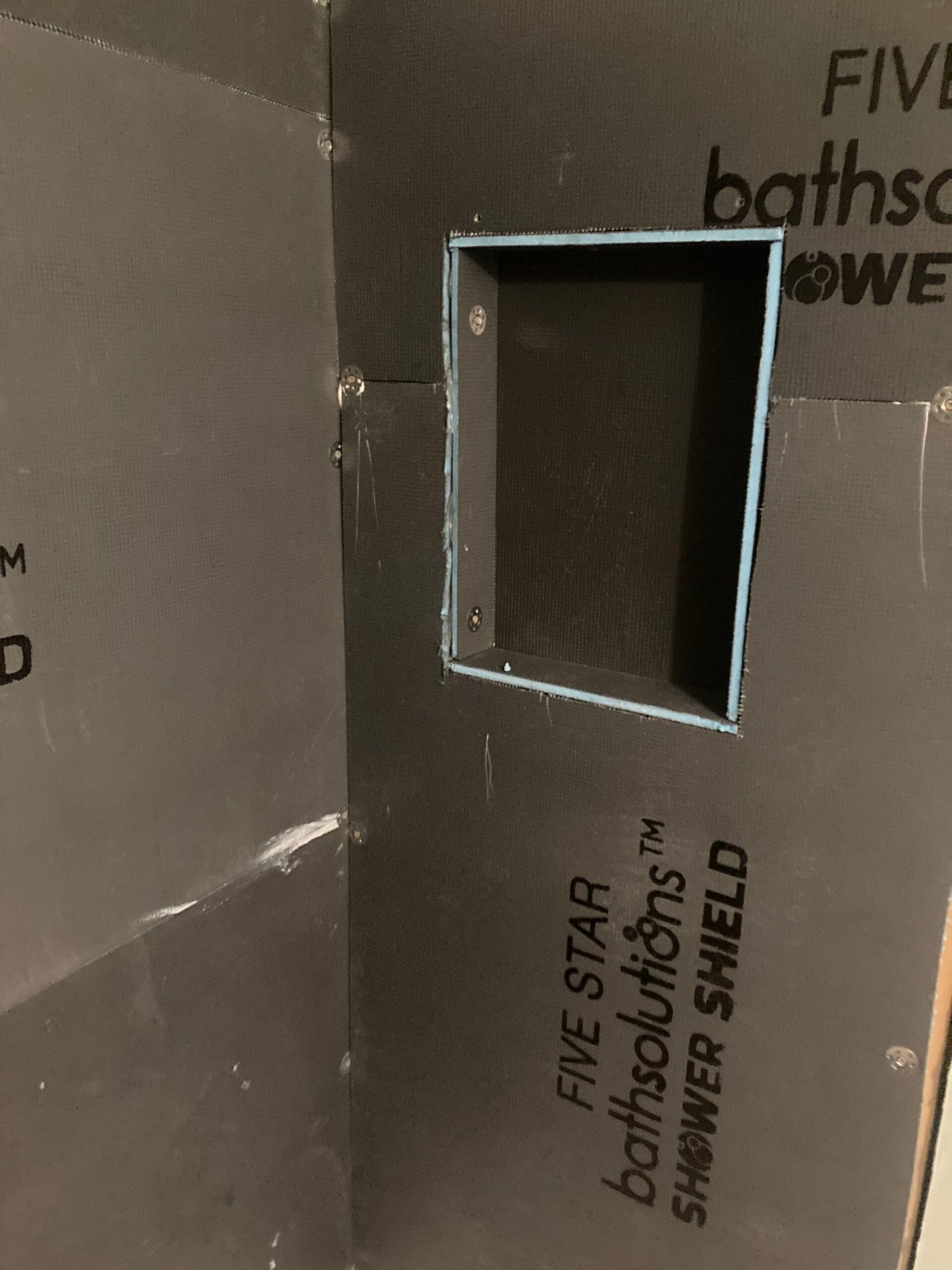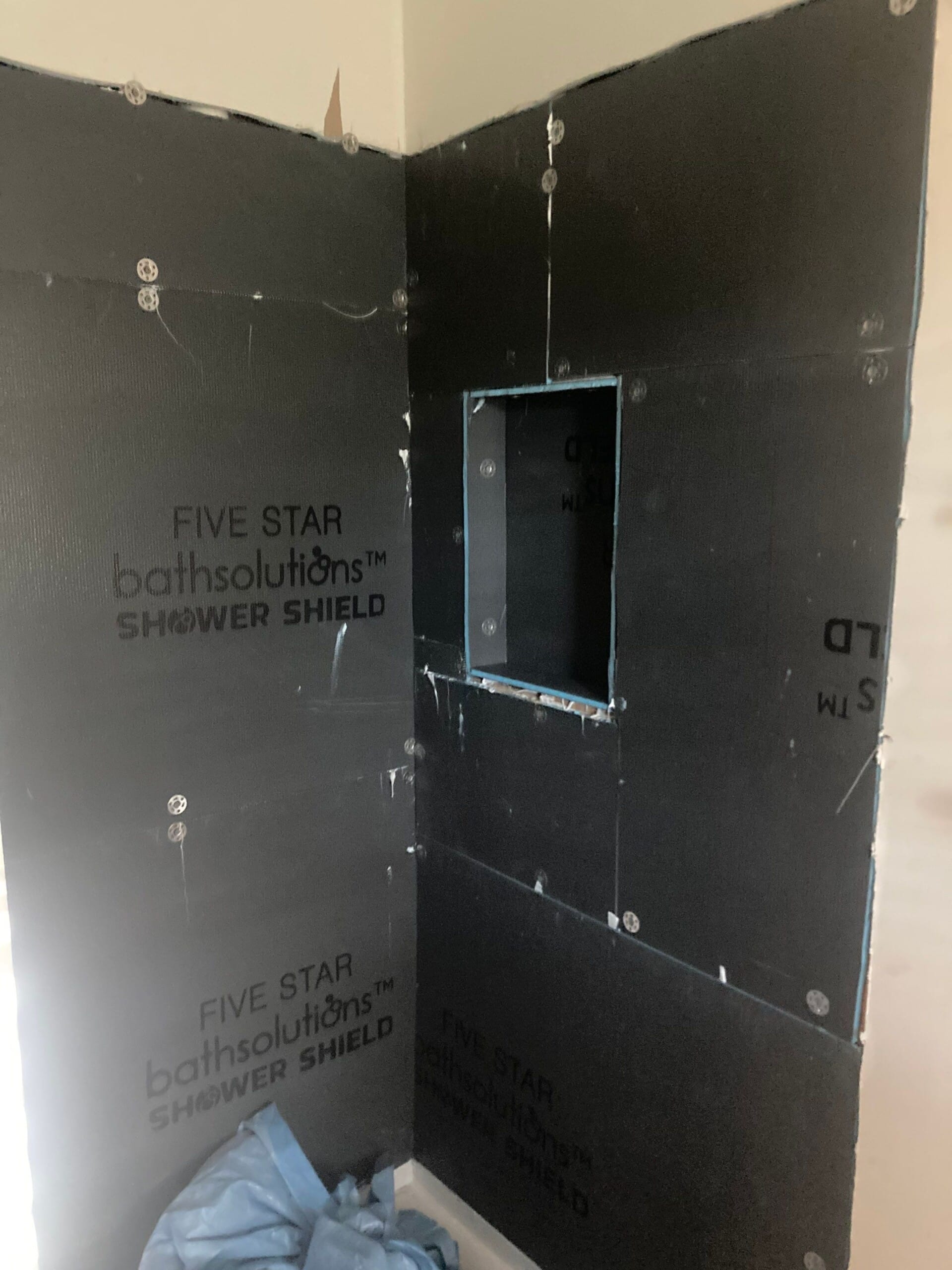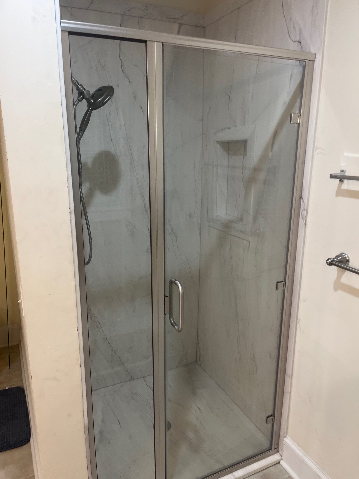 Installation was performed by certified in-house employees, following standard full-demolition protocol. Walls were stripped to the studs, inspected, and rebuilt using waterproof shower shield backer board. New plumbing lines and marine-grade silicone sealing were applied throughout. Panels reached ceiling height, and fixture placement was customized. A recessed niche replaced the previously tiled corner shelving. The remodel was completed within the scheduled two-to-three day window, in line with the customer’s move-in timeline.