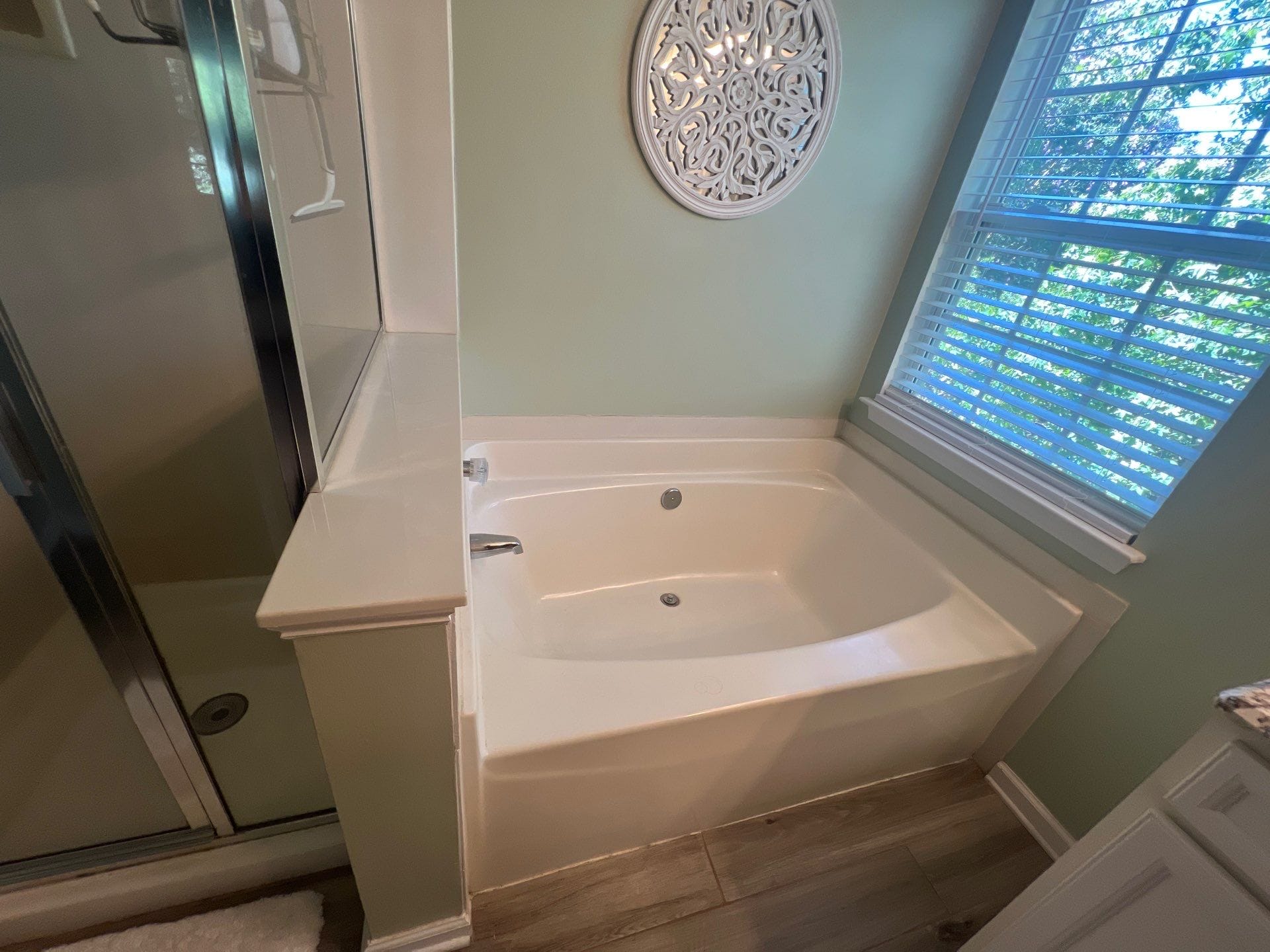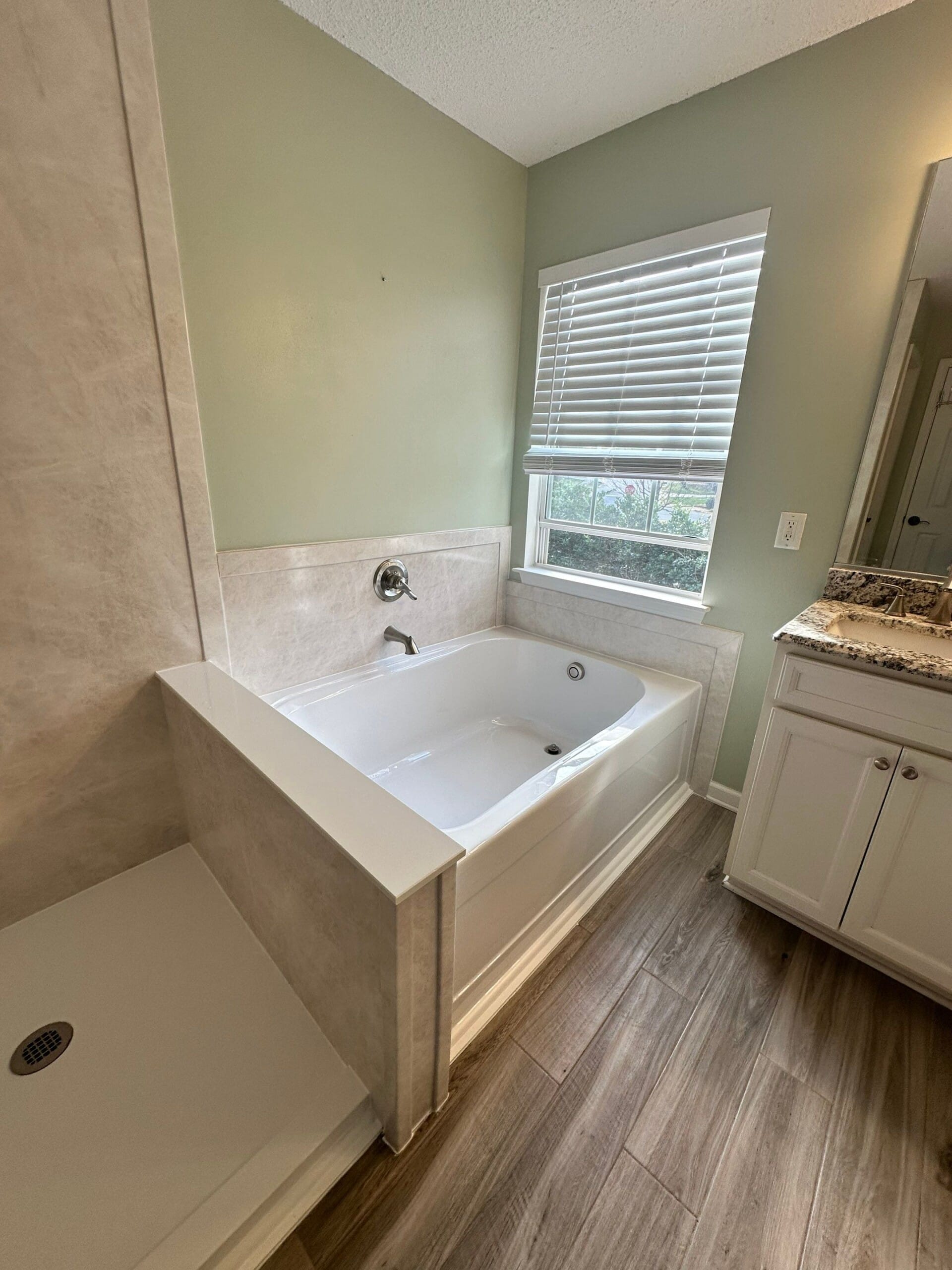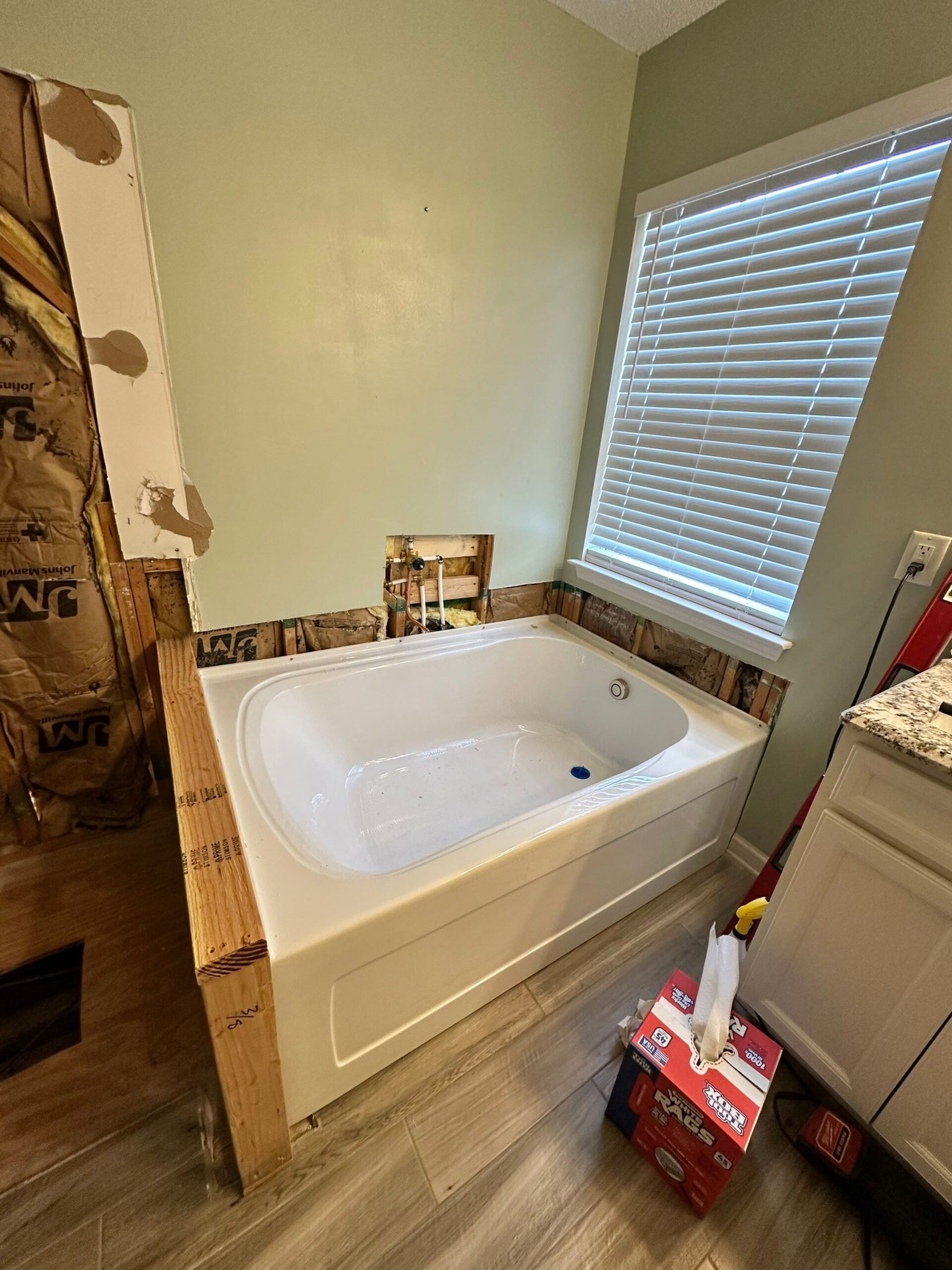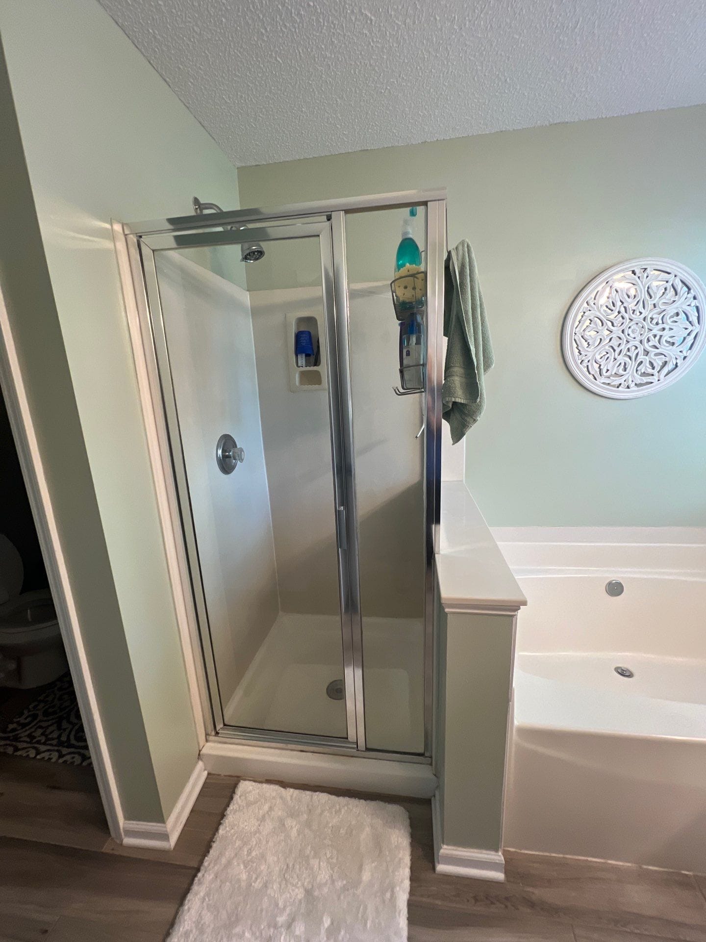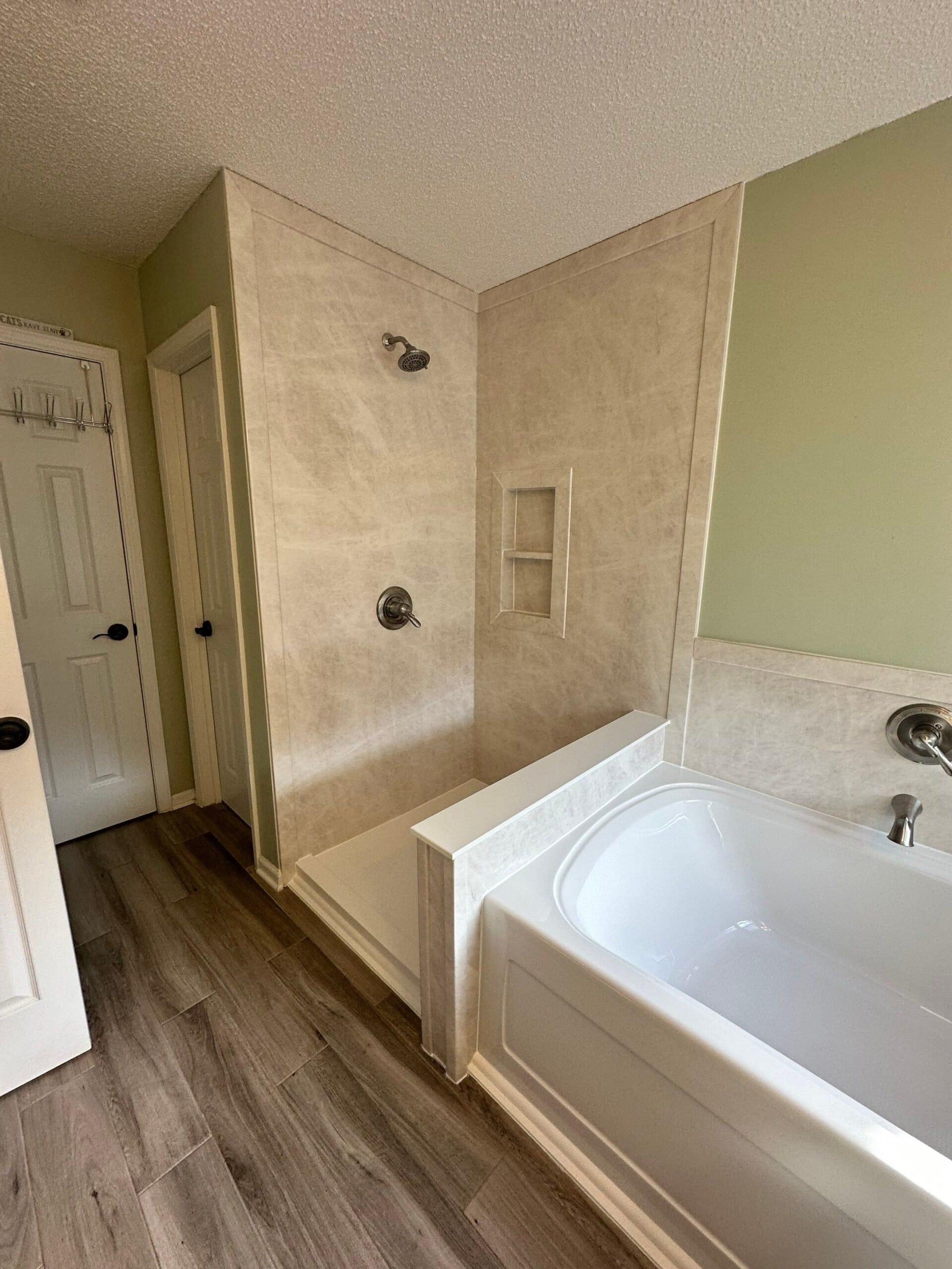 Installation began with a complete tear-out of the previous fixtures and enclosure. The wall framing was inspected and adjusted where needed, and waterproof inorganic backer boards were applied before the Smart Choice wall panels were mounted. A recessed double-shelf niche was installed between the shower valve and plumbing line, and the freestanding soaking tub was repositioned and refit with matching brushed nickel hardware. The customer's LVP flooring was laid seamlessly to integrate with the new footprint, and all fixtures were aligned to the customer’s final layout specifications. A ceiling-height finish and trim package were used for added durability and cohesion.