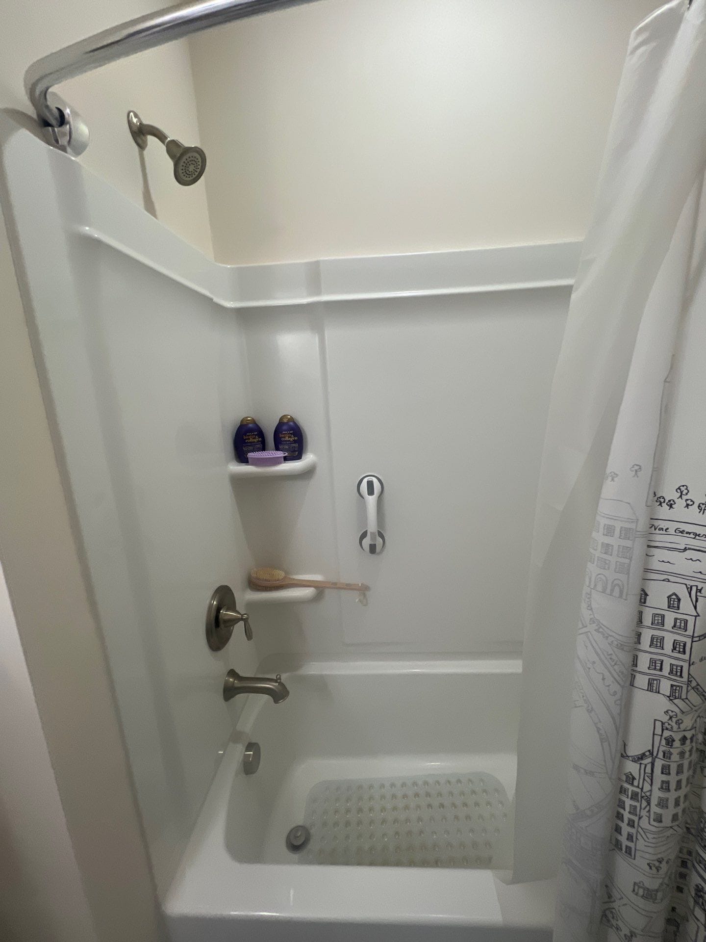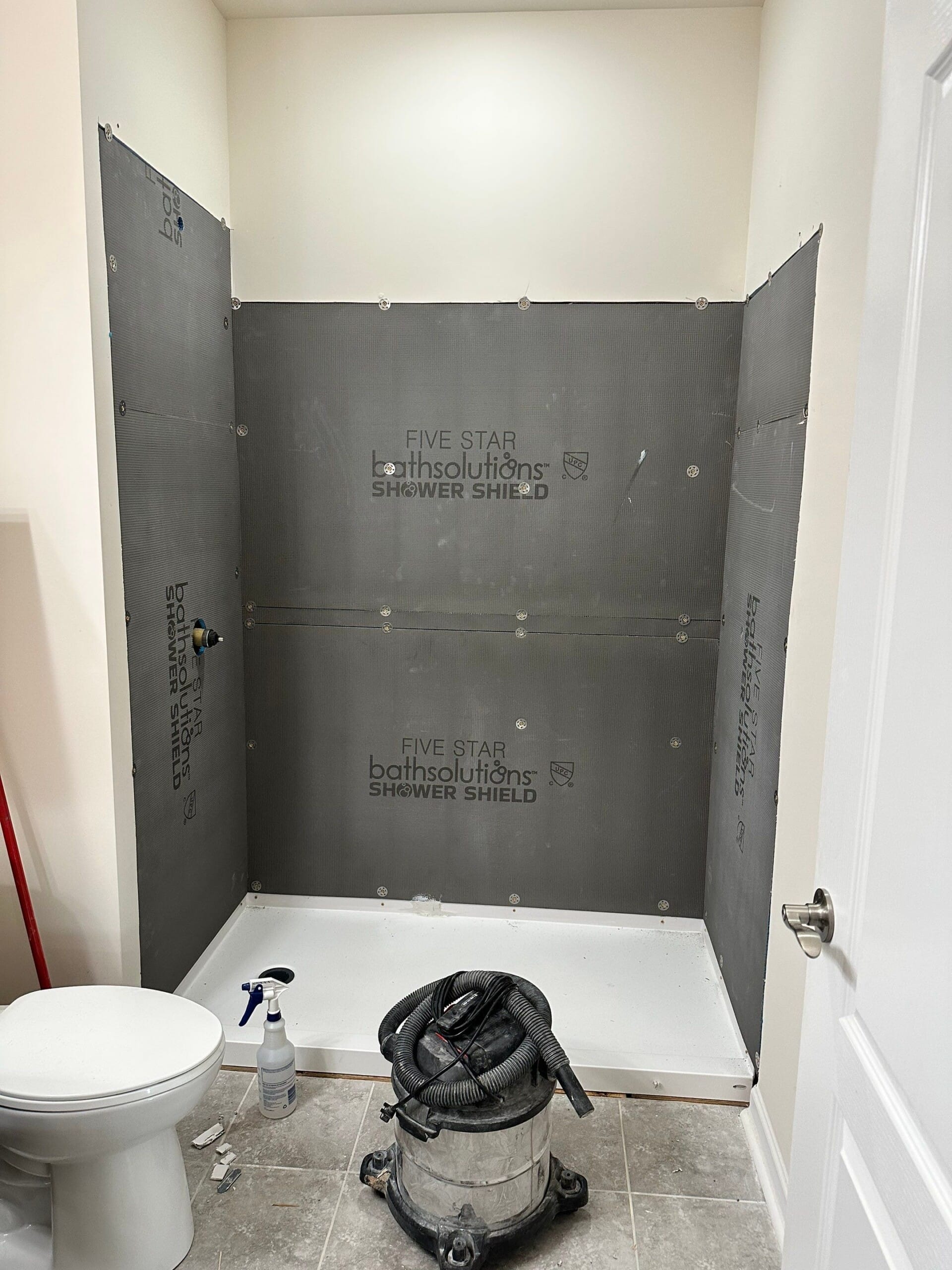 The installation process included a full removal of the existing tub and surround down to the studs, followed by plumbing updates and preparation of the space. A waterproof backer board system was installed to support the wall panels and ensure long-term durability. The new shower base, wall system, fixtures, shelving, and grab bar were installed, creating a seamless and functional layout. The project was completed efficiently with attention to site protection and cleanup, resulting in a clean and updated finished space.