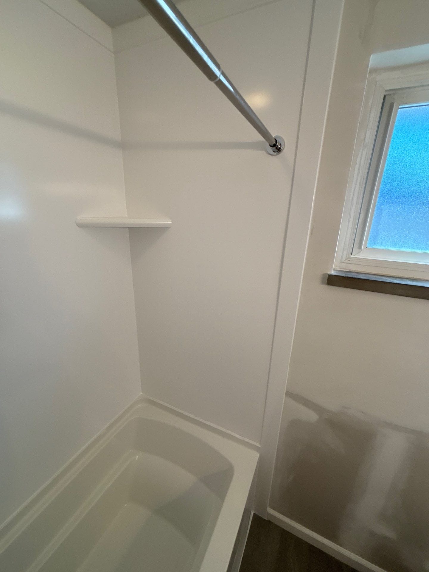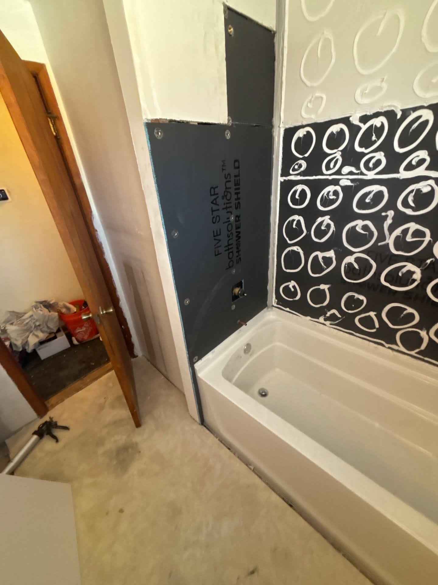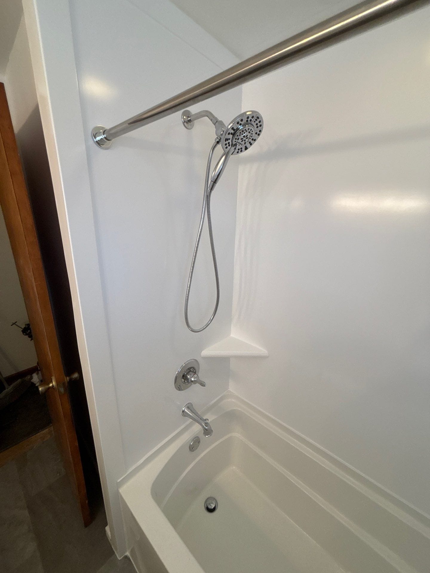 Installation included removal of the original bathtub, tile walls, and surrounding materials to prepare the space for the new system. The installation team performed a full tear-out to the framing before installing the waterproof backer system and the new composite wall panels extending to the ceiling. A new soaker tub with a smooth front apron was installed along with updated plumbing fixtures and integrated corner shelves. The shower system and curtain rod were mounted after wall installation to complete the configuration. The installation area was protected during the process and all debris was removed at completion, resulting in a refreshed bathing space with a bright and simplified design.