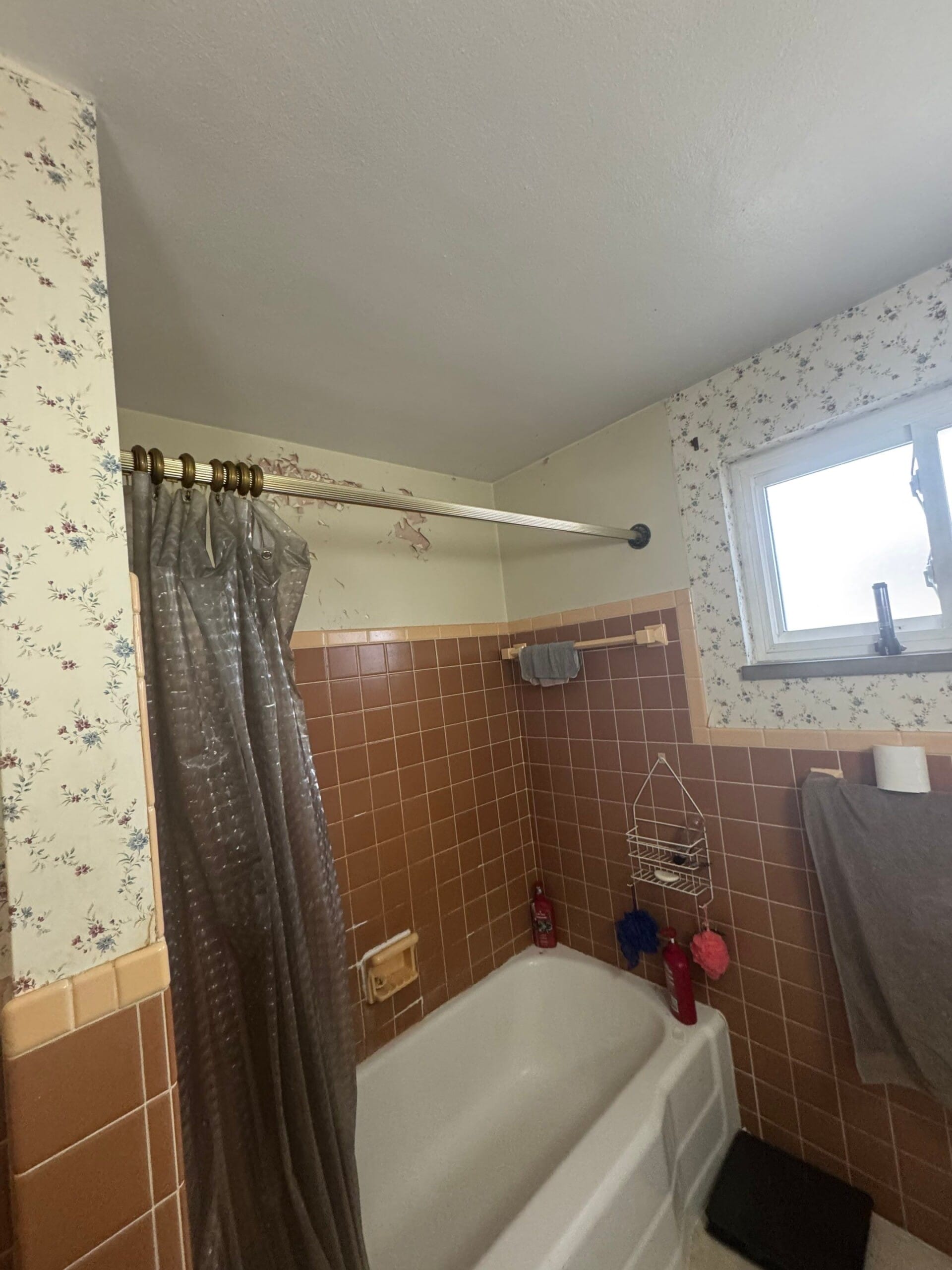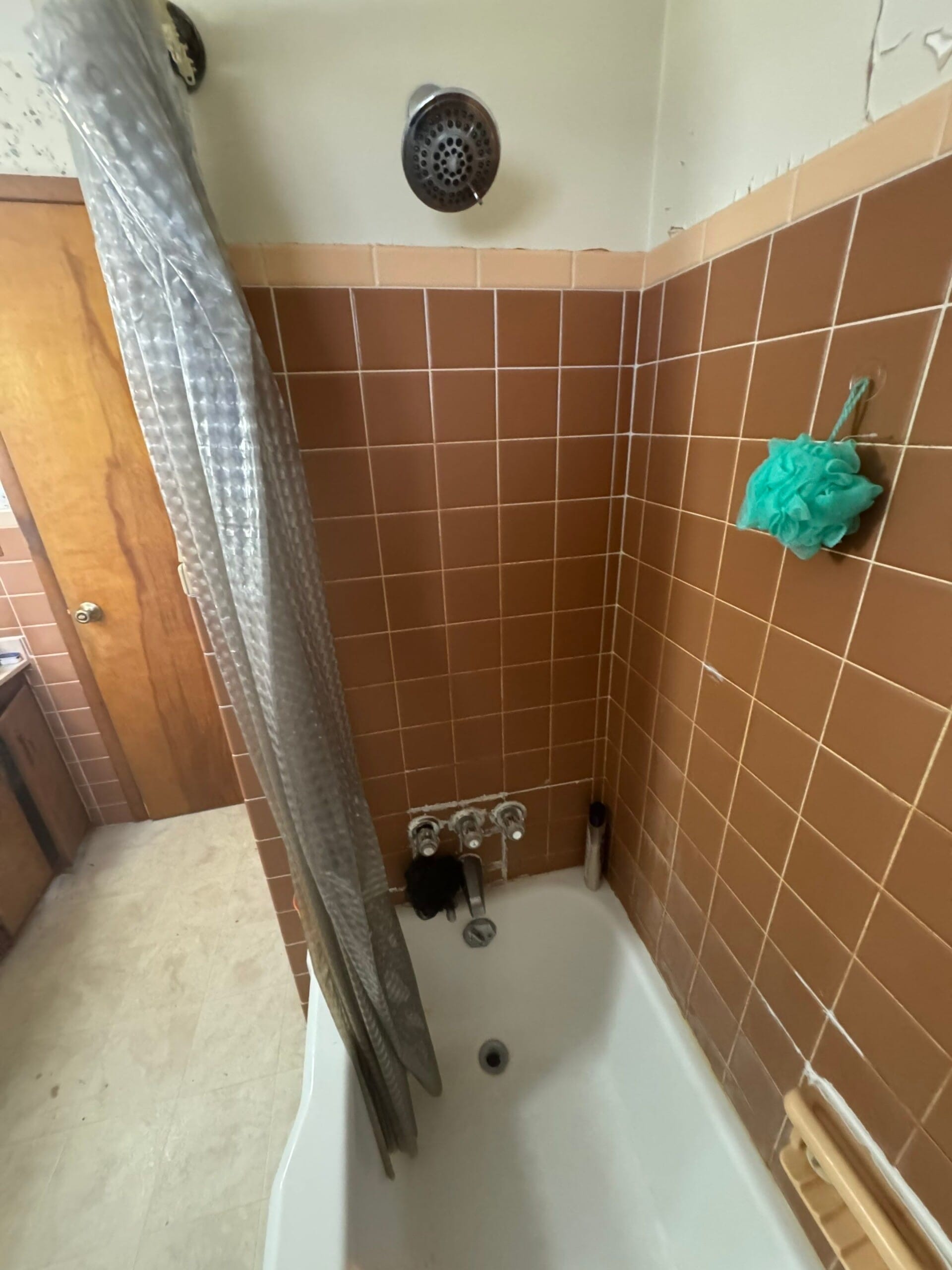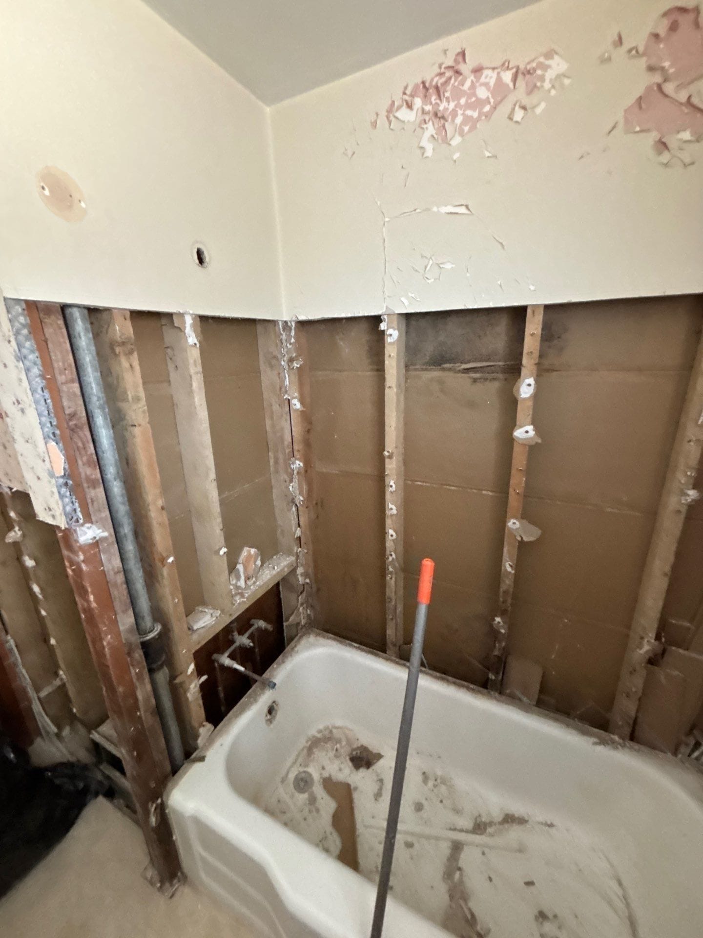 Installation included removal of the original bathtub, tile walls, and surrounding materials to prepare the space for the new system. The installation team performed a full tear-out to the framing before installing the waterproof backer system and the new composite wall panels extending to the ceiling. A new soaker tub with a smooth front apron was installed along with updated plumbing fixtures and integrated corner shelves. The shower system and curtain rod were mounted after wall installation to complete the configuration. The installation area was protected during the process and all debris was removed at completion, resulting in a refreshed bathing space with a bright and simplified design.