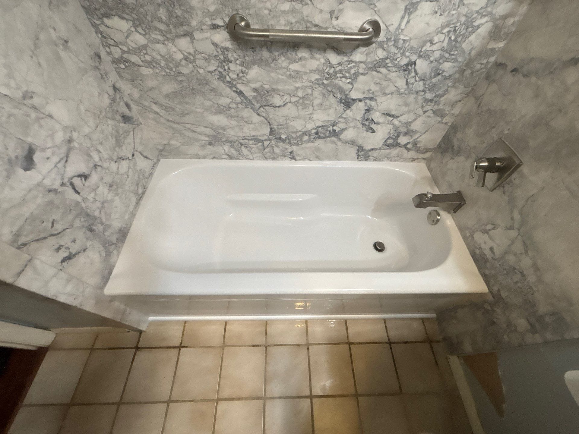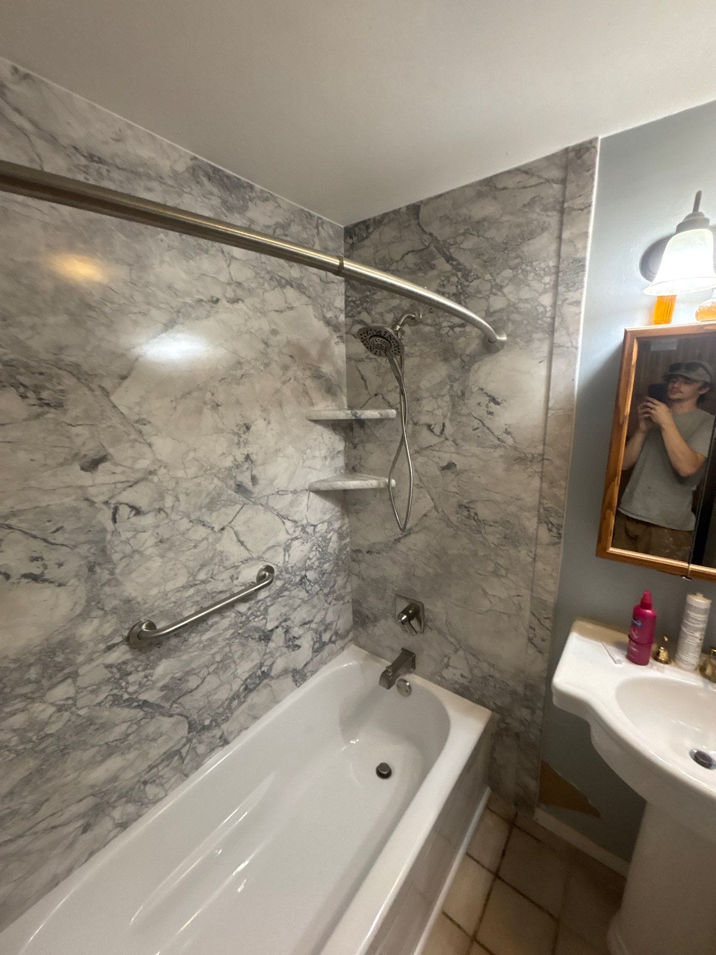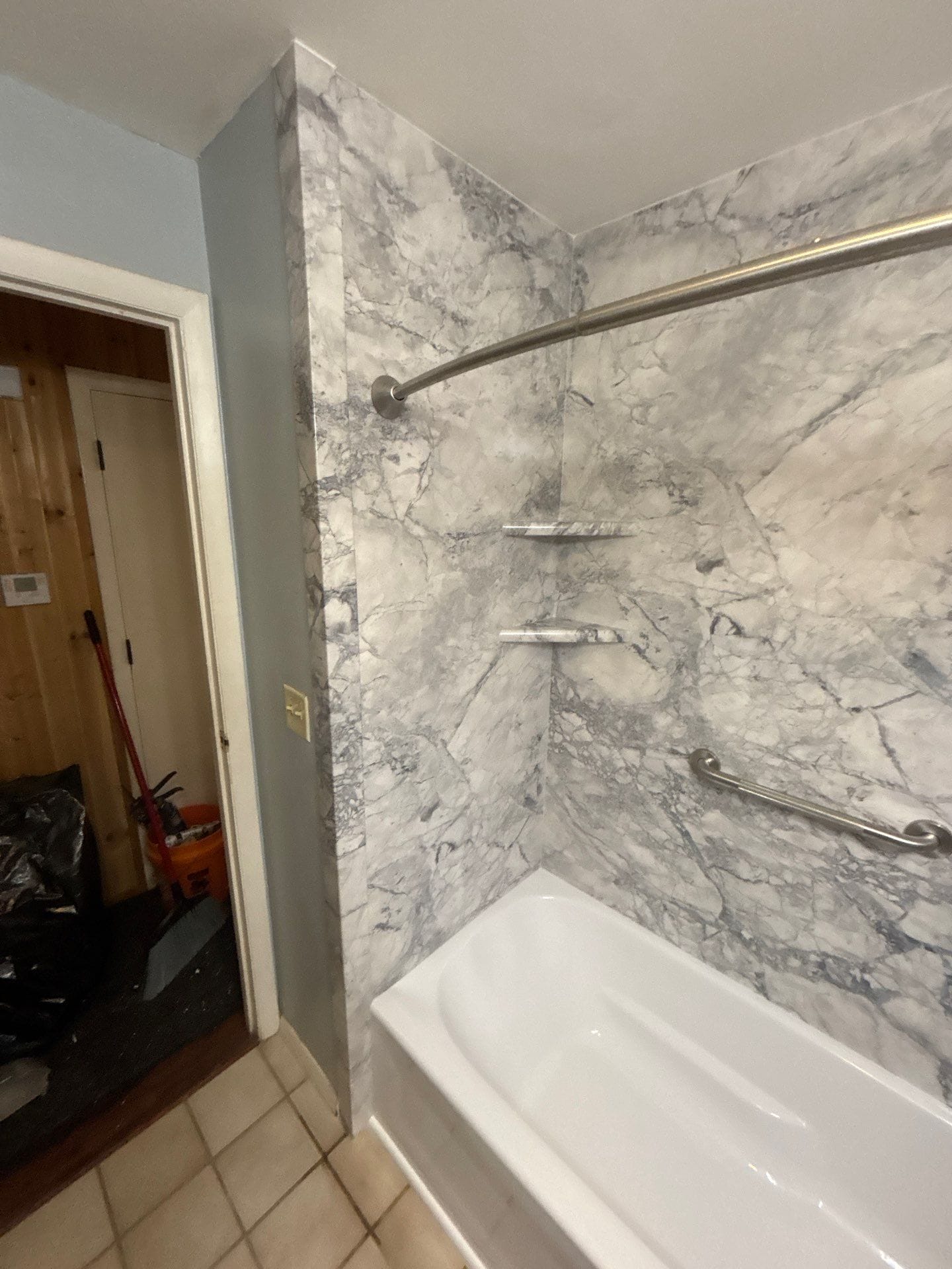 Installation involved removal of the existing bathtub and surrounding wall materials to prepare the structure for the new system. The installation team completed a full tear-out to the framing before installing the waterproof backer system and composite wall panels extending to the ceiling. A new soaker tub with a smooth front apron was installed along with updated plumbing fixtures and reinforced corner shelving for storage. A curved curtain rod was mounted to provide additional interior space while maintaining easy access to the bathing area. The installation area was protected during the process and all materials and debris were removed upon completion, resulting in a refreshed and functional bathing space.