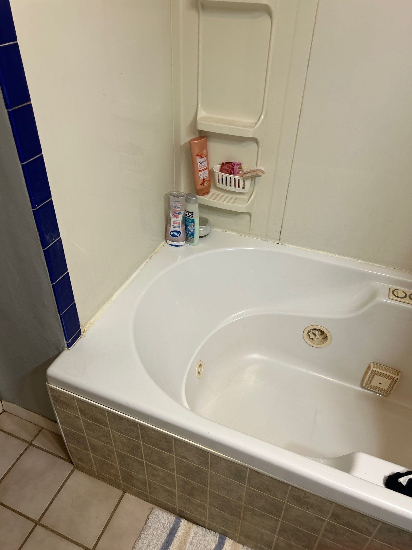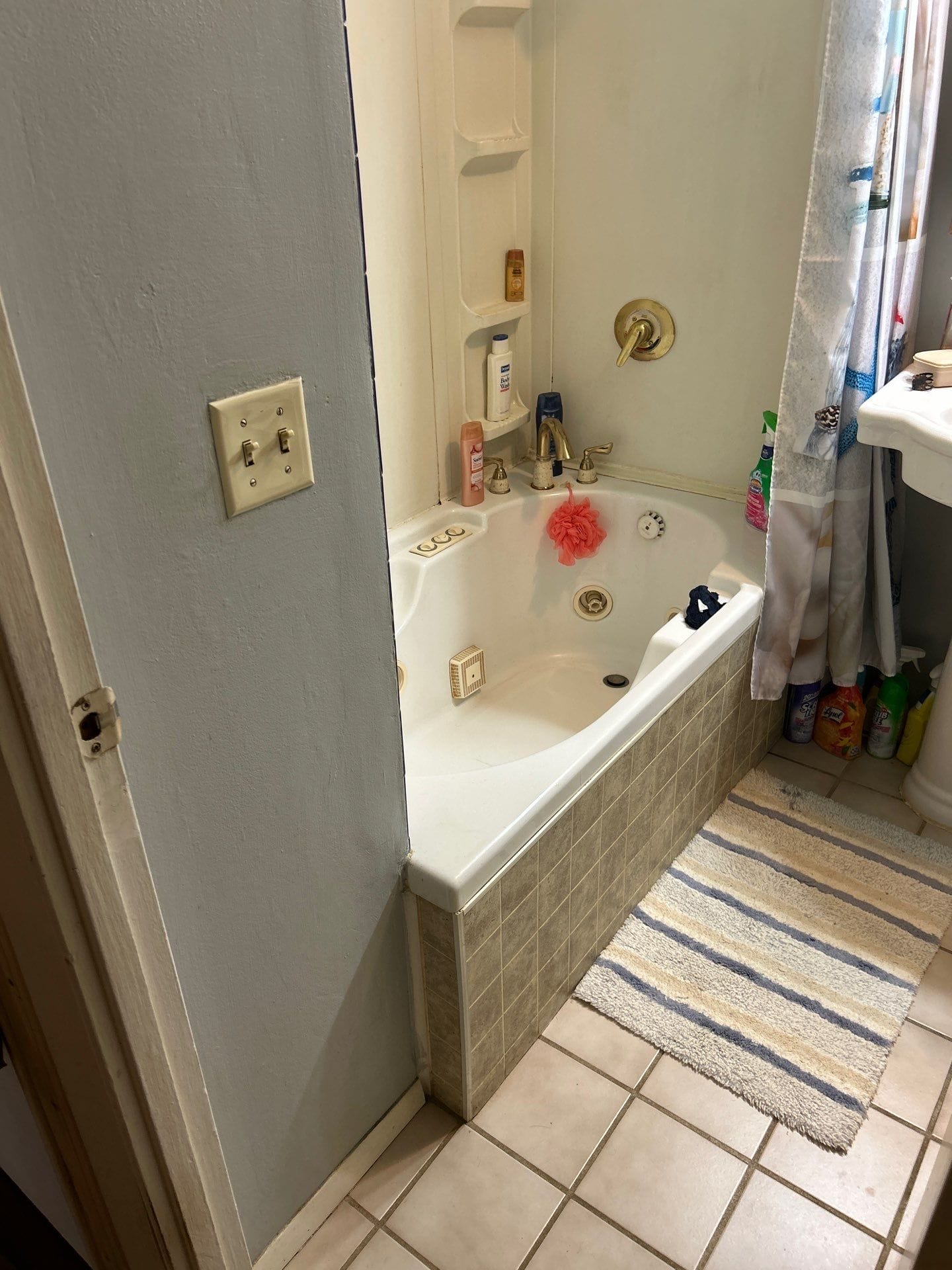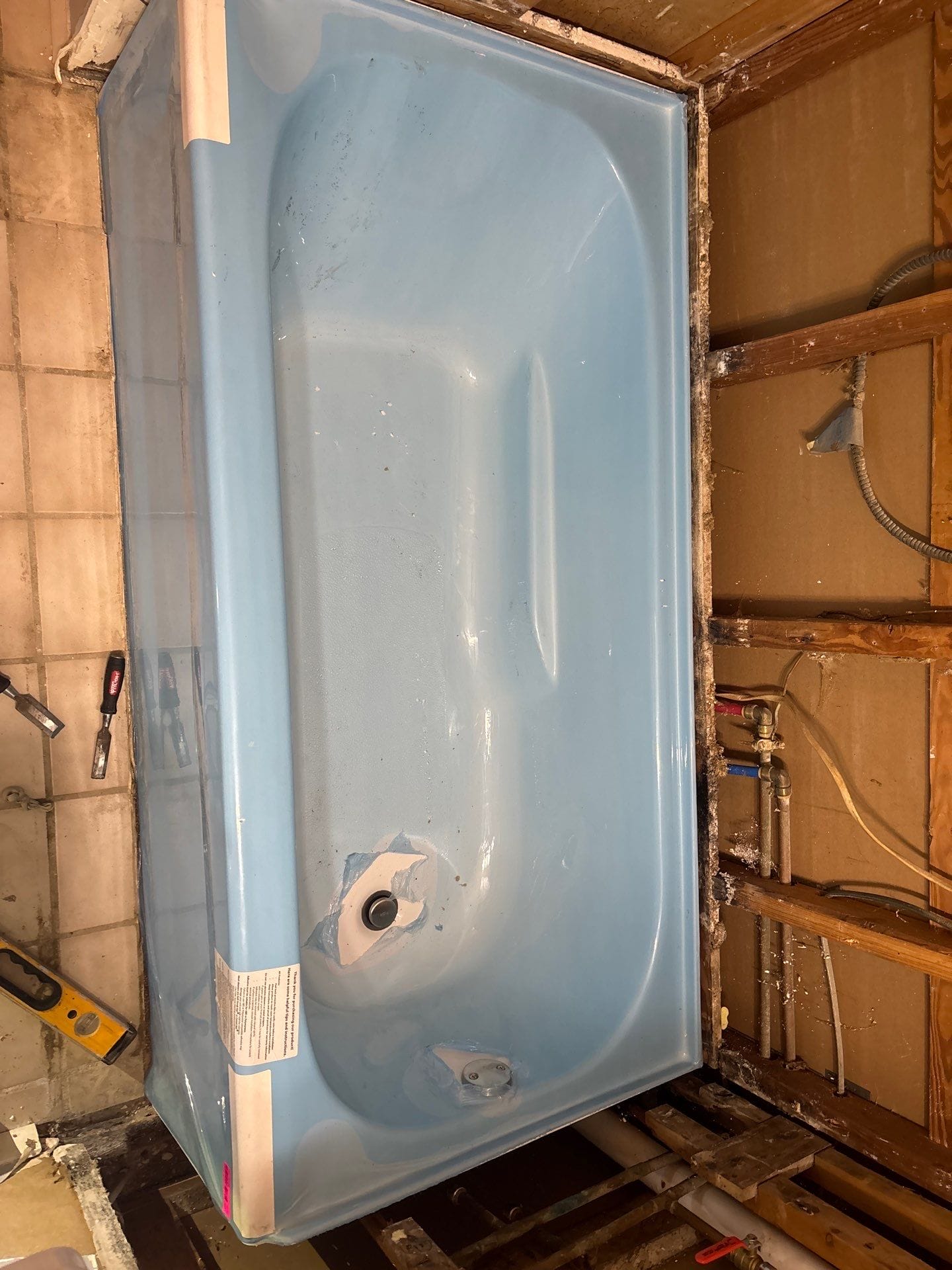 Installation involved removal of the existing bathtub and surrounding wall materials to prepare the structure for the new system. The installation team completed a full tear-out to the framing before installing the waterproof backer system and composite wall panels extending to the ceiling. A new soaker tub with a smooth front apron was installed along with updated plumbing fixtures and reinforced corner shelving for storage. A curved curtain rod was mounted to provide additional interior space while maintaining easy access to the bathing area. The installation area was protected during the process and all materials and debris were removed upon completion, resulting in a refreshed and functional bathing space.