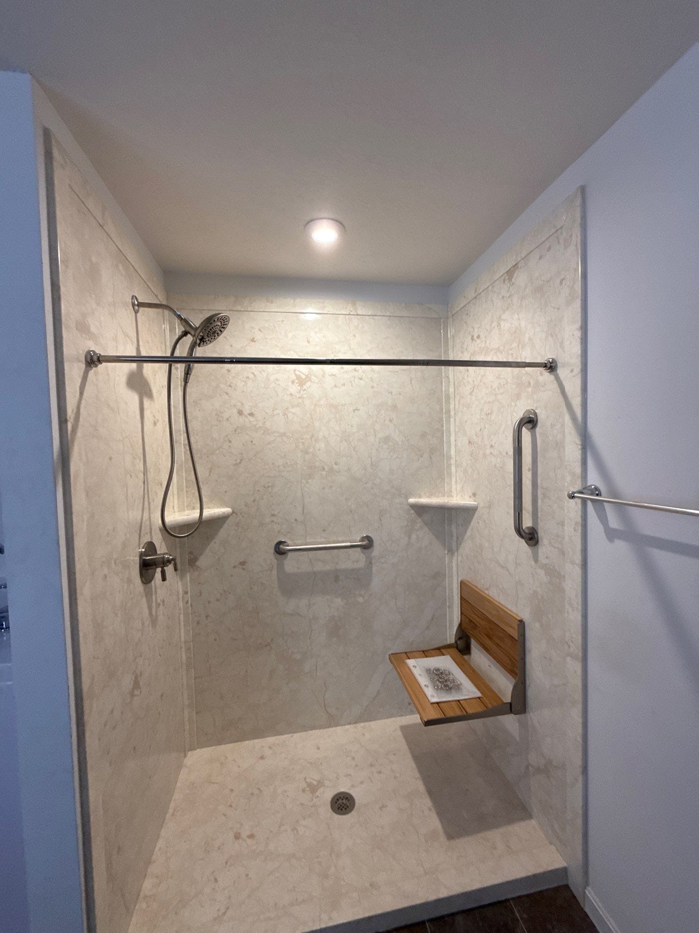 Installation involved full demolition of the existing old shower and tile down to the framing, followed by inspection and preparation of the area for a new waterproof system. Reinforced backing was installed to support grab bars and the fold-down bench, and updated plumbing was completed prior to setting the new low-threshold shower base. Wall panels were precisely fitted and sealed to create a watertight enclosure, and all fixtures were installed according to the finalized layout. The project maintained the existing footprint while significantly improving accessibility and usability.