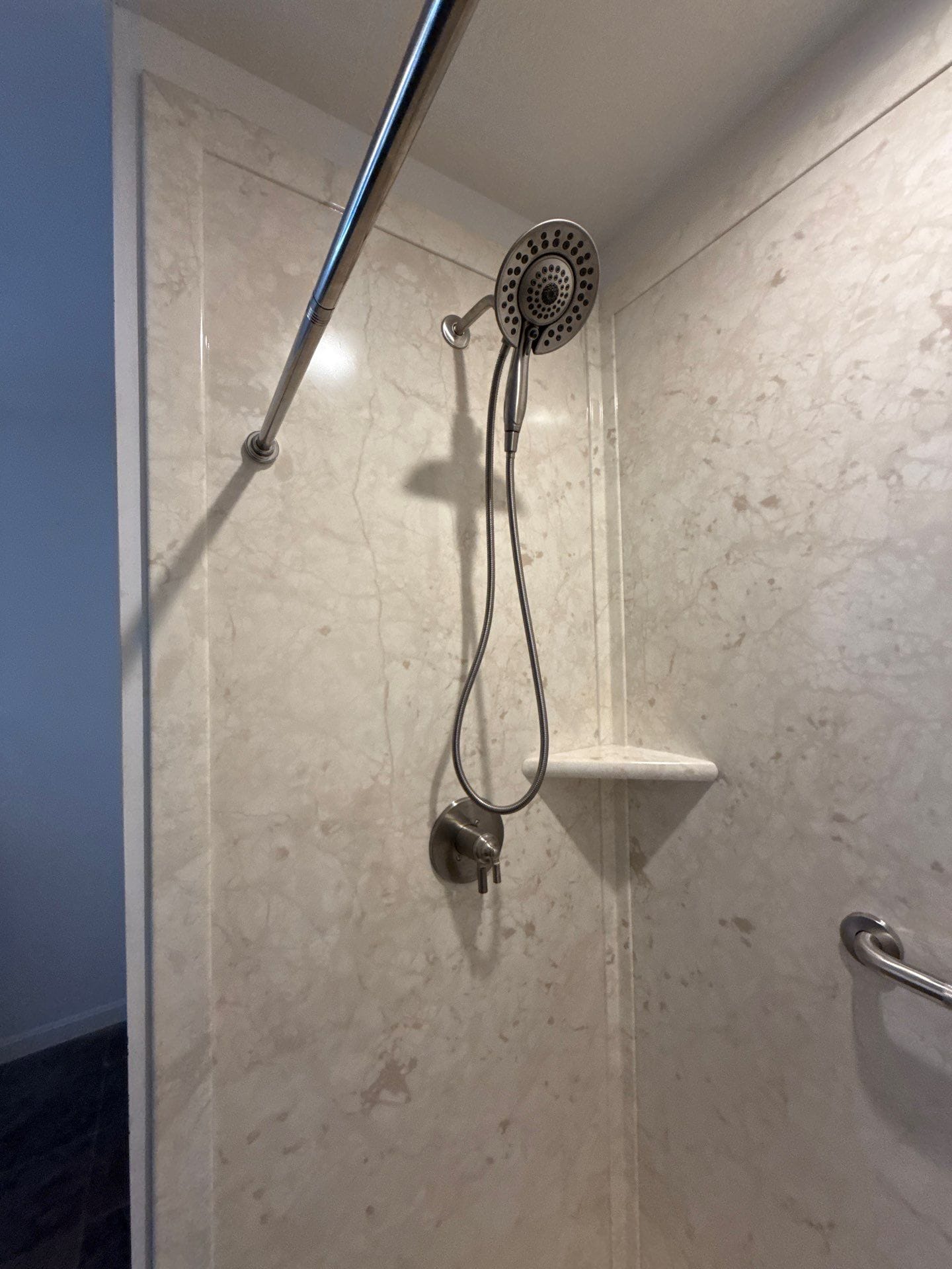 The Five Star Bath Solutions representative presented a grout-free composite wall system designed to replicate the look of natural stone while eliminating the upkeep of tile and grout. The installed walk-in shower features large-format stone-look panels in a light neutral tone, creating a brighter and more open feel compared to the previous dark tile. Chrome fixtures were installed, including a handheld shower system with adjustable positioning, along with multiple grab bars for support. A fold-down bench provides secure seating while maintaining open floor space, and integrated corner shelving offers accessible storage without cluttering the design.