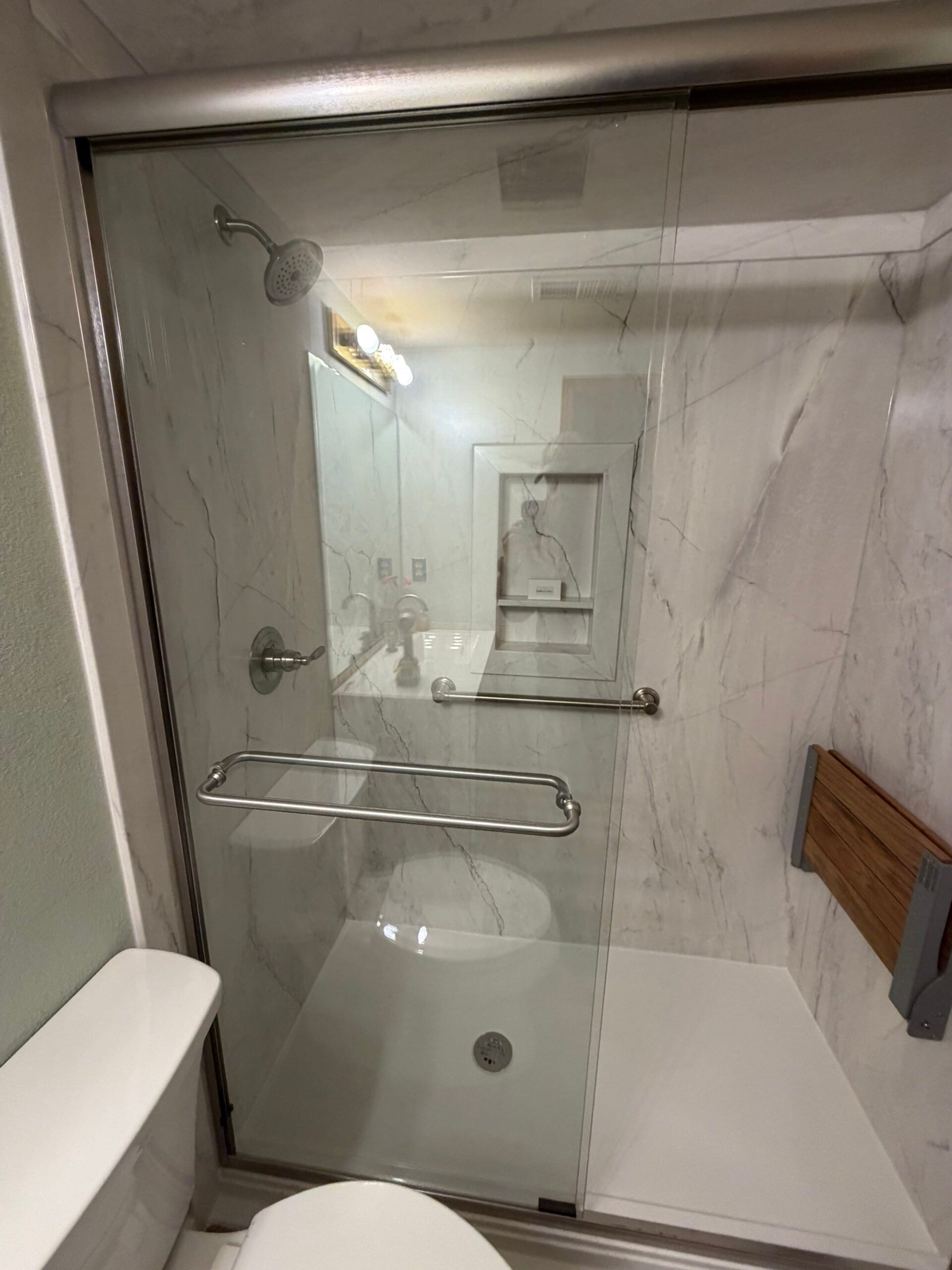 The Representative presented a grout-free wall system featuring antimicrobial and anti-scratch properties to ensure a long-lasting, hygienic surface. This installation utilizes a proprietary waterproof backer board with a non-organic core to provide a completely watertight foundation. The selection of marble-patterned wall panels paired with brushed nickel fixtures offers a high-end look without the intensive upkeep of traditional tile. The company’s specialized focus on moisture-proof materials and customized design consultations establishes a high level of trust and authority in bathroom remodeling.