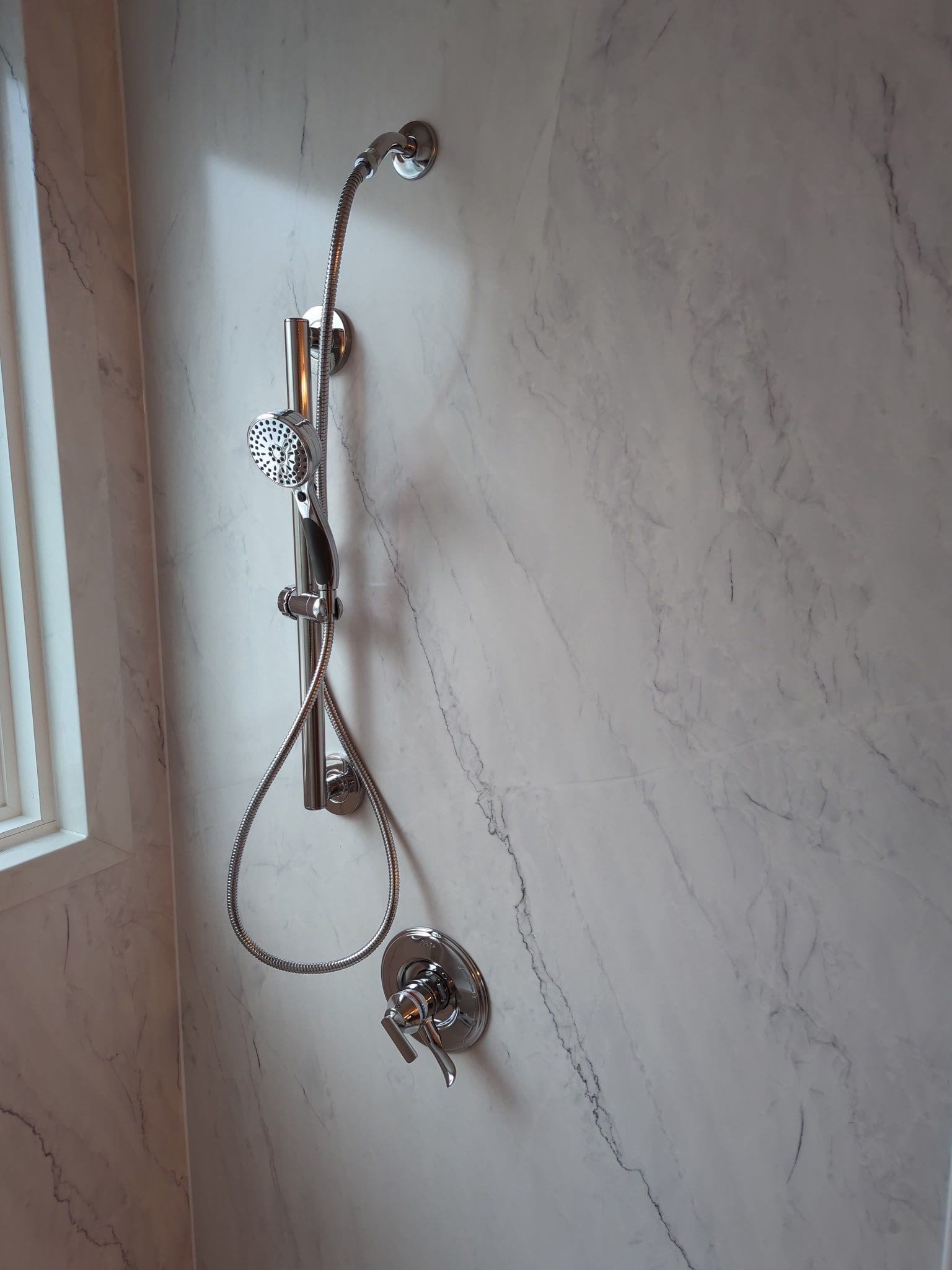 The Representative presented the Five Star Bath Solutions Smart Choice composite wall system designed specifically for walk-in shower renovations. The wall system provides a non-porous, antimicrobial surface that eliminates grout maintenance and supports long-term durability. The selected wall pattern features a smooth simulated tile appearance with subtle gray veining, creating a clean stone-inspired finish. Brushed nickel Delta plumbing fixtures were selected to complement the modern design, including a handheld shower system with adjustable spray functions mounted on a vertical slide bar. The Representative explained that the company focuses exclusively on bathroom remodeling and installs high-performance materials engineered for moisture resistance and easy maintenance.