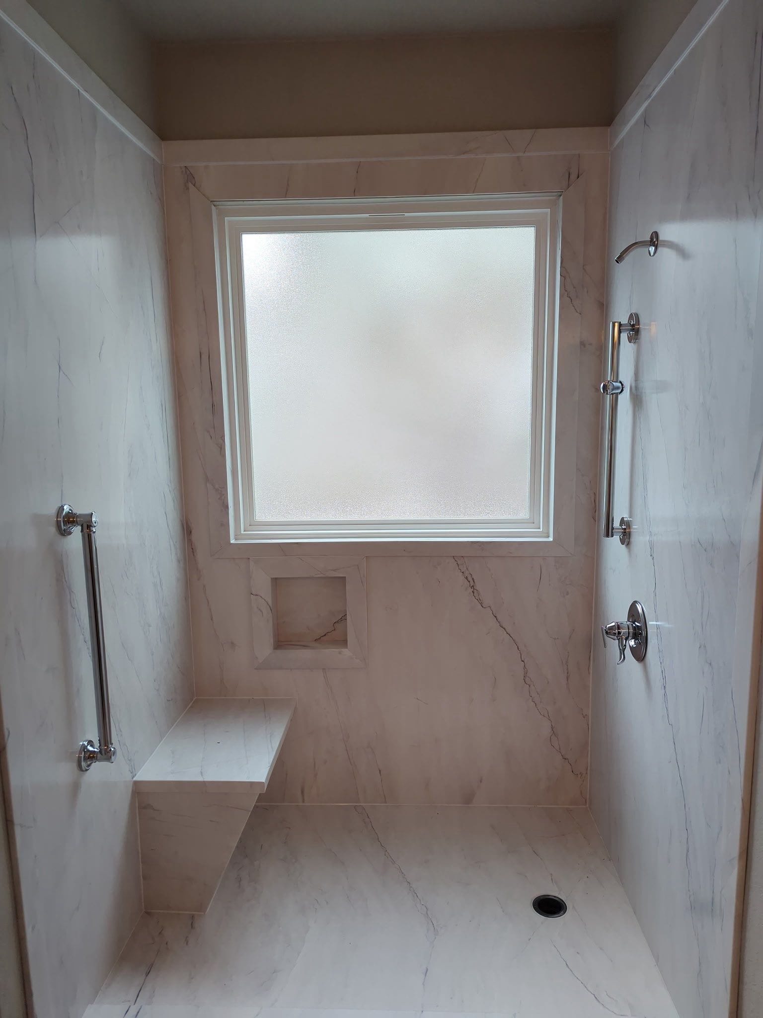 The installation process began with complete demolition of the existing shower system down to the wall framing to ensure proper inspection and rebuilding. Plumbing connections and drain placement were updated before installation of the new low-threshold walk-in shower base with integrated anti-slip surface. Waterproof backer systems were installed prior to mounting the composite wall panels. A frosted window was carefully trimmed and integrated into the new wall system to maintain natural light within the shower space. Additional comfort features such as a built-in bench seat, recessed storage niche, corner shelving, and safety grab bars were installed before the final placement of the frameless glass enclosure and polished hardware.