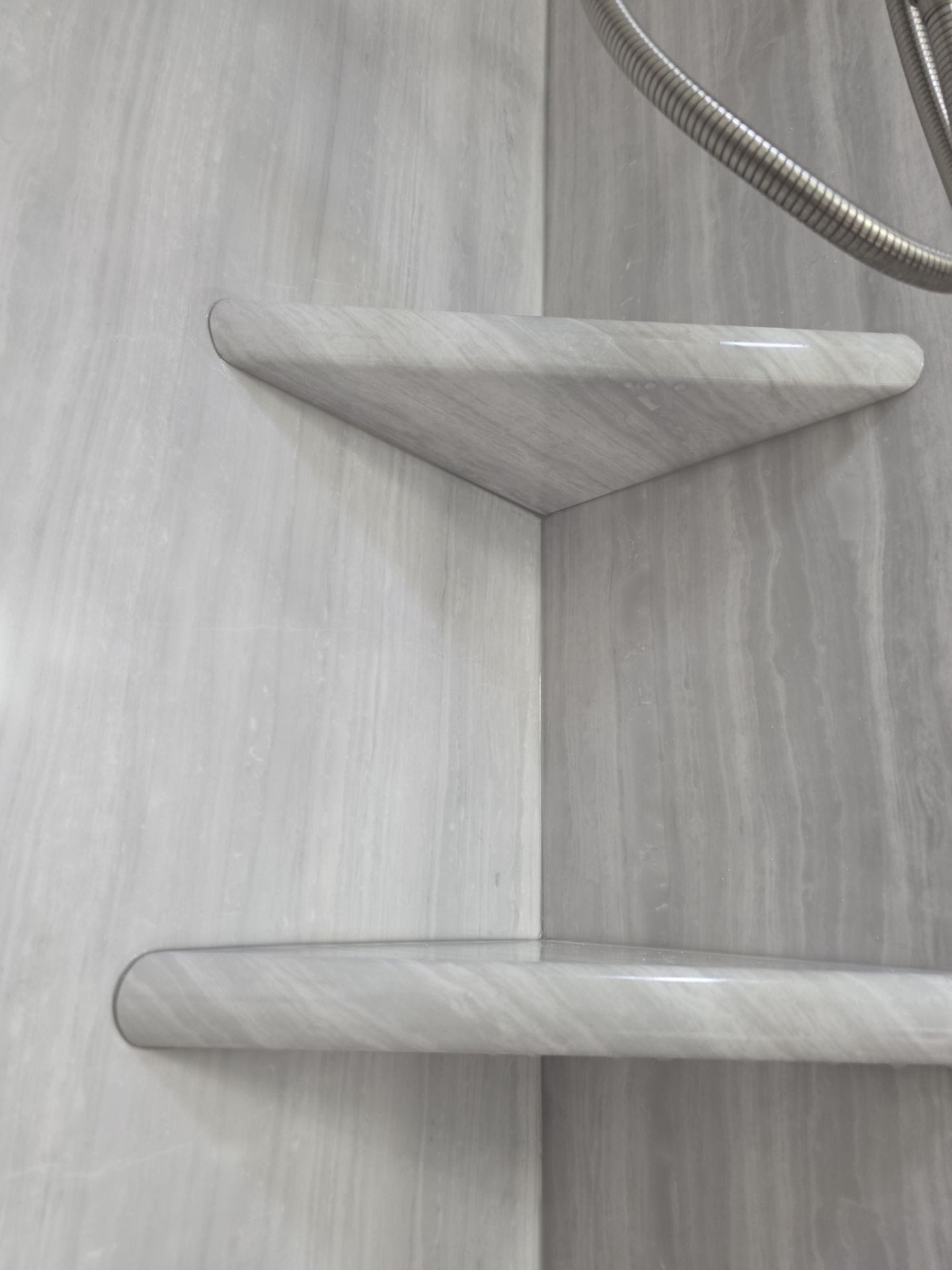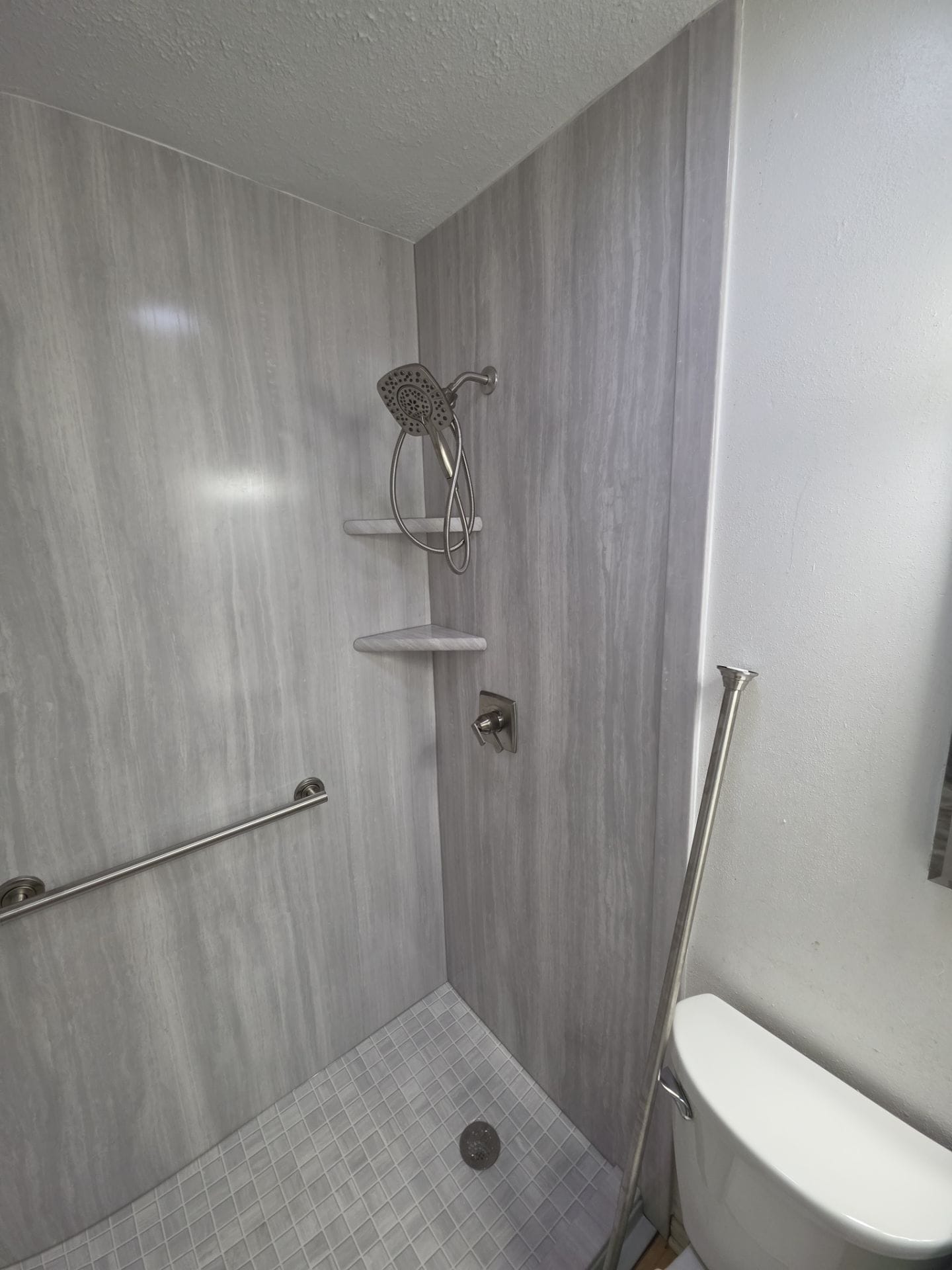 The Five Star Bath Solutions Representative presented a grout-free composite wall system designed to deliver a modern stone appearance while eliminating grout maintenance. A light gray stone-look wall finish was selected to create a clean, contemporary look within the compact bathroom space. Brushed nickel fixtures were included to complement the wall finish and provide reliable performance. Integrated corner shelving provided convenient storage for bathing products, and safety features were incorporated through a horizontal grab bar for added support while using the shower.